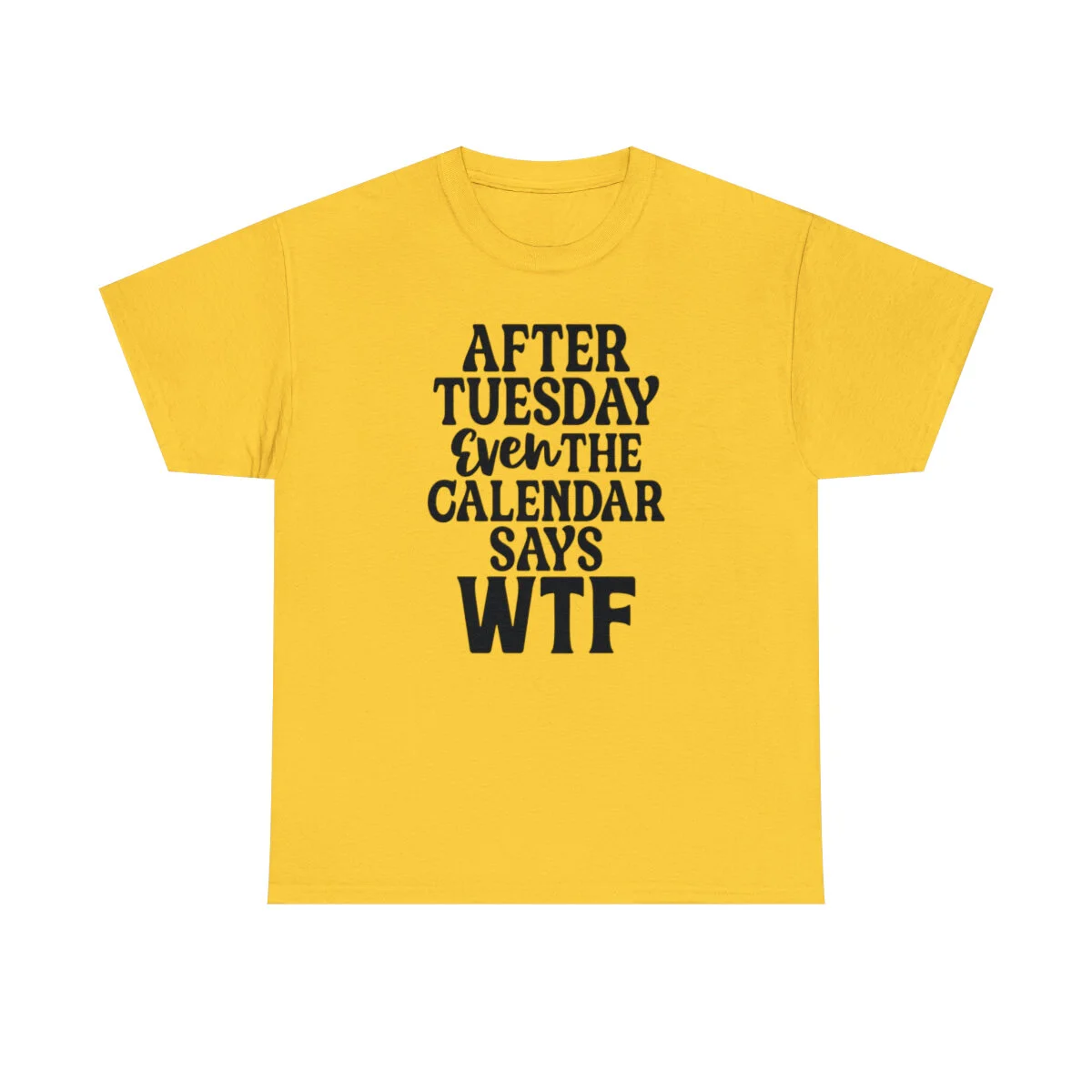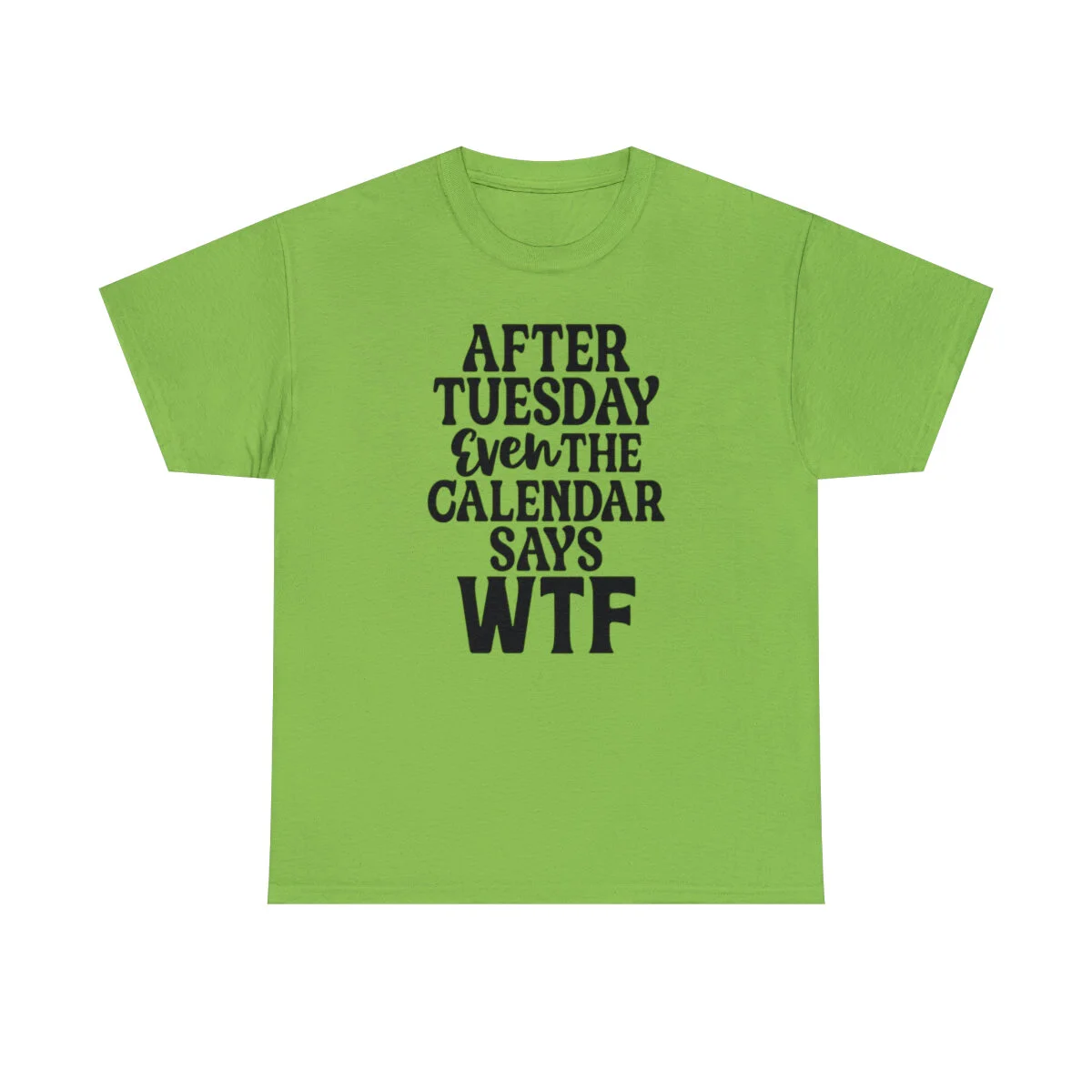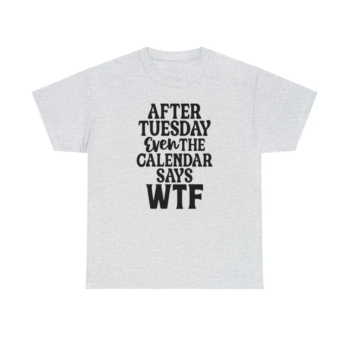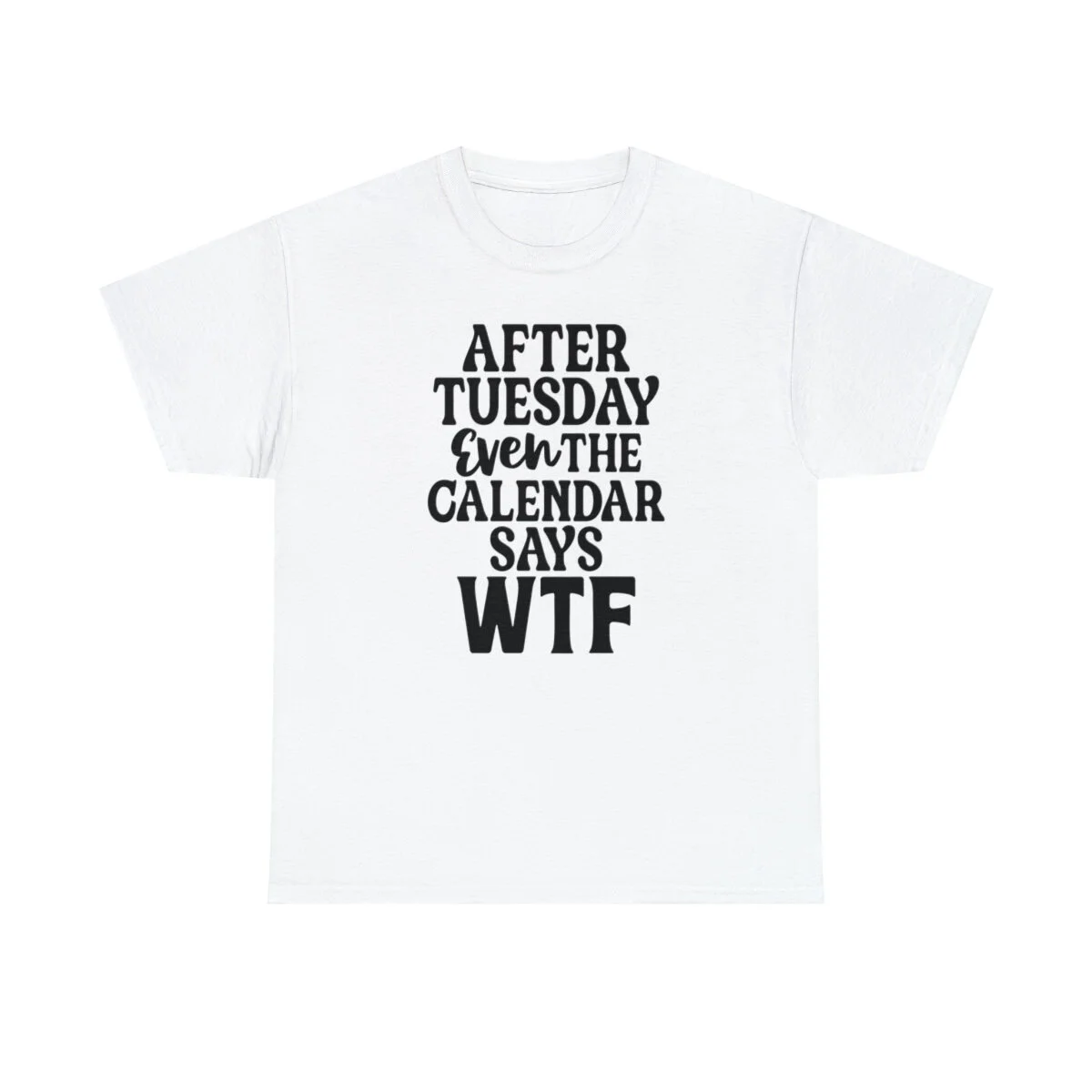 Add a dose of humor to your wardrobe with our witty t-shirt that humorously declares, "After Tuesday, even the calendar says WTF..." With this design, you can showcase your playful side while acknowledging the universal feeling of confusion and bewilderment that sometimes accompanies the midweek slump.