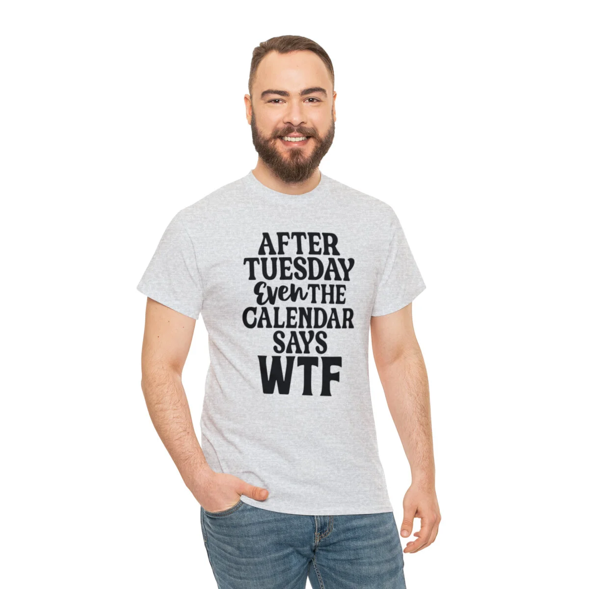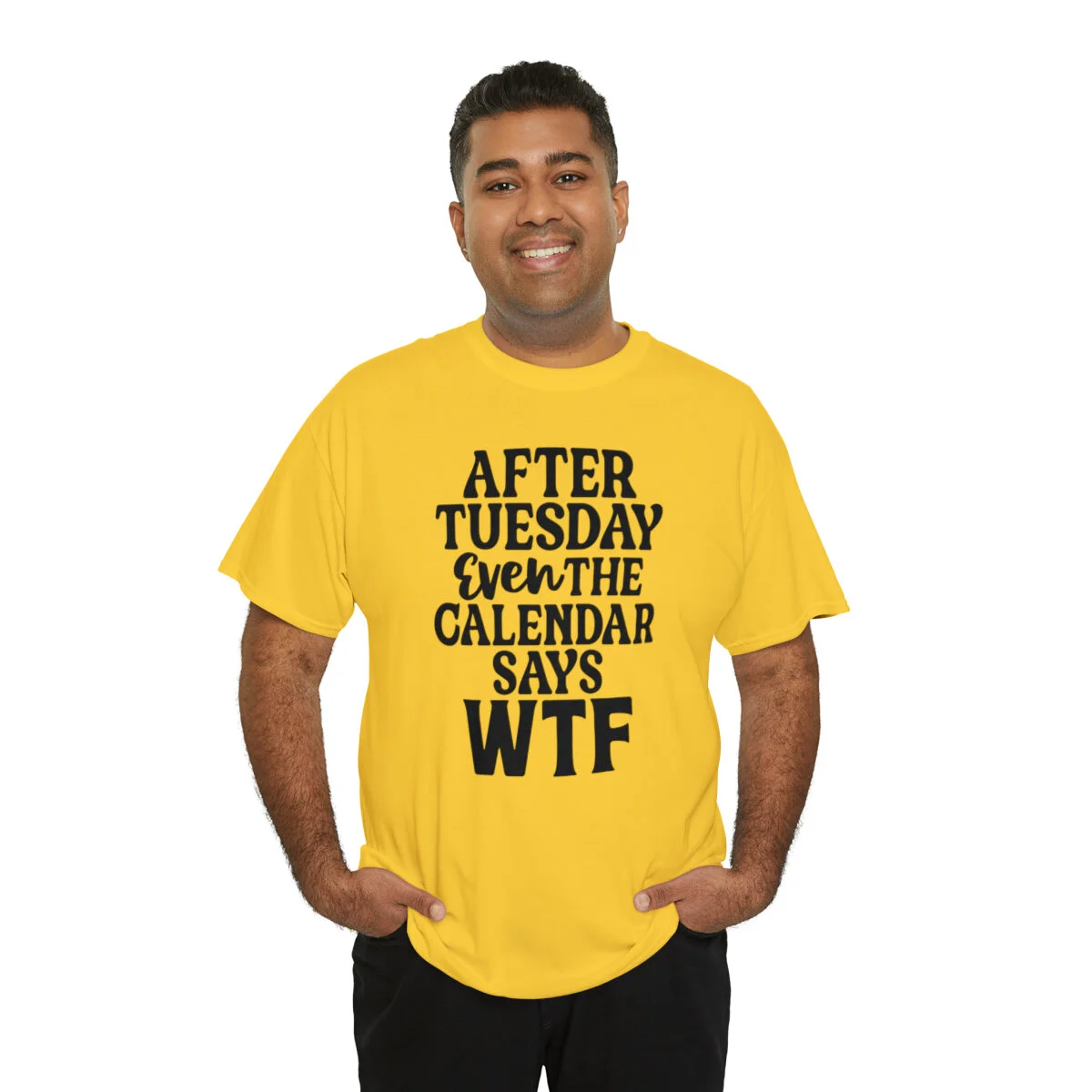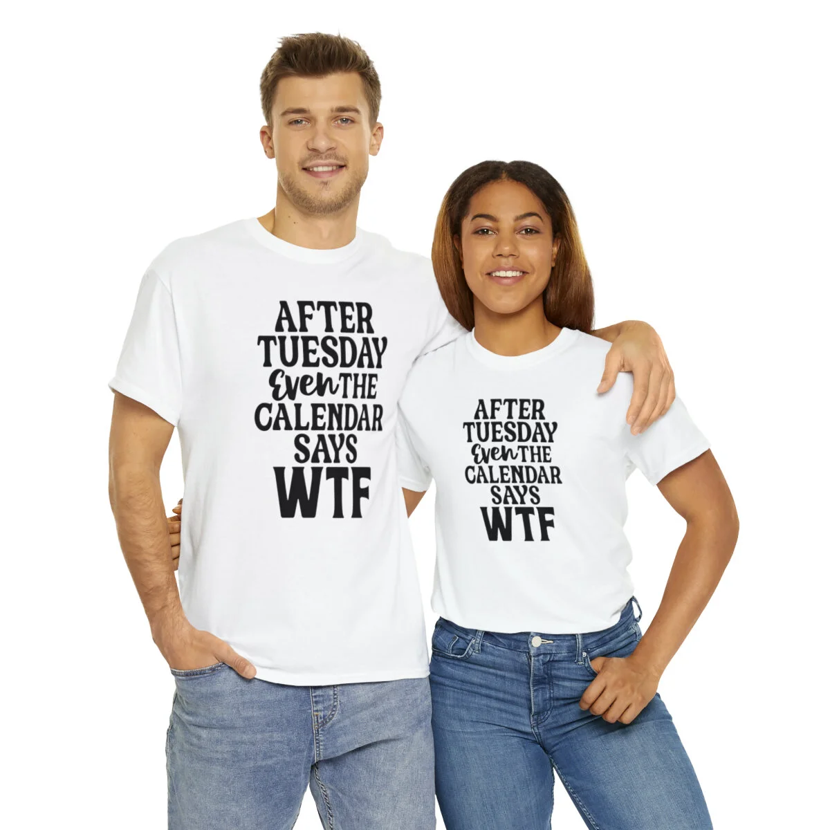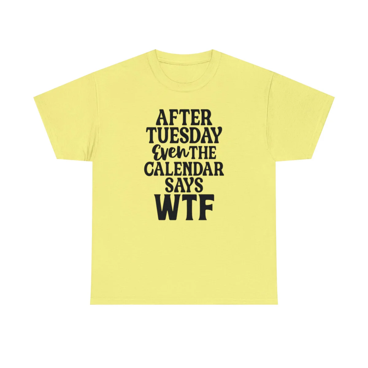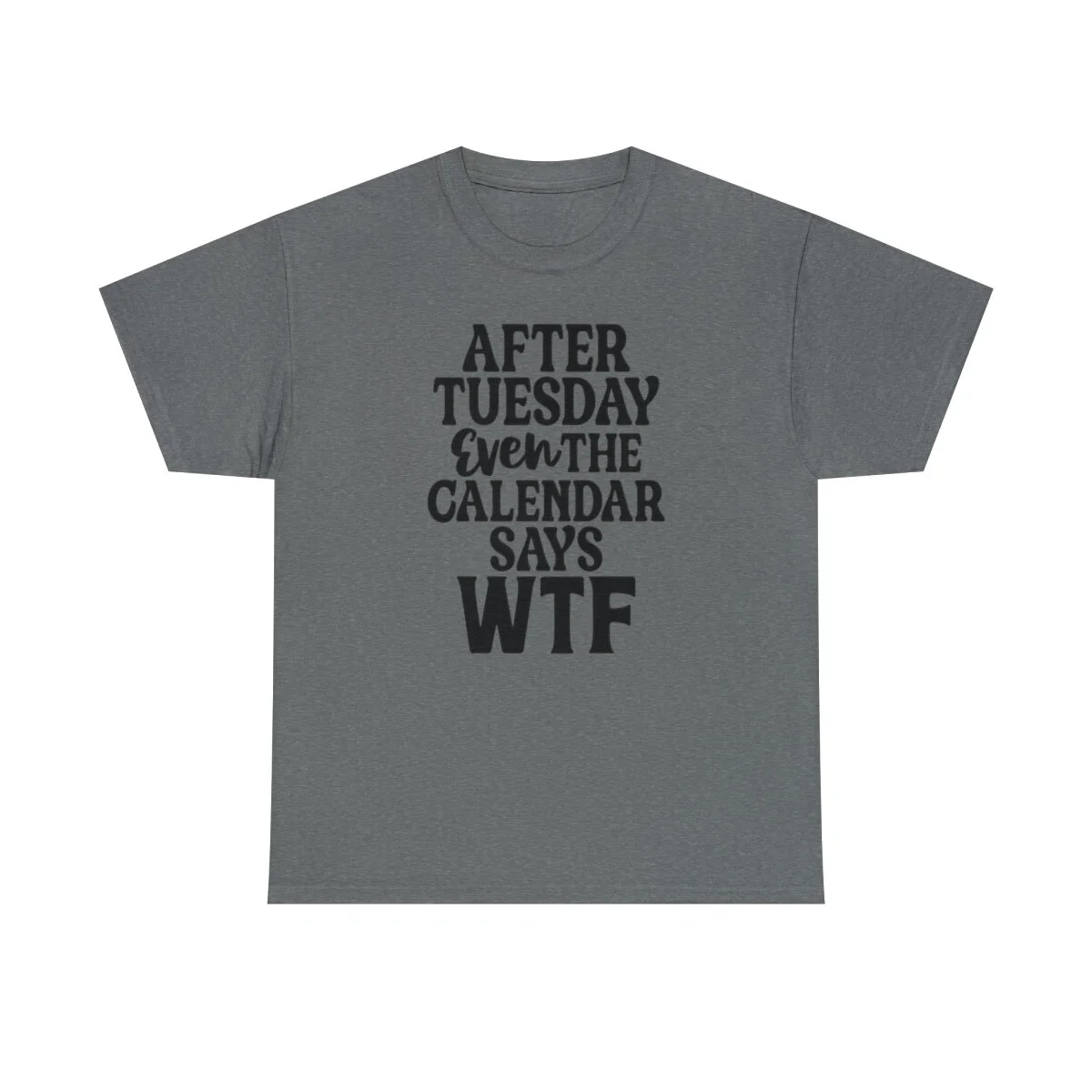 Add a dose of humor to your wardrobe with our witty t-shirt that humorously declares, "After Tuesday, even the calendar says WTF..." With this design, you can showcase your playful side while acknowledging the universal feeling of confusion and bewilderment that sometimes accompanies the midweek slump.