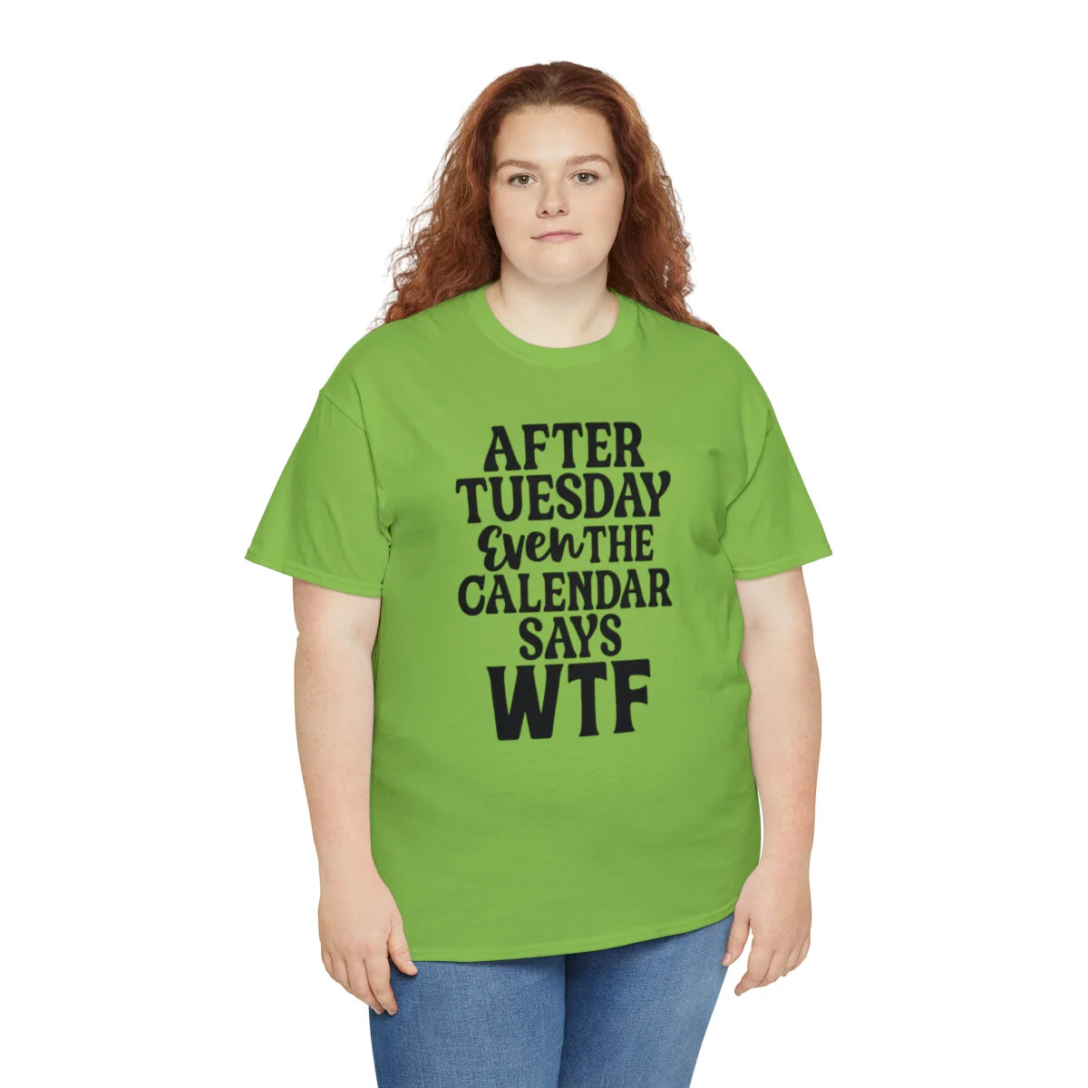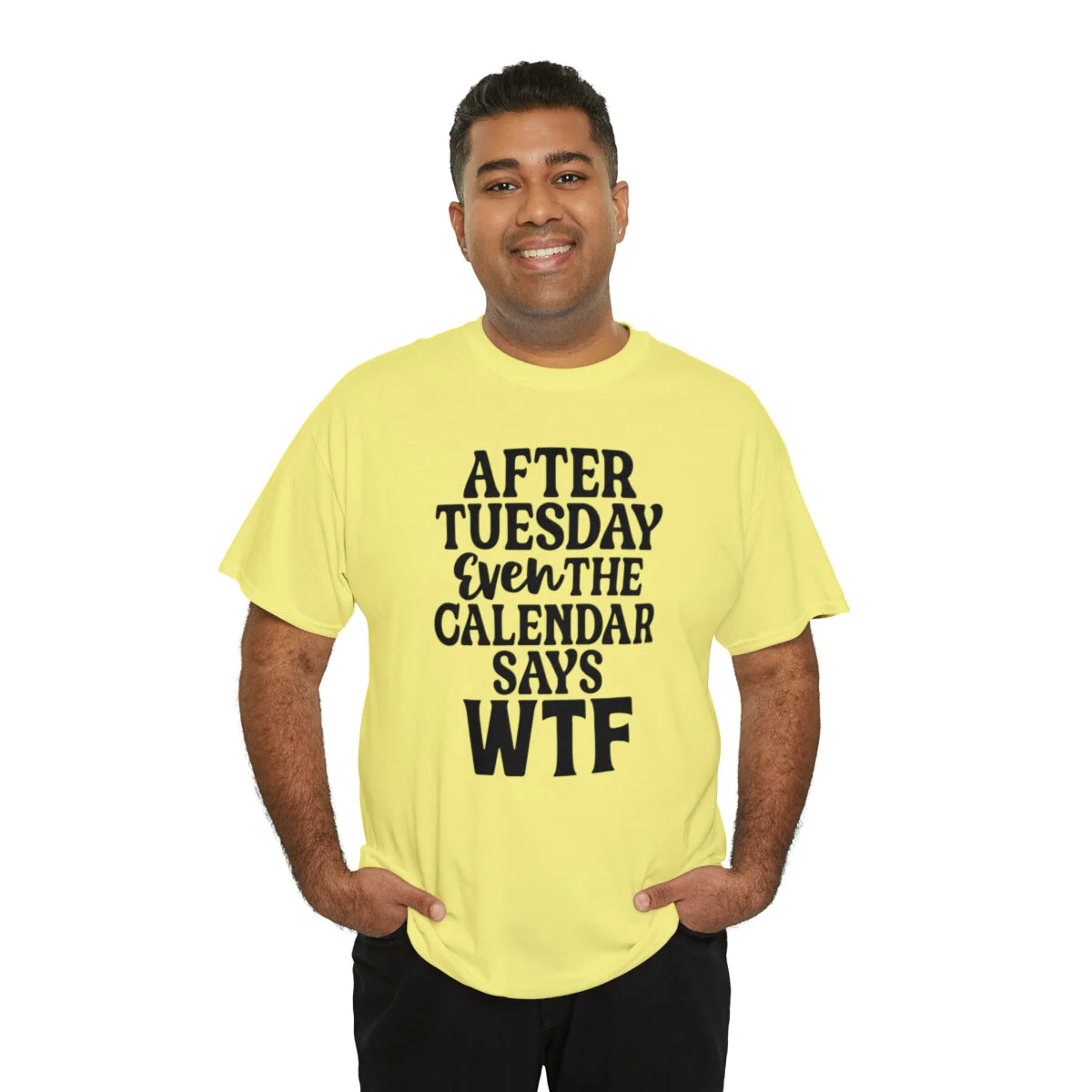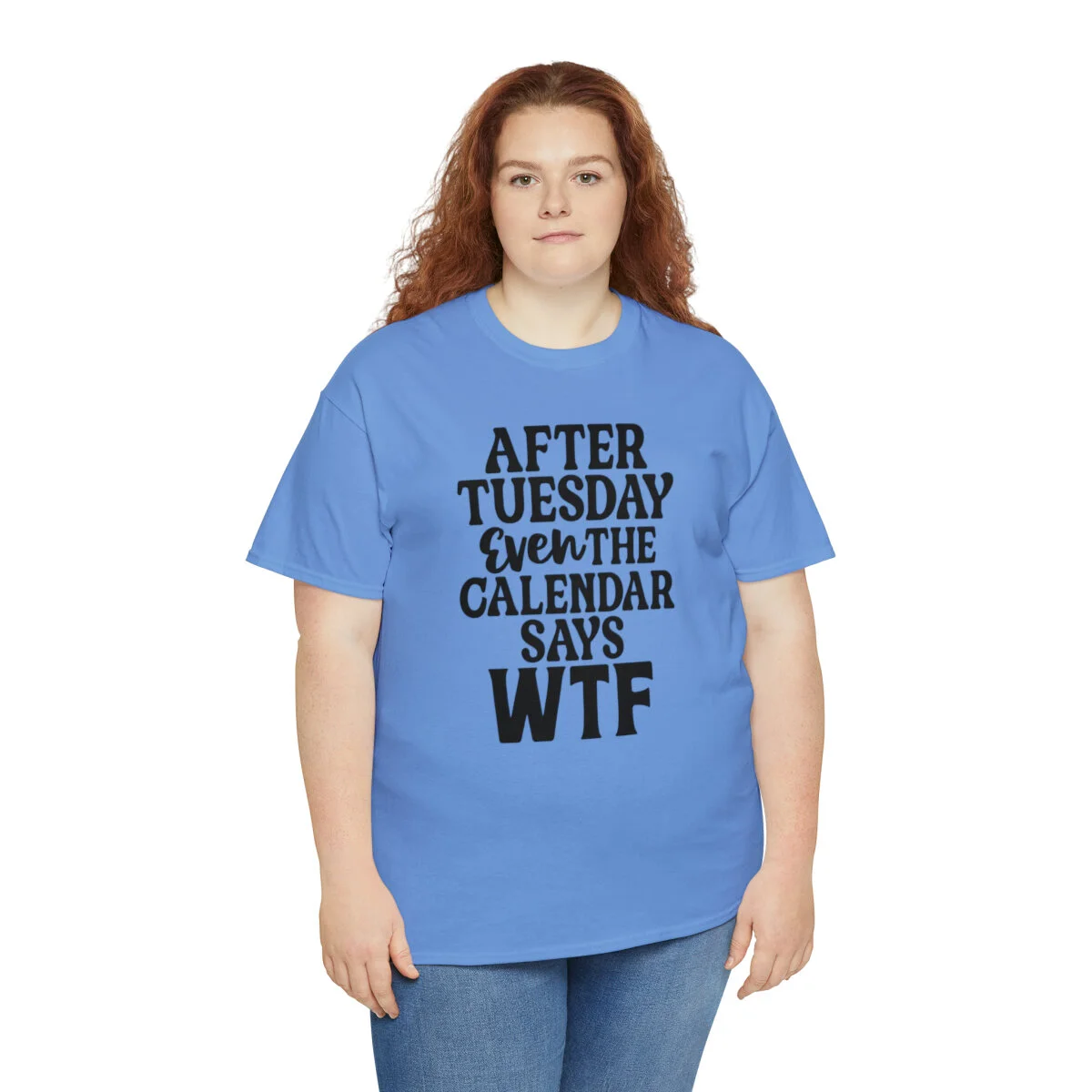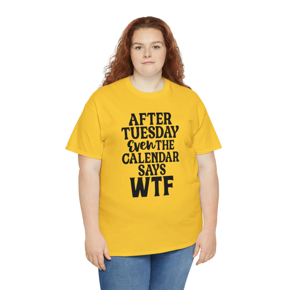Add a dose of humor to your wardrobe with our witty t-shirt that humorously declares, "After Tuesday, even the calendar says WTF..." With this design, you can showcase your playful side while acknowledging the universal feeling of confusion and bewilderment that sometimes accompanies the midweek slump.