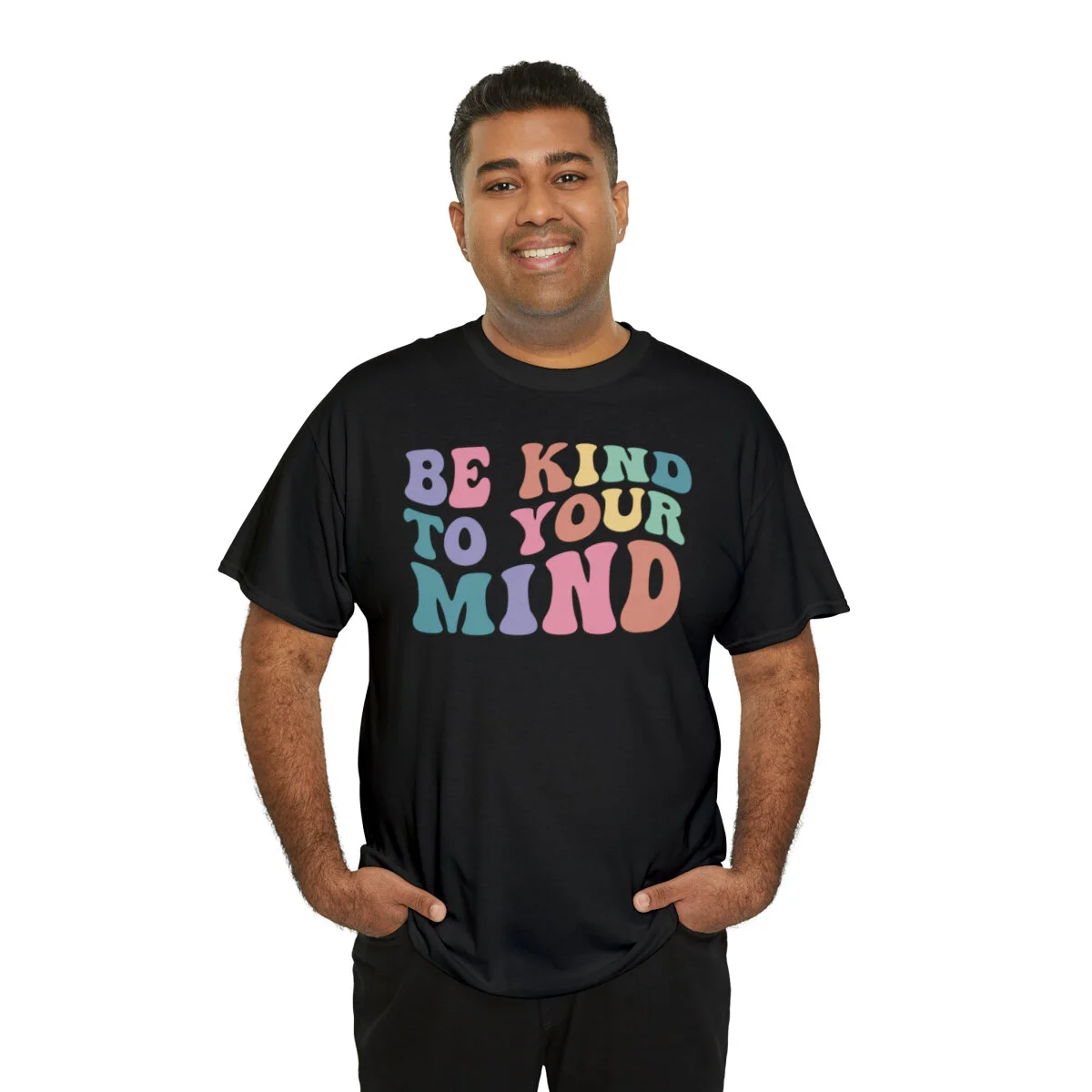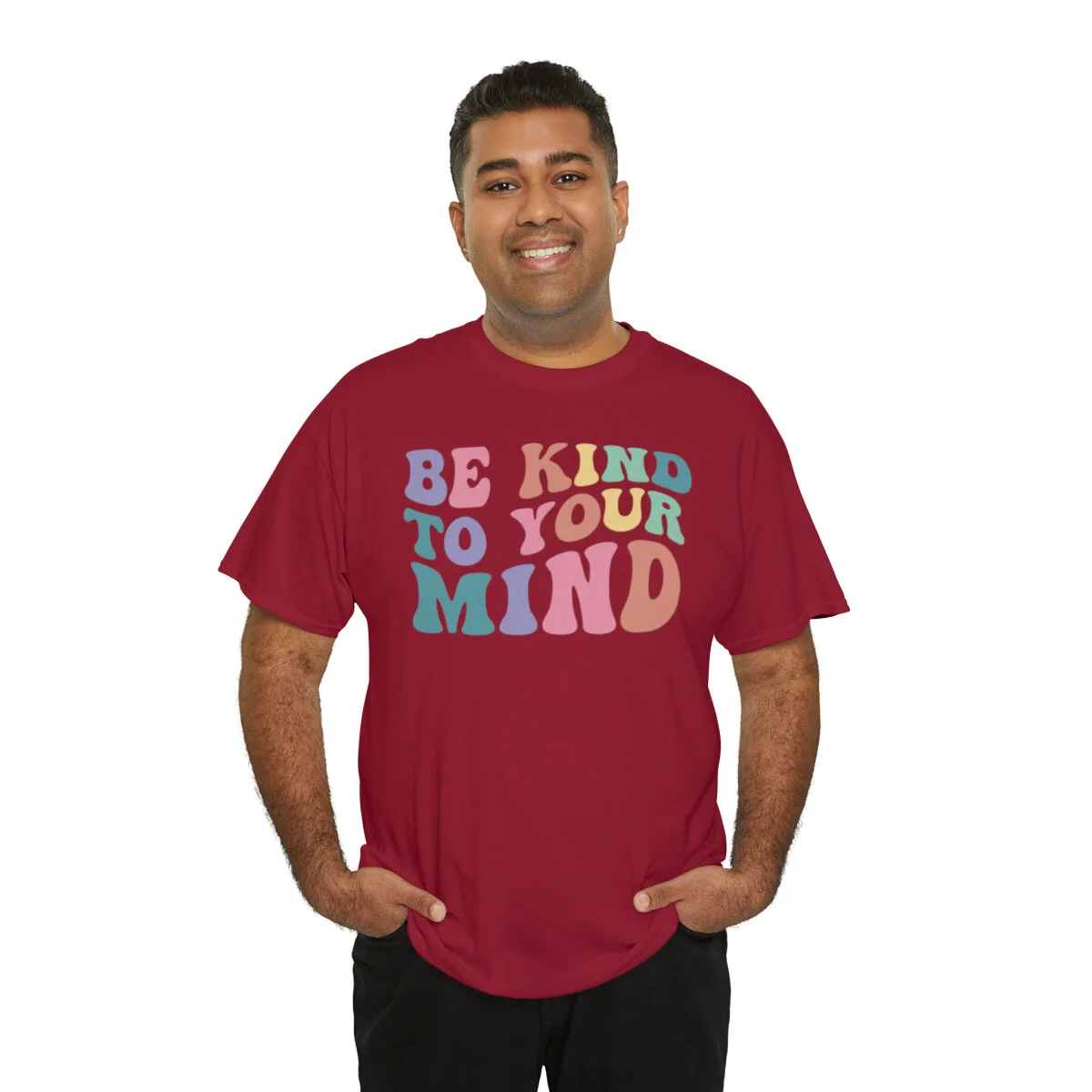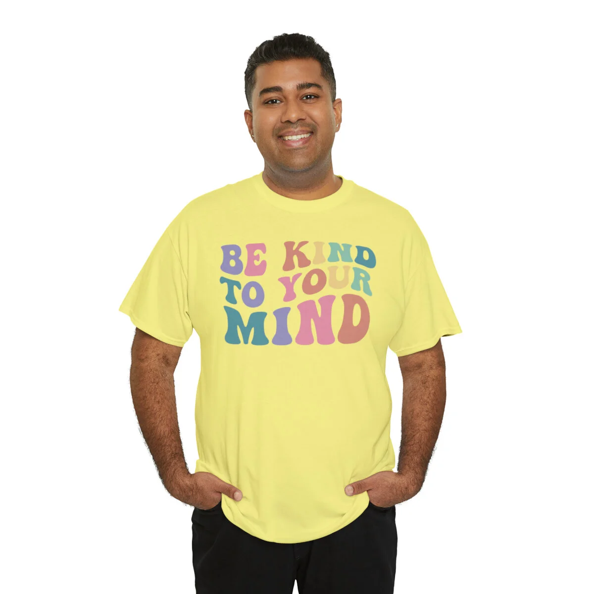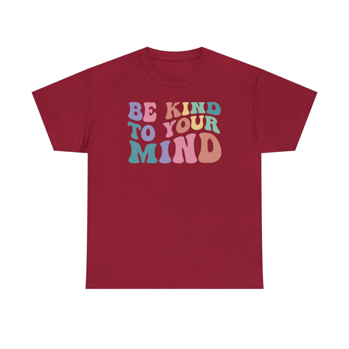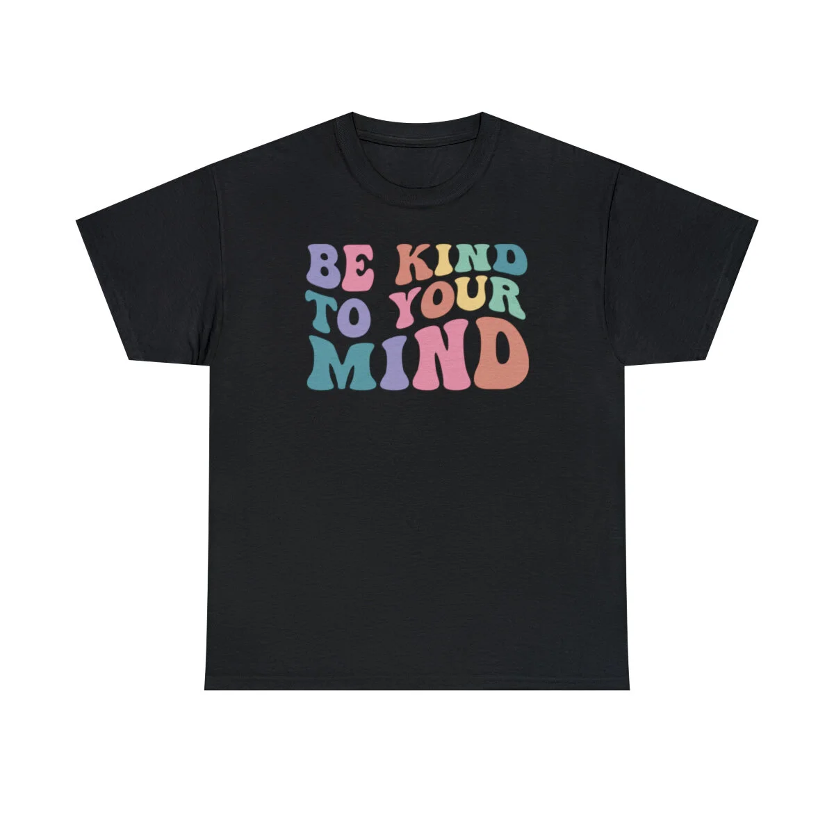 Crafted with care, this t-shirt is made from high-quality fabric to ensure exceptional comfort and durability. The design features the witty phrase, "YBe Kind to your mind," elegantly displayed in multiple colors. Choose from a variety of vibrant options, including red, blue, yellow, or classic black and white, to find the hue that best matches your style and personality.