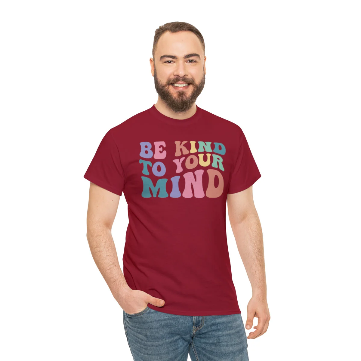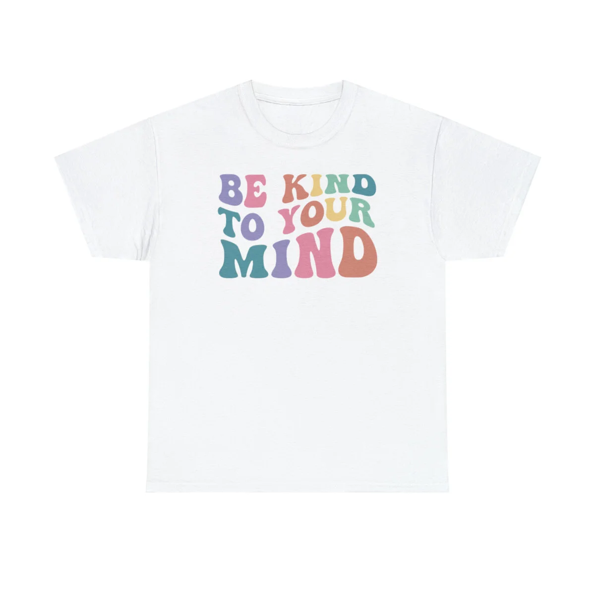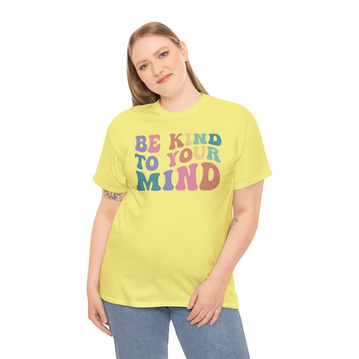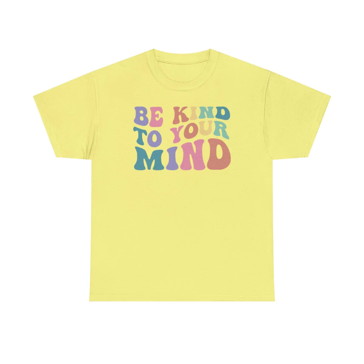 Crafted with care, this t-shirt is made from high-quality fabric to ensure exceptional comfort and durability. The design features the witty phrase, "YBe Kind to your mind," elegantly displayed in multiple colors. Choose from a variety of vibrant options, including red, blue, yellow, or classic black and white, to find the hue that best matches your style and personality.