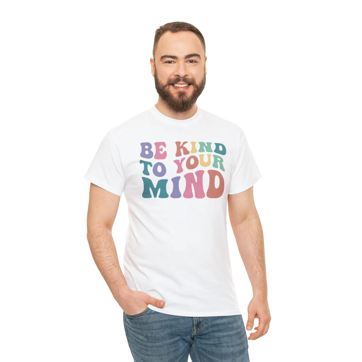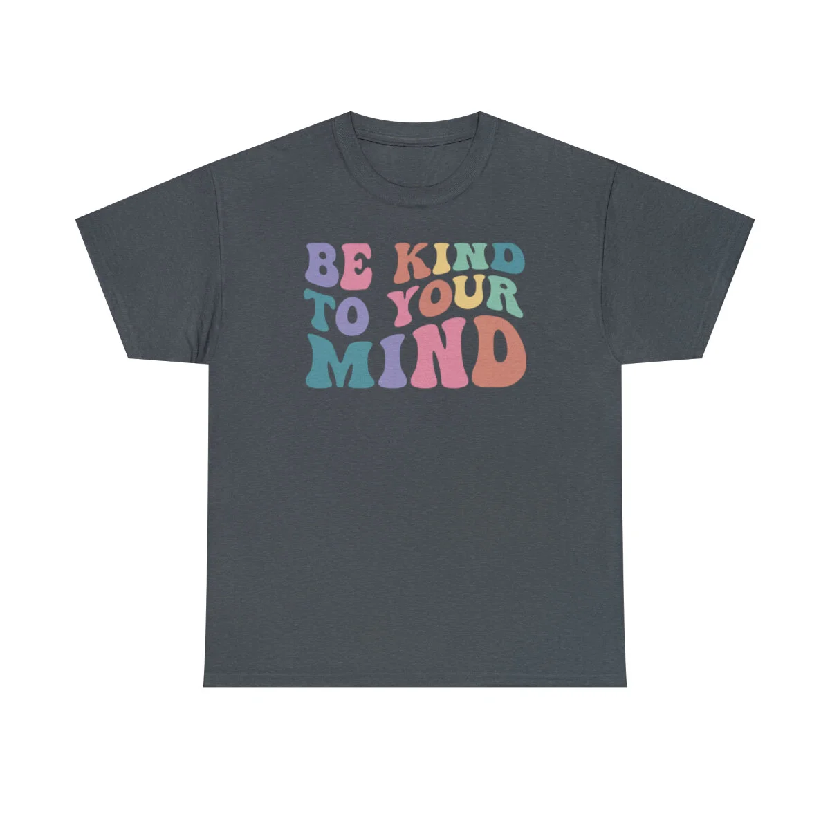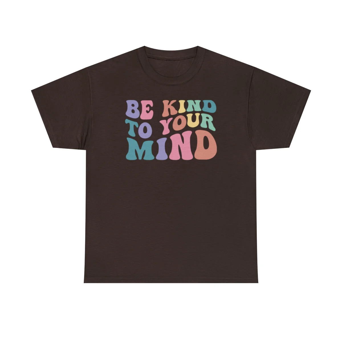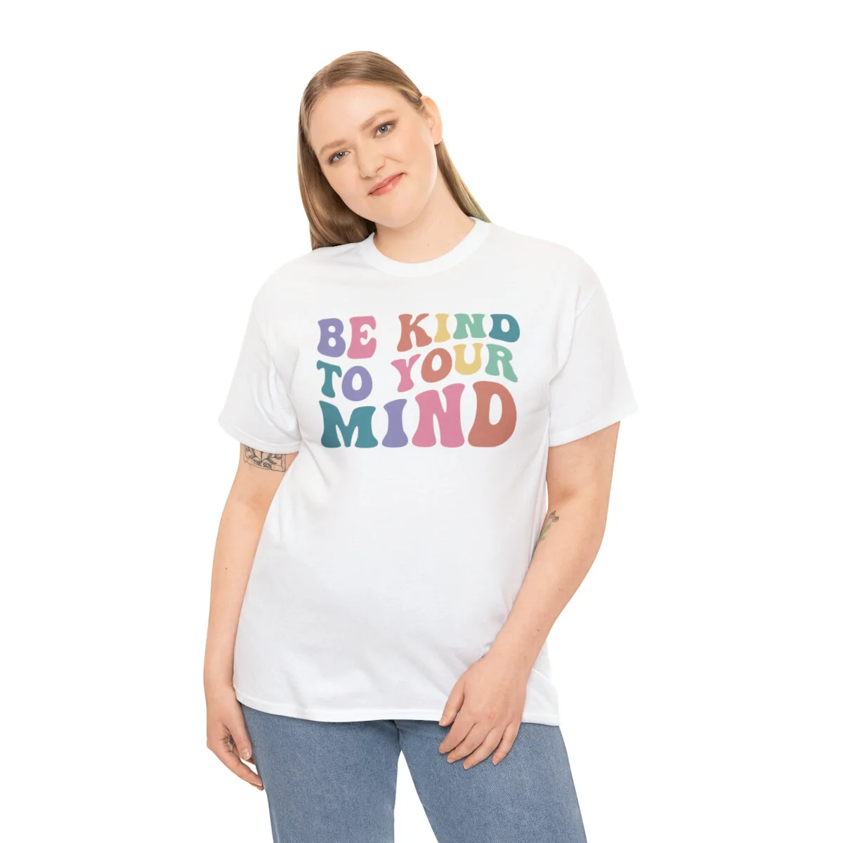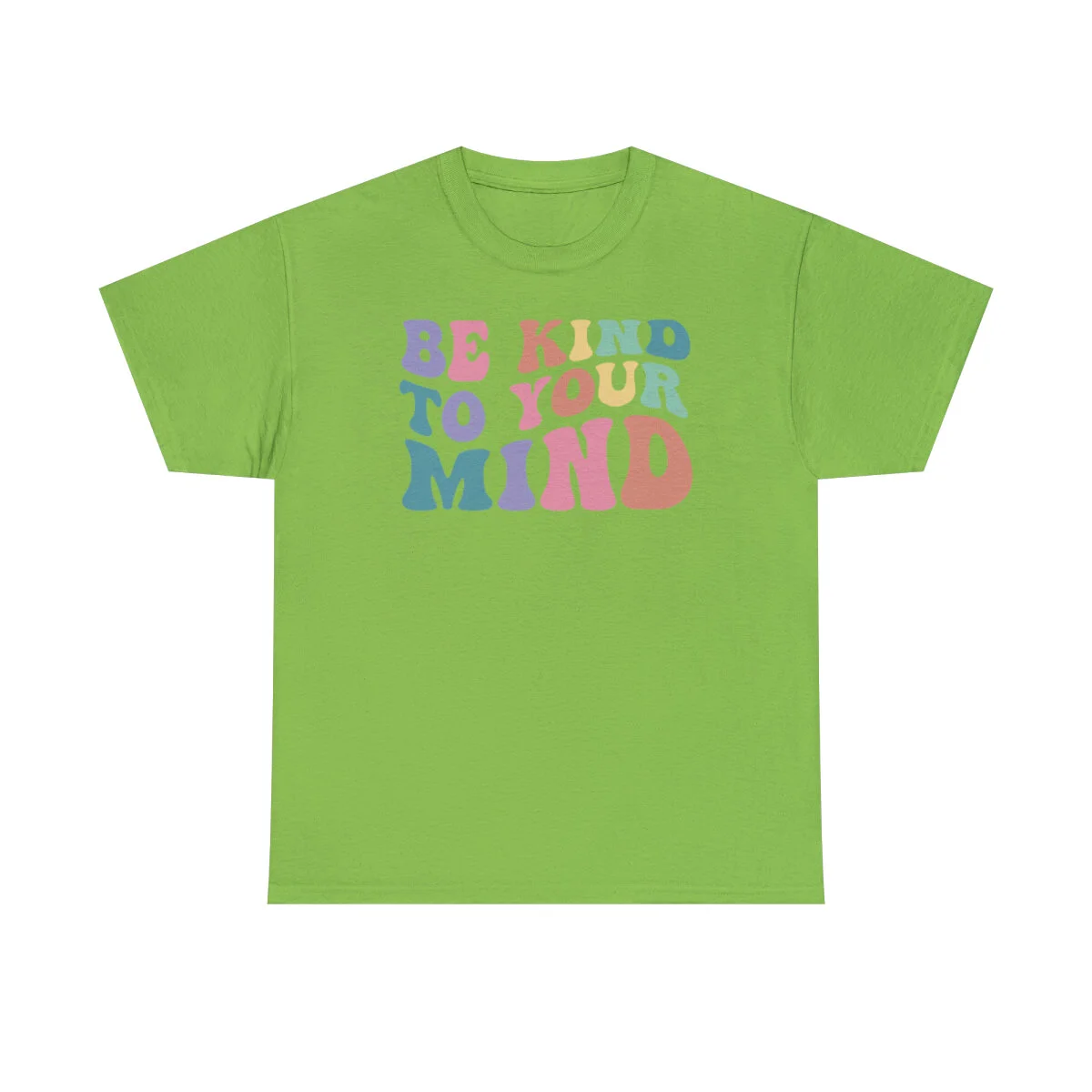 Crafted with care, this t-shirt is made from high-quality fabric to ensure exceptional comfort and durability. The design features the witty phrase, "YBe Kind to your mind," elegantly displayed in multiple colors. Choose from a variety of vibrant options, including red, blue, yellow, or classic black and white, to find the hue that best matches your style and personality.