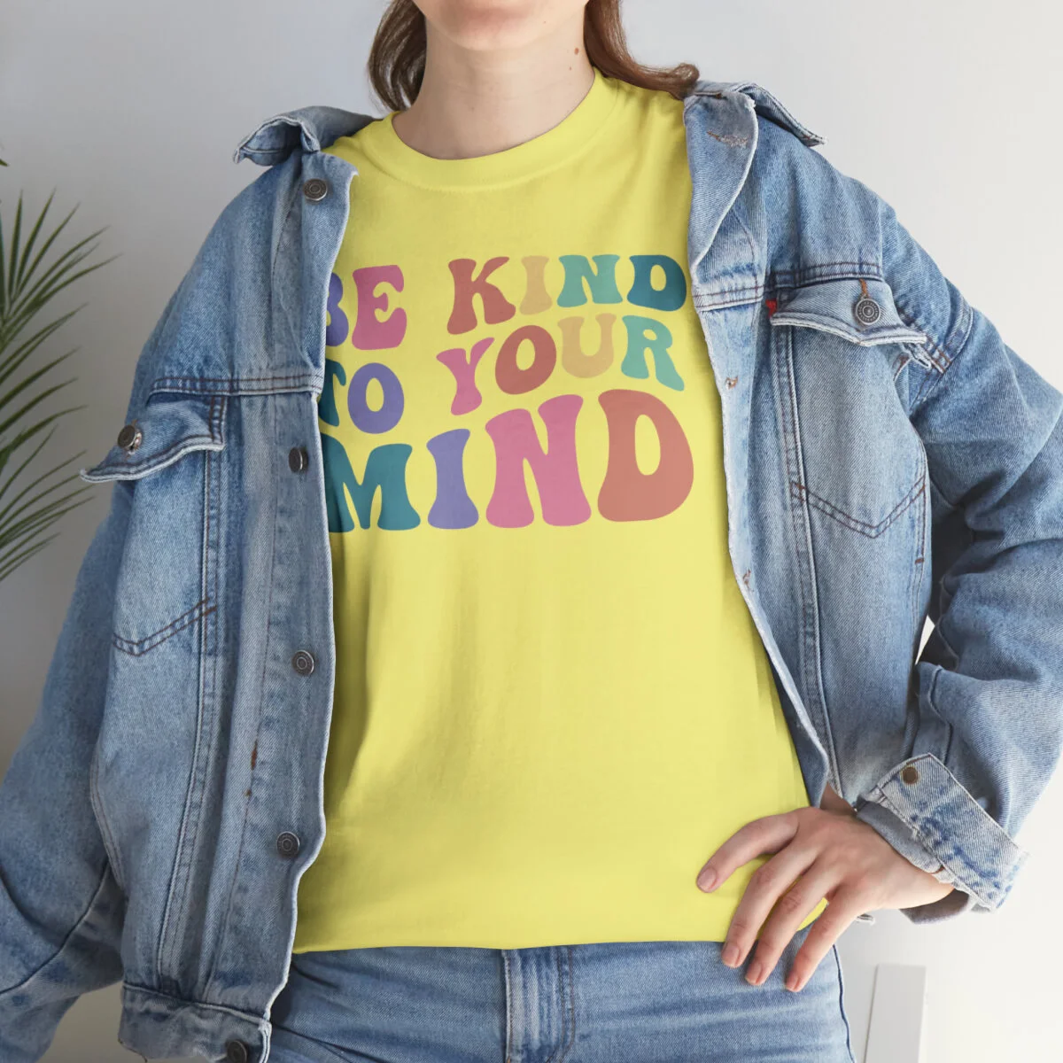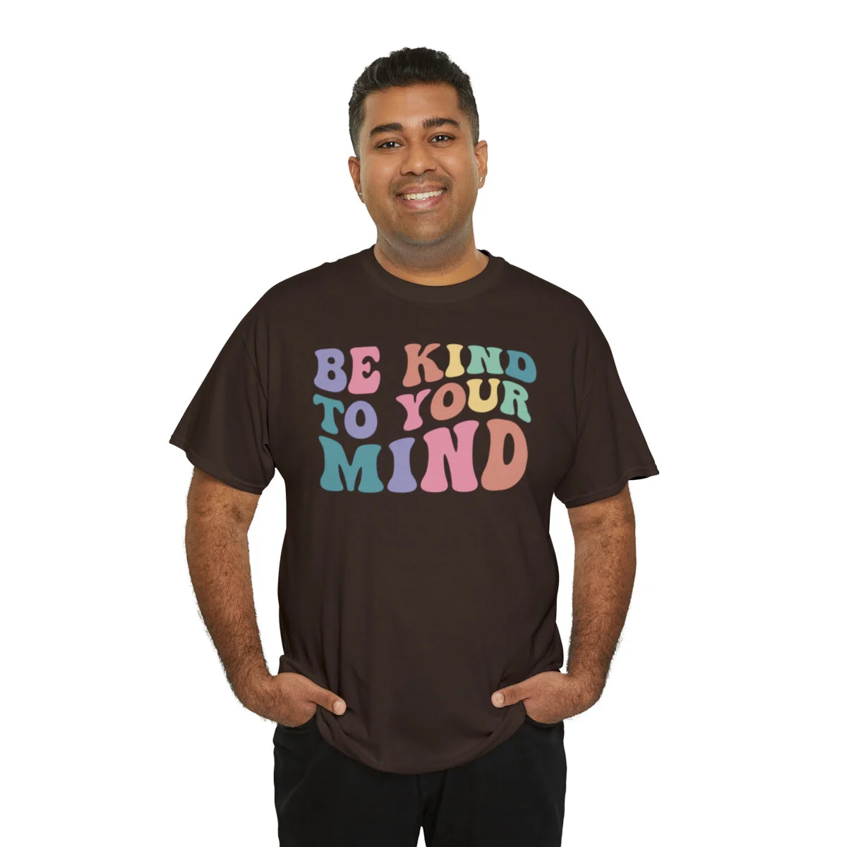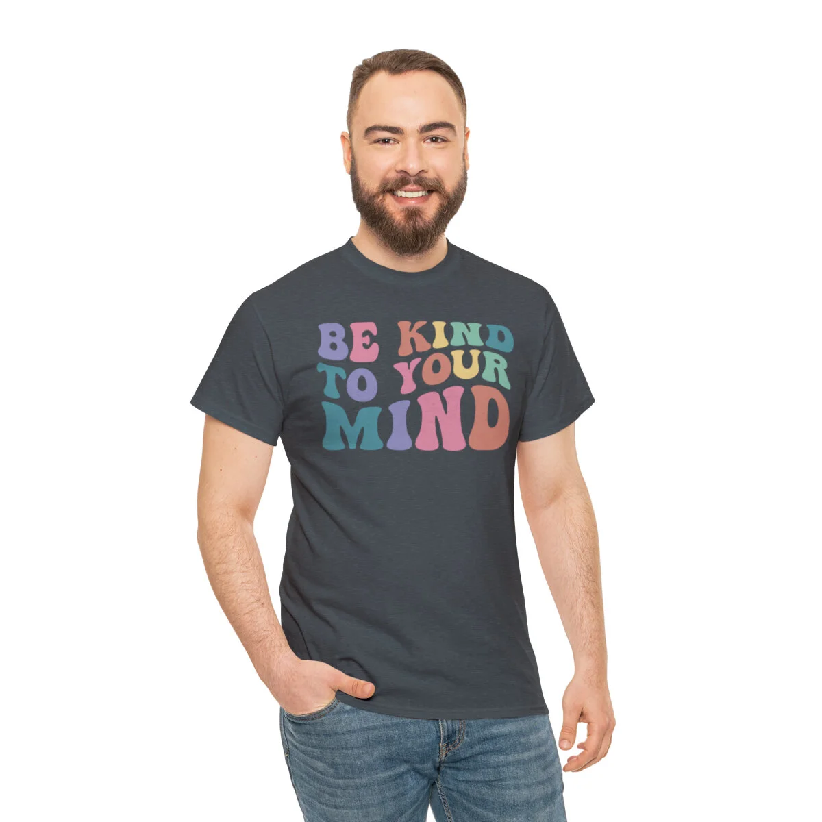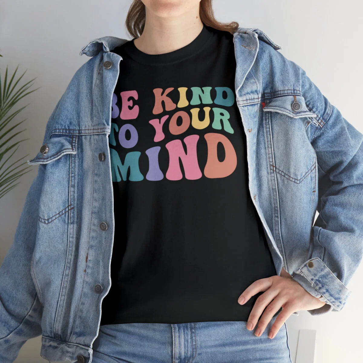 Crafted with care, this t-shirt is made from high-quality fabric to ensure exceptional comfort and durability. The design features the witty phrase, "YBe Kind to your mind," elegantly displayed in multiple colors. Choose from a variety of vibrant options, including red, blue, yellow, or classic black and white, to find the hue that best matches your style and personality.
