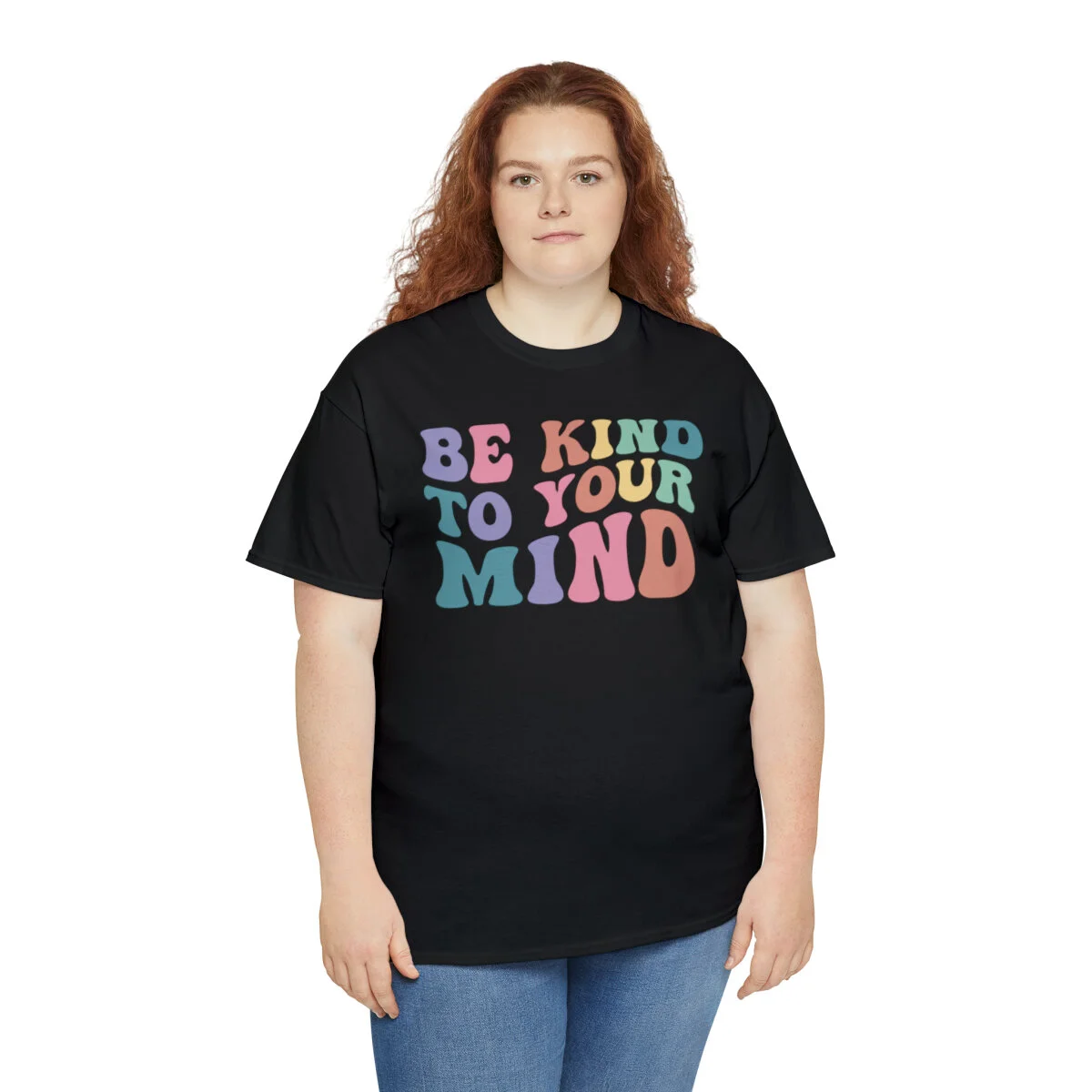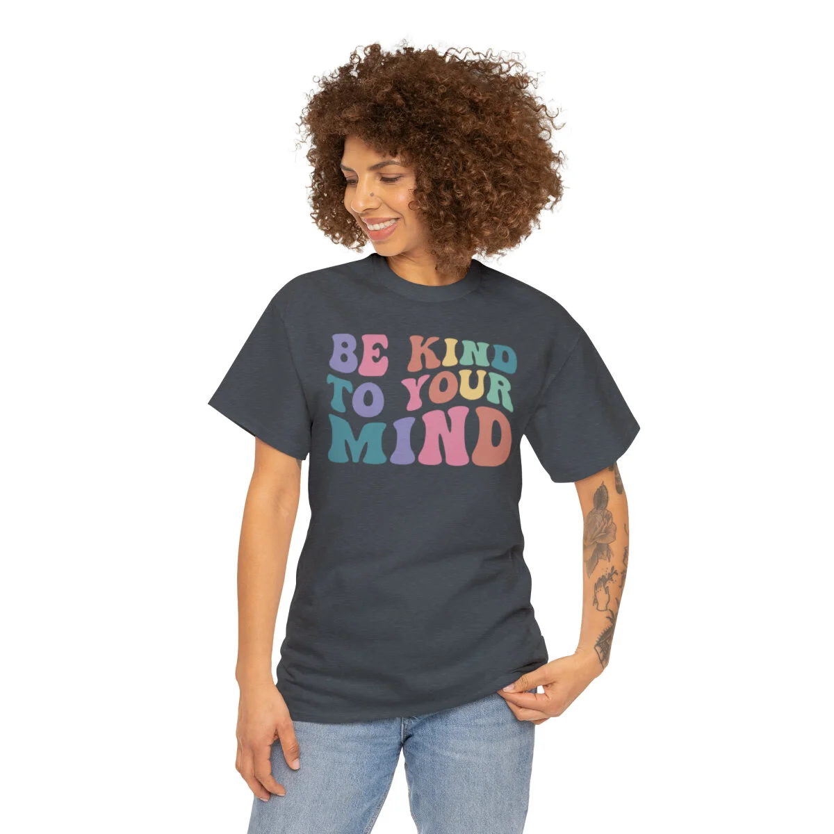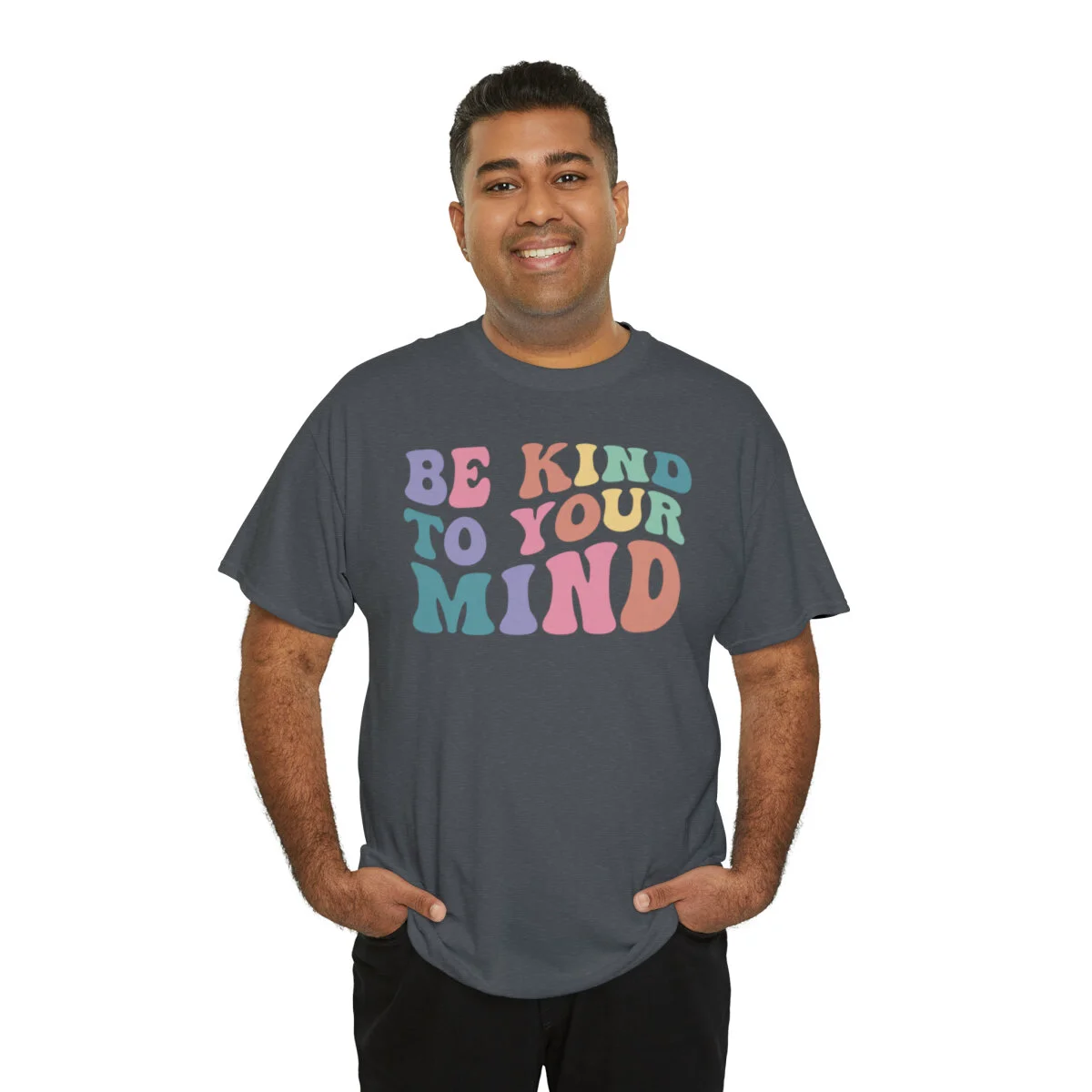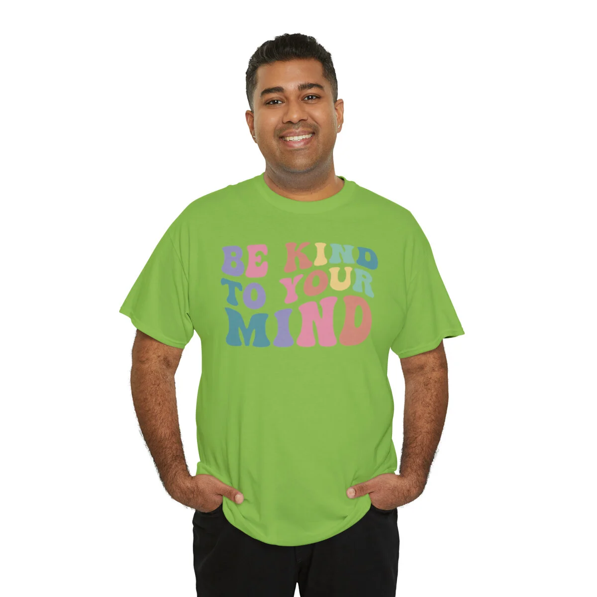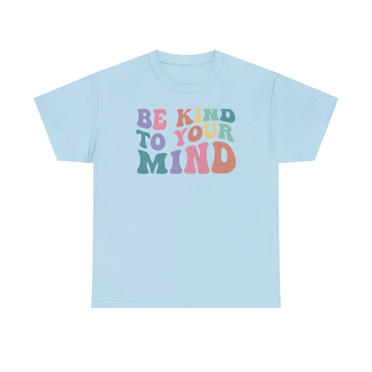 Crafted with care, this t-shirt is made from high-quality fabric to ensure exceptional comfort and durability. The design features the witty phrase, "YBe Kind to your mind," elegantly displayed in multiple colors. Choose from a variety of vibrant options, including red, blue, yellow, or classic black and white, to find the hue that best matches your style and personality.