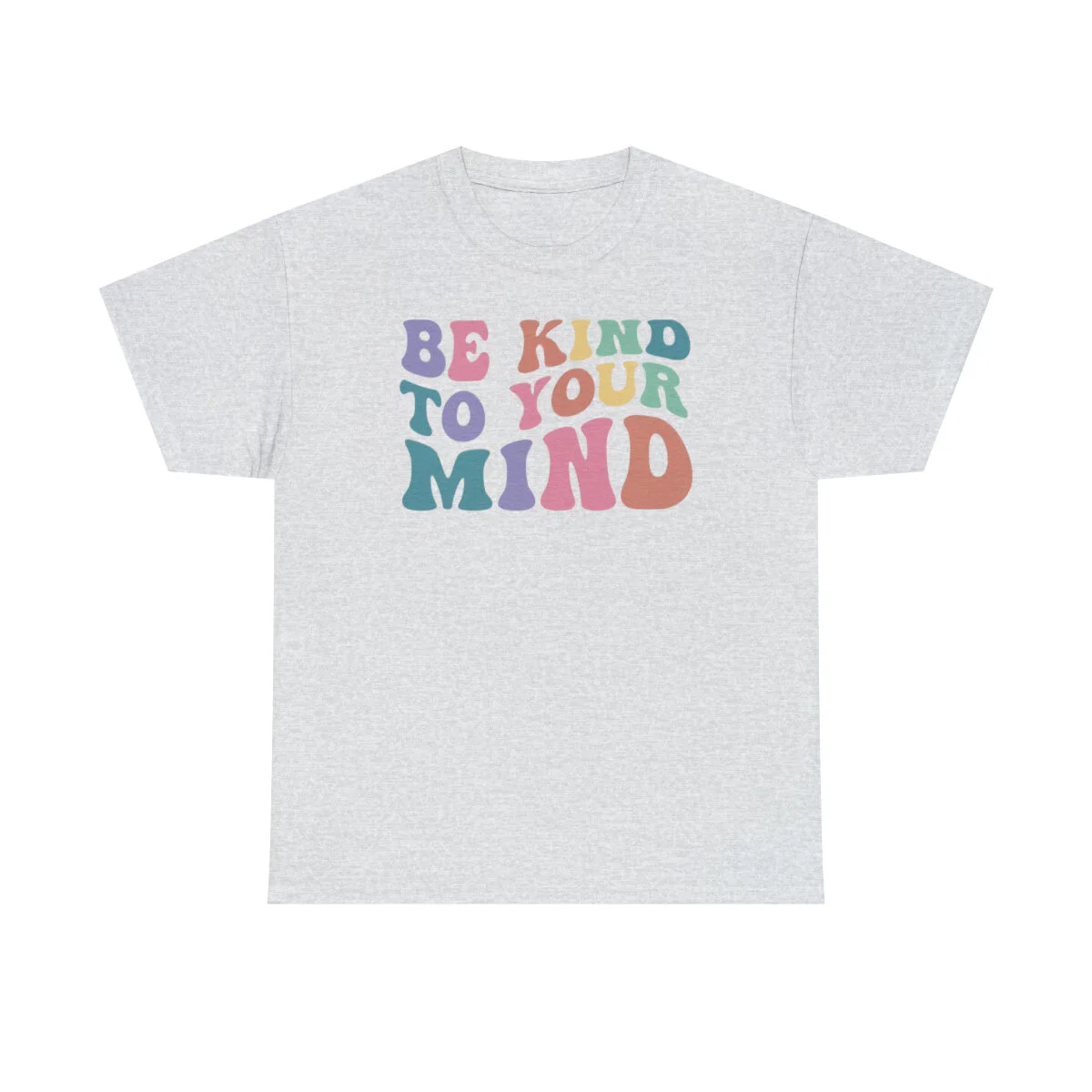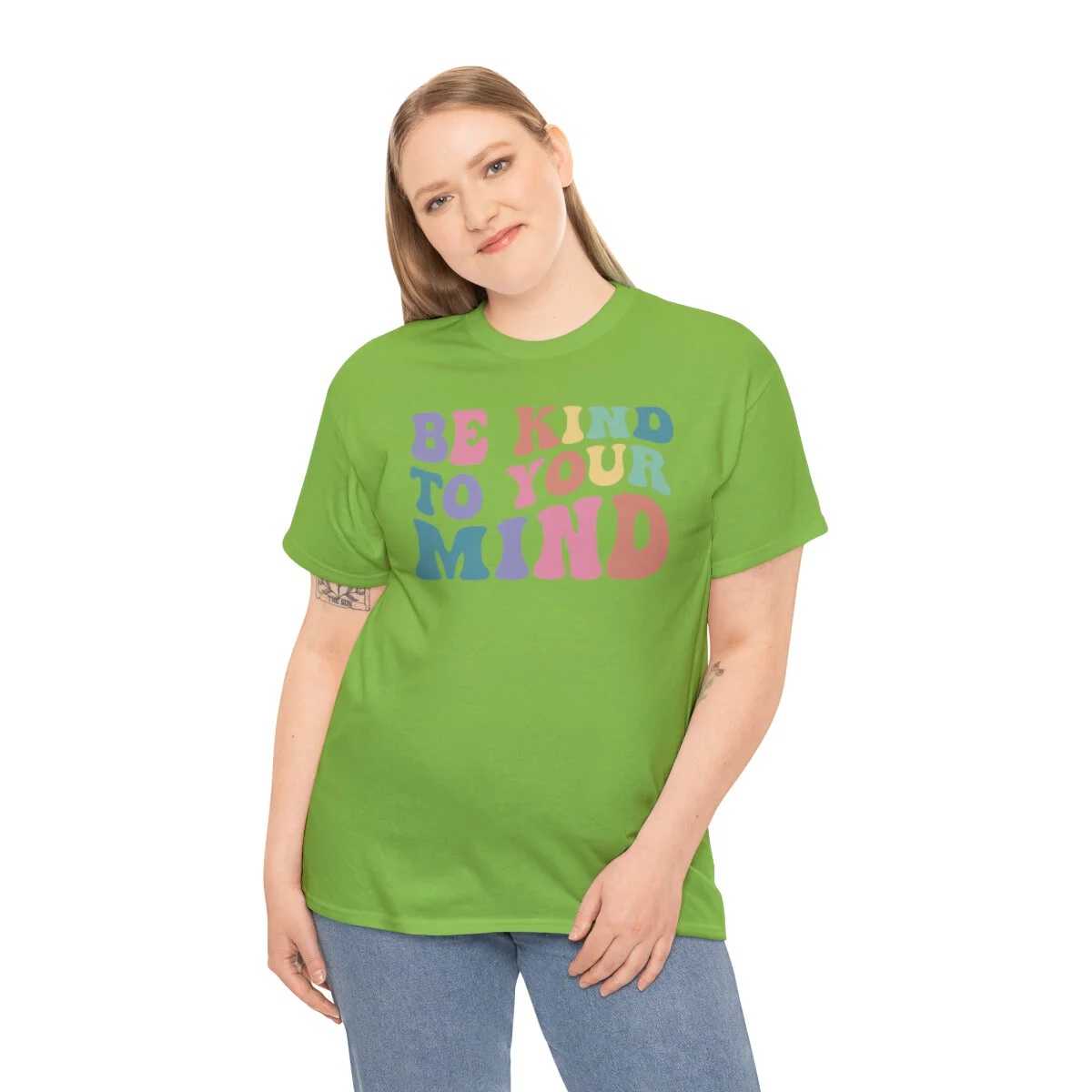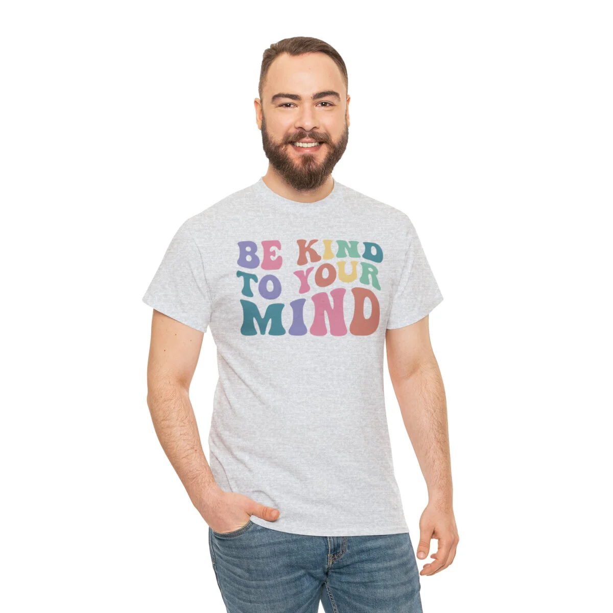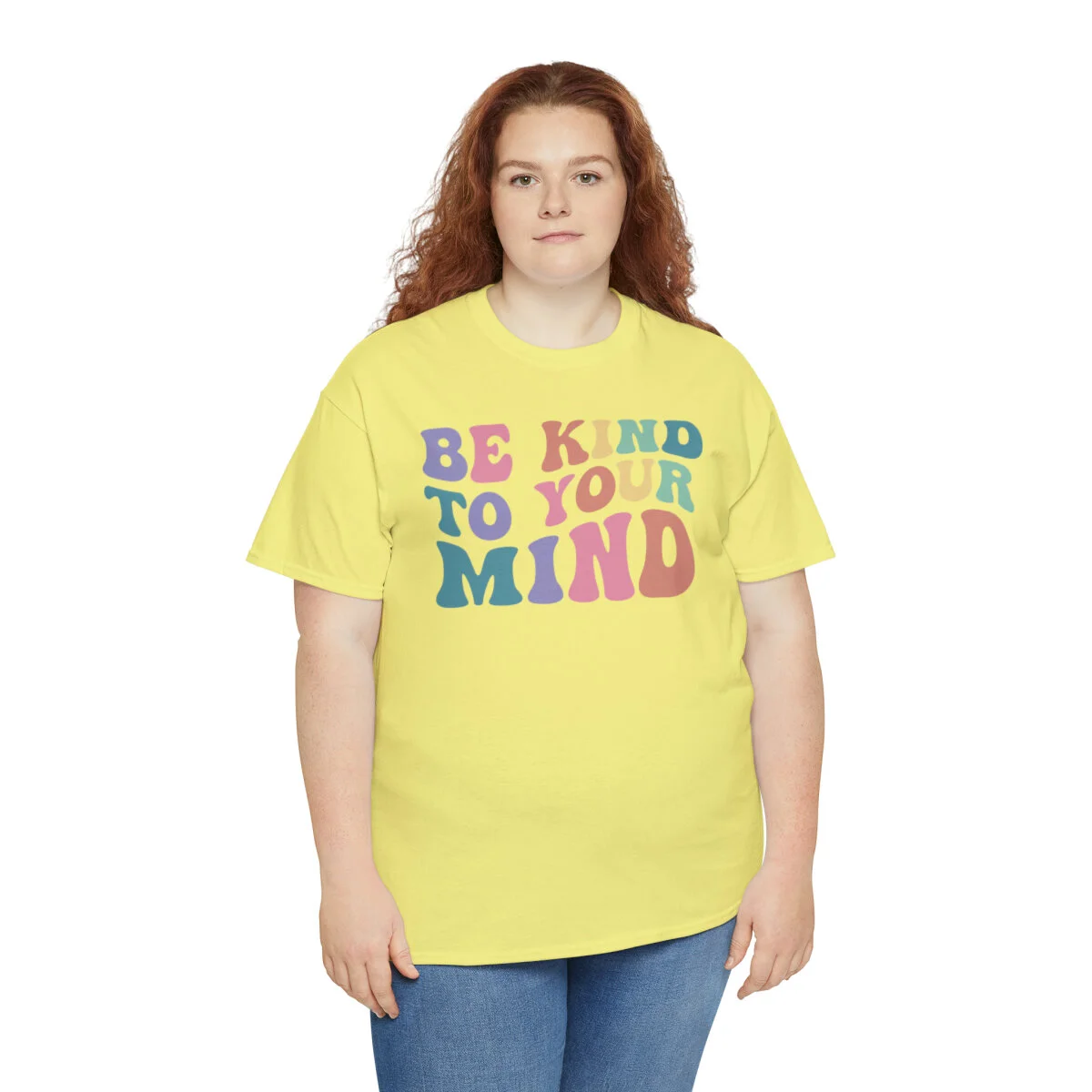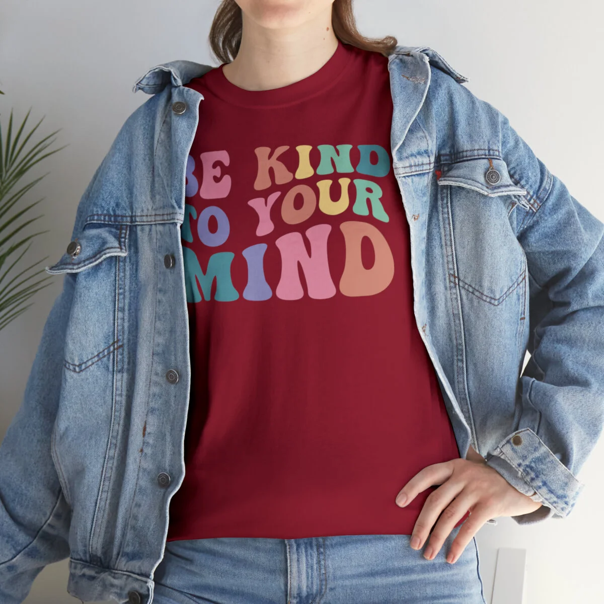 Crafted with care, this t-shirt is made from high-quality fabric to ensure exceptional comfort and durability. The design features the witty phrase, "YBe Kind to your mind," elegantly displayed in multiple colors. Choose from a variety of vibrant options, including red, blue, yellow, or classic black and white, to find the hue that best matches your style and personality.