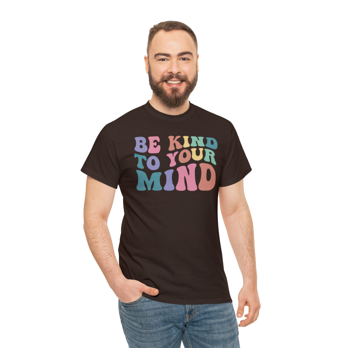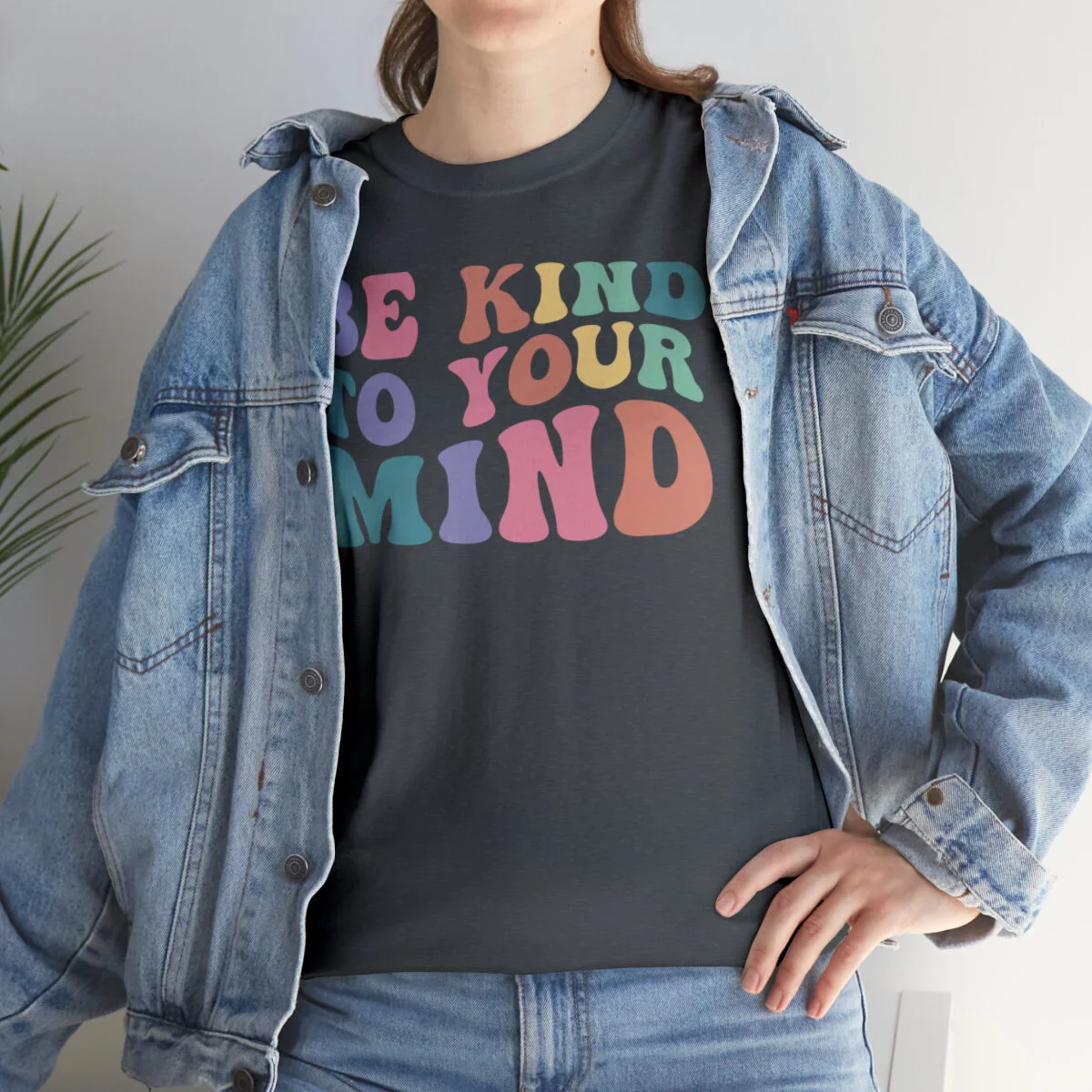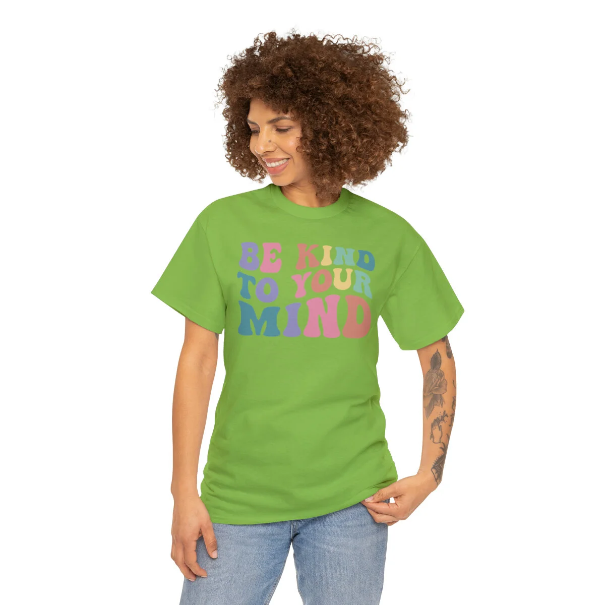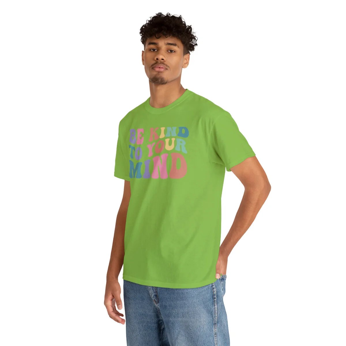 Crafted with care, this t-shirt is made from high-quality fabric to ensure exceptional comfort and durability. The design features the witty phrase, "YBe Kind to your mind," elegantly displayed in multiple colors. Choose from a variety of vibrant options, including red, blue, yellow, or classic black and white, to find the hue that best matches your style and personality.