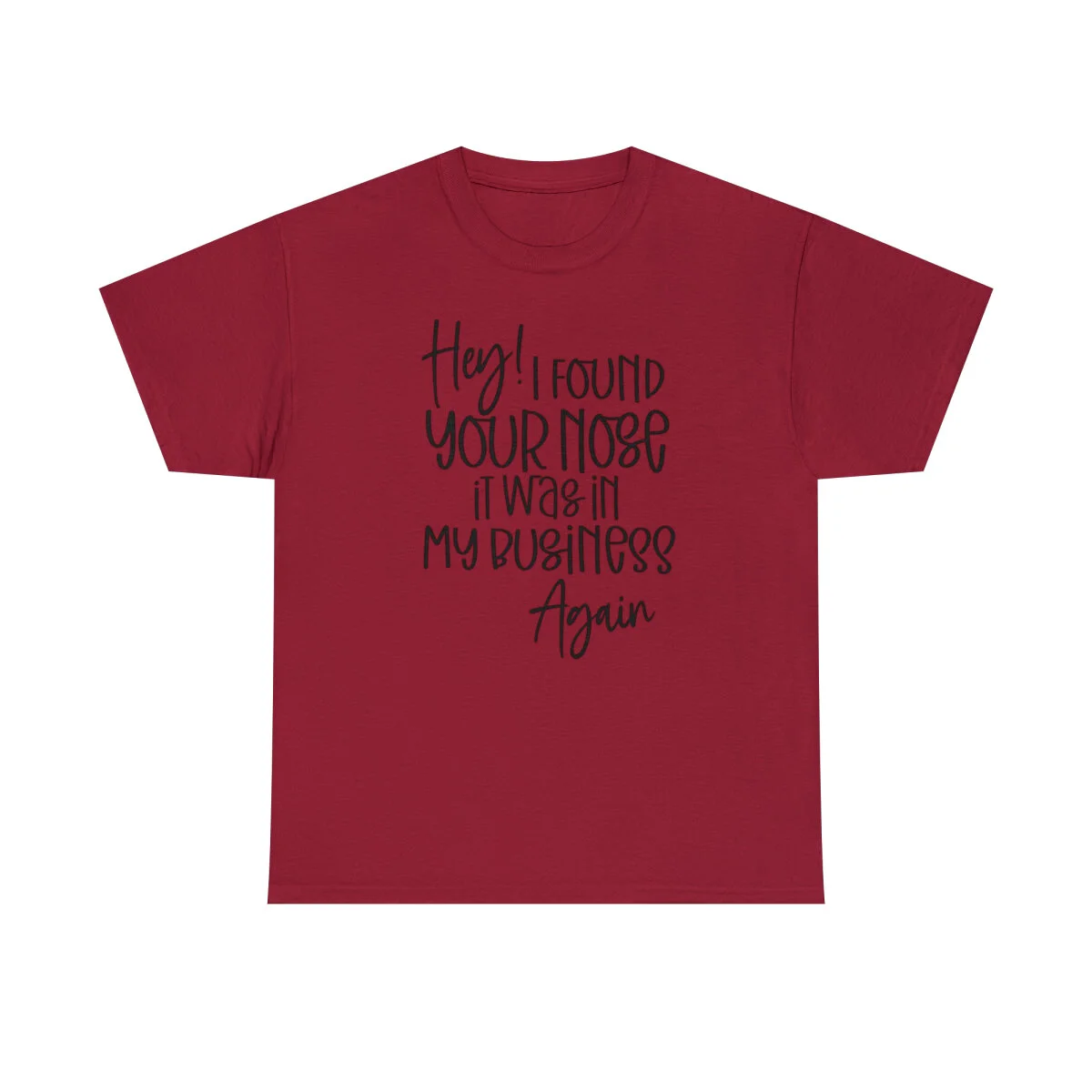 Please note that this design is intended to be lighthearted and playful, embracing the importance of personal boundaries in a humorous manner. Wear it with the intention of celebrating your independence and reminding others to keep their noses out of your business. Embrace the witty message, initiate conversations, and proudly wear the "Hey! I found your nose, it was in my business again.." t-shirt that combines style, humor, and a touch of assertiveness.