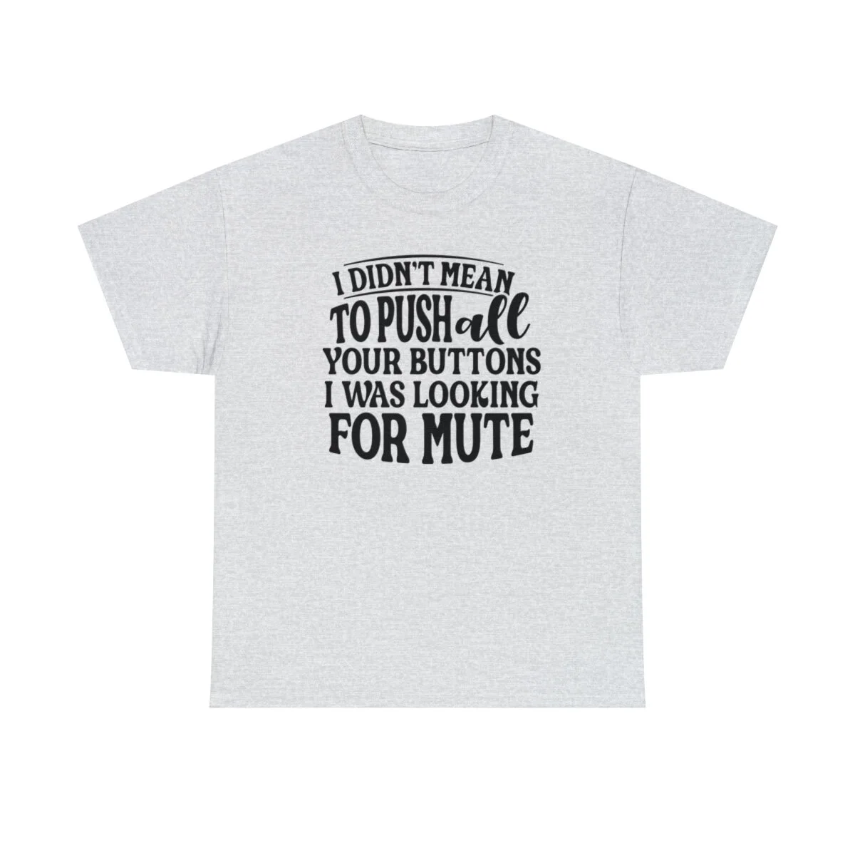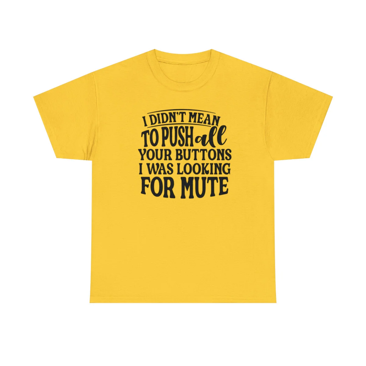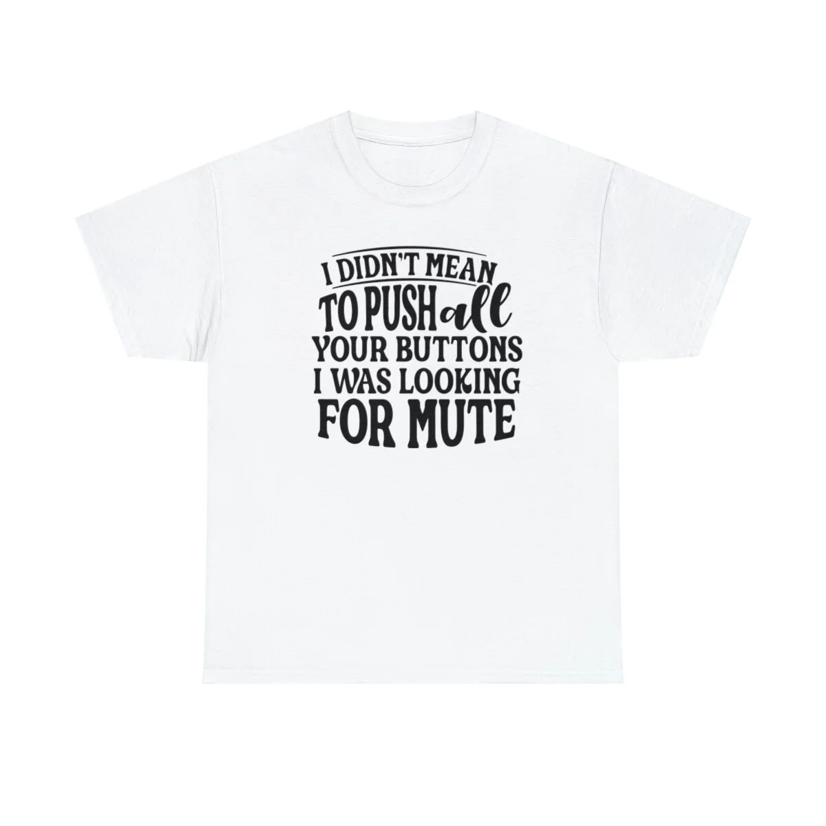 Add a touch of playful humor to your wardrobe with our witty t-shirt that declares, "I didn't mean to push all your buttons, I was looking for mute." This design showcases your quick wit and lighthearted approach to communication.
