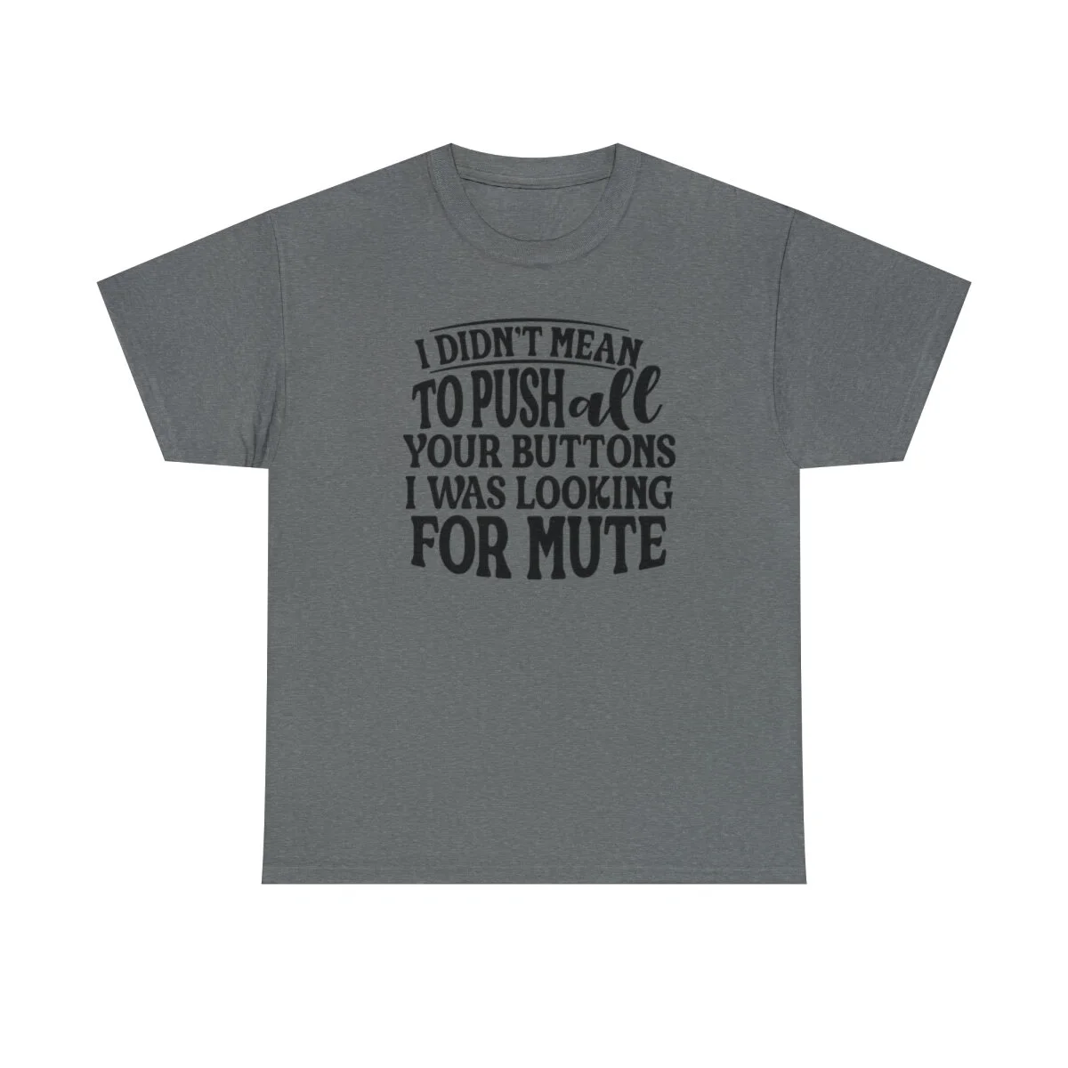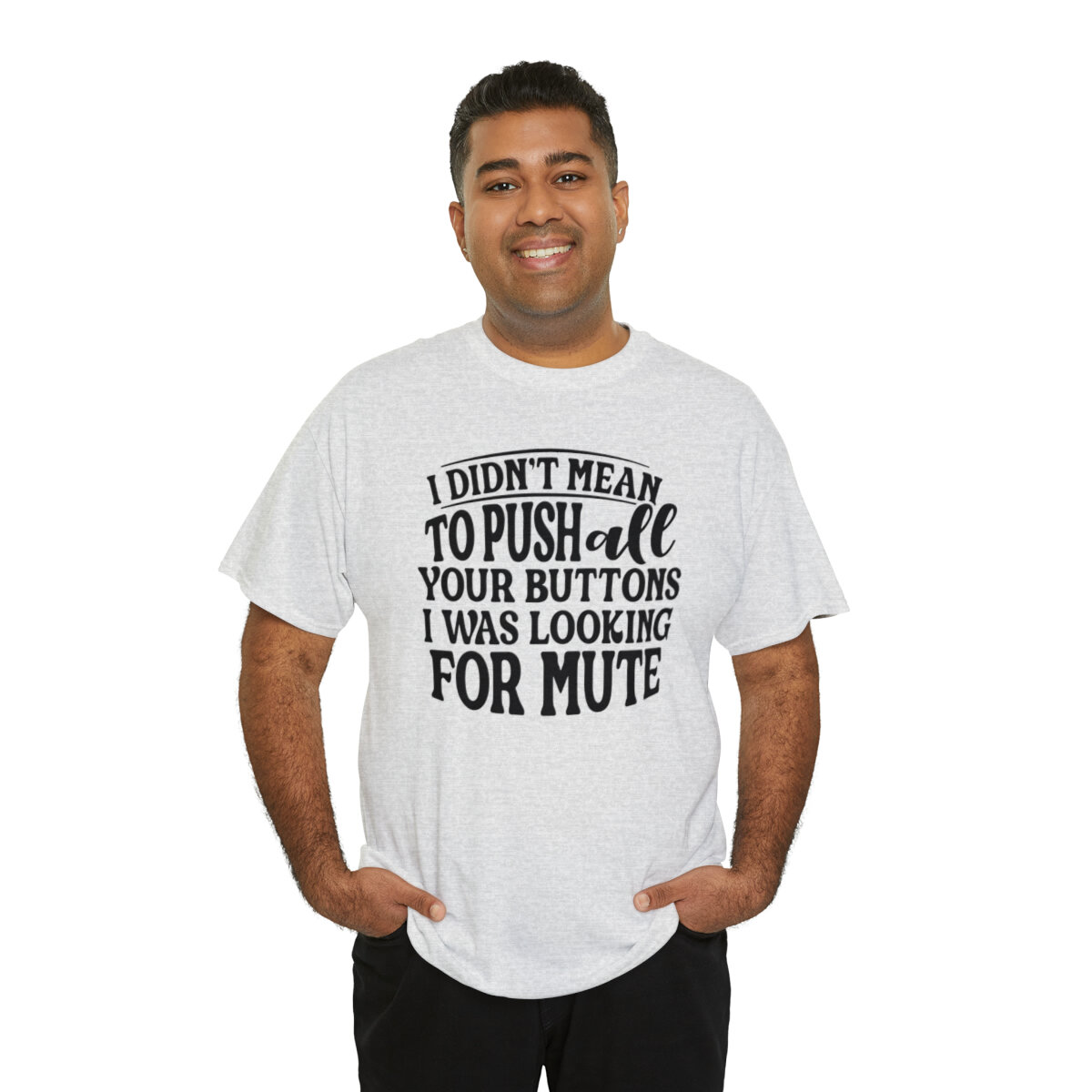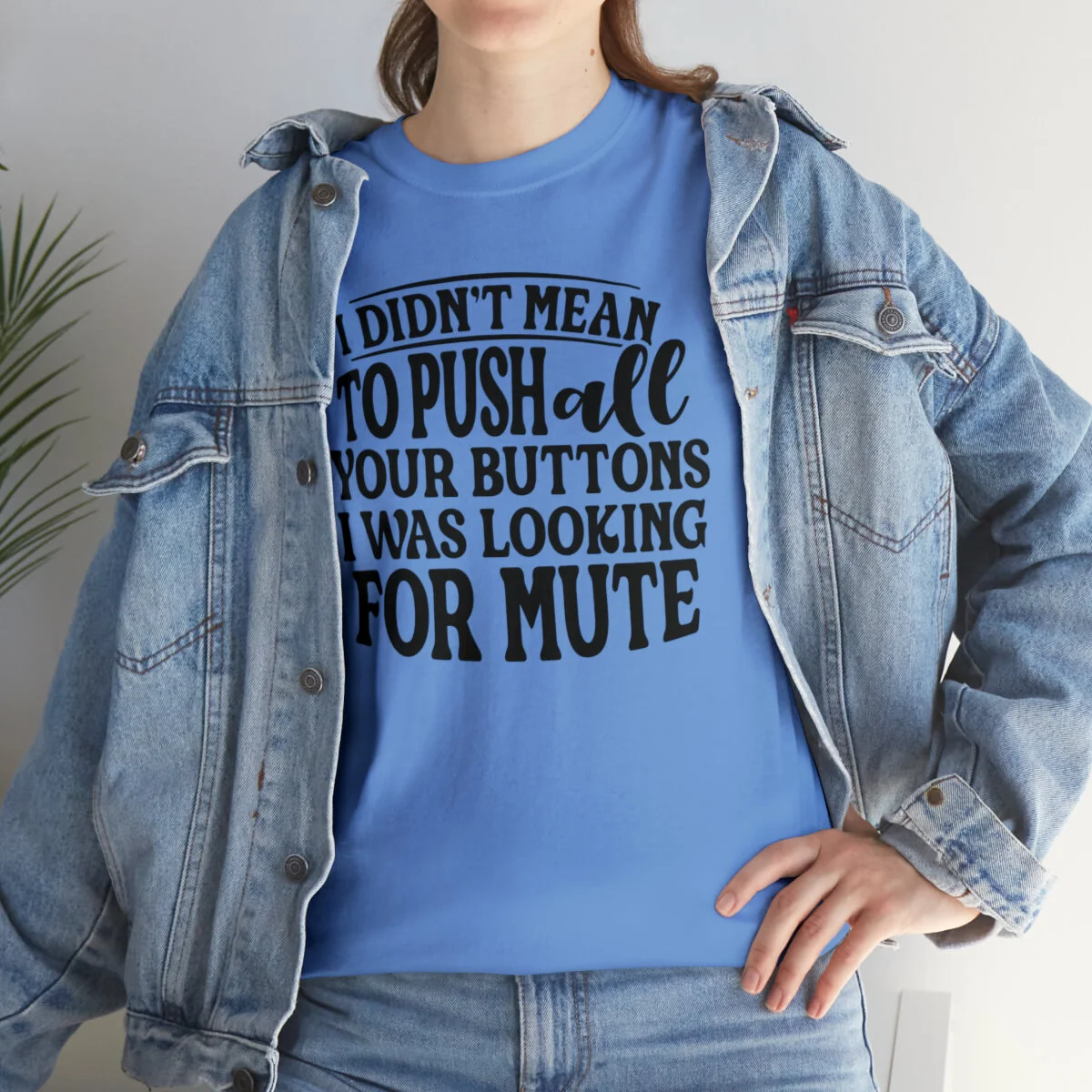 Add a touch of playful humor to your wardrobe with our witty t-shirt that declares, "I didn't mean to push all your buttons, I was looking for mute." This design showcases your quick wit and lighthearted approach to communication.