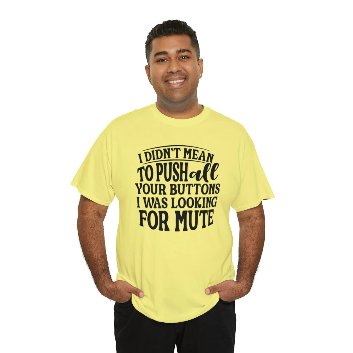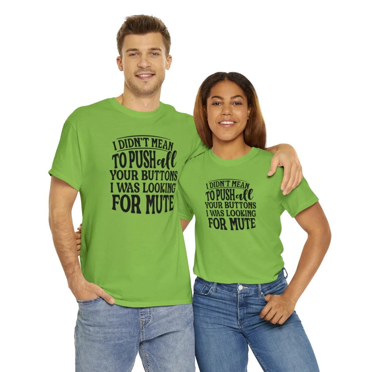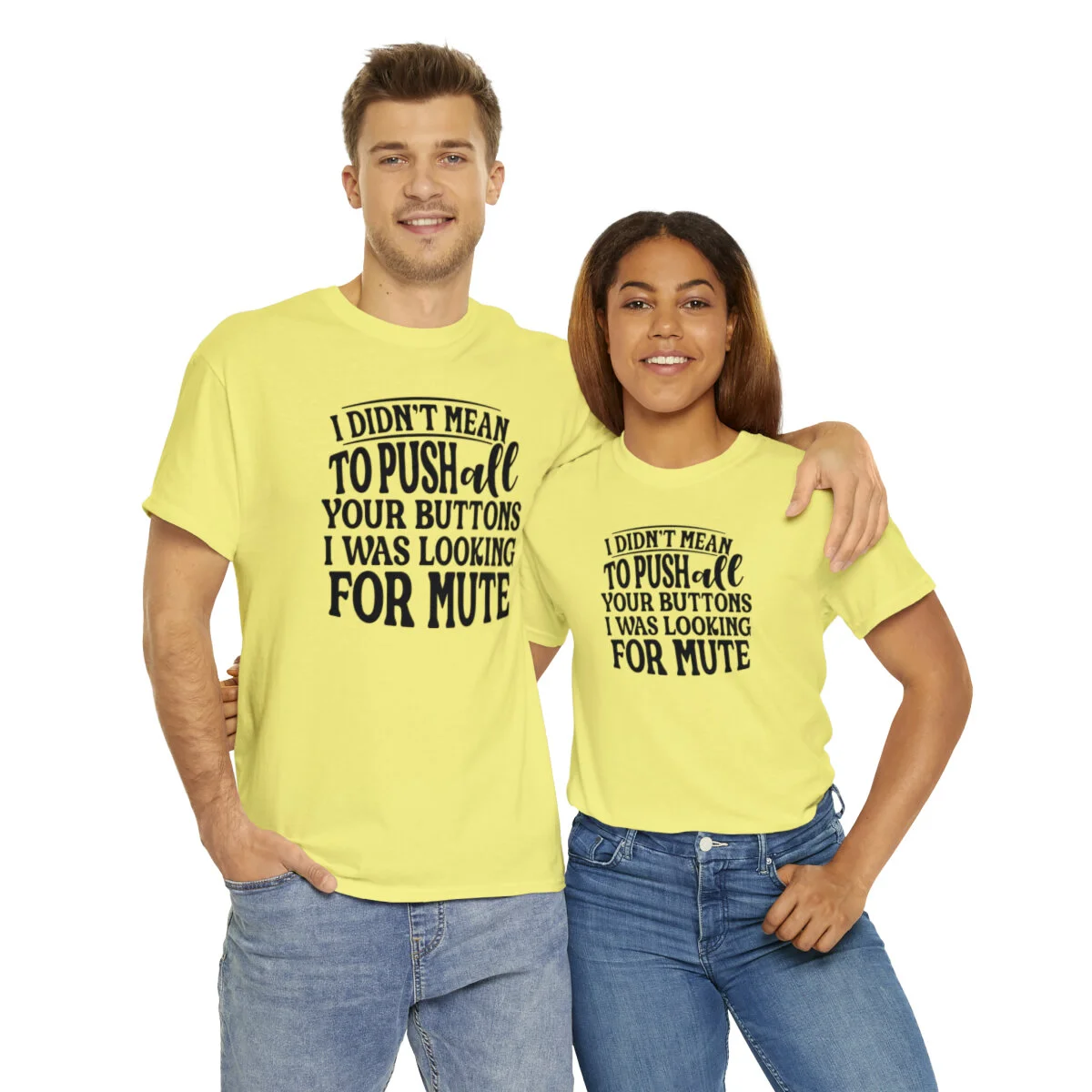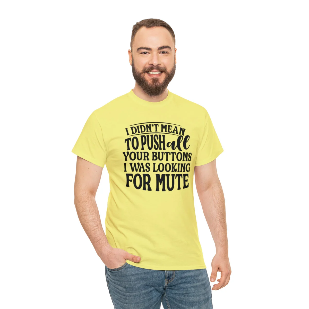 Crafted with care, this t-shirt is made from high-quality fabric to ensure exceptional comfort and durability. The design features the clever phrase, "I didn't mean to push all your buttons, I was looking for mute," creatively displayed in multiple colors. Choose from a variety of vibrant options to match your personal style.