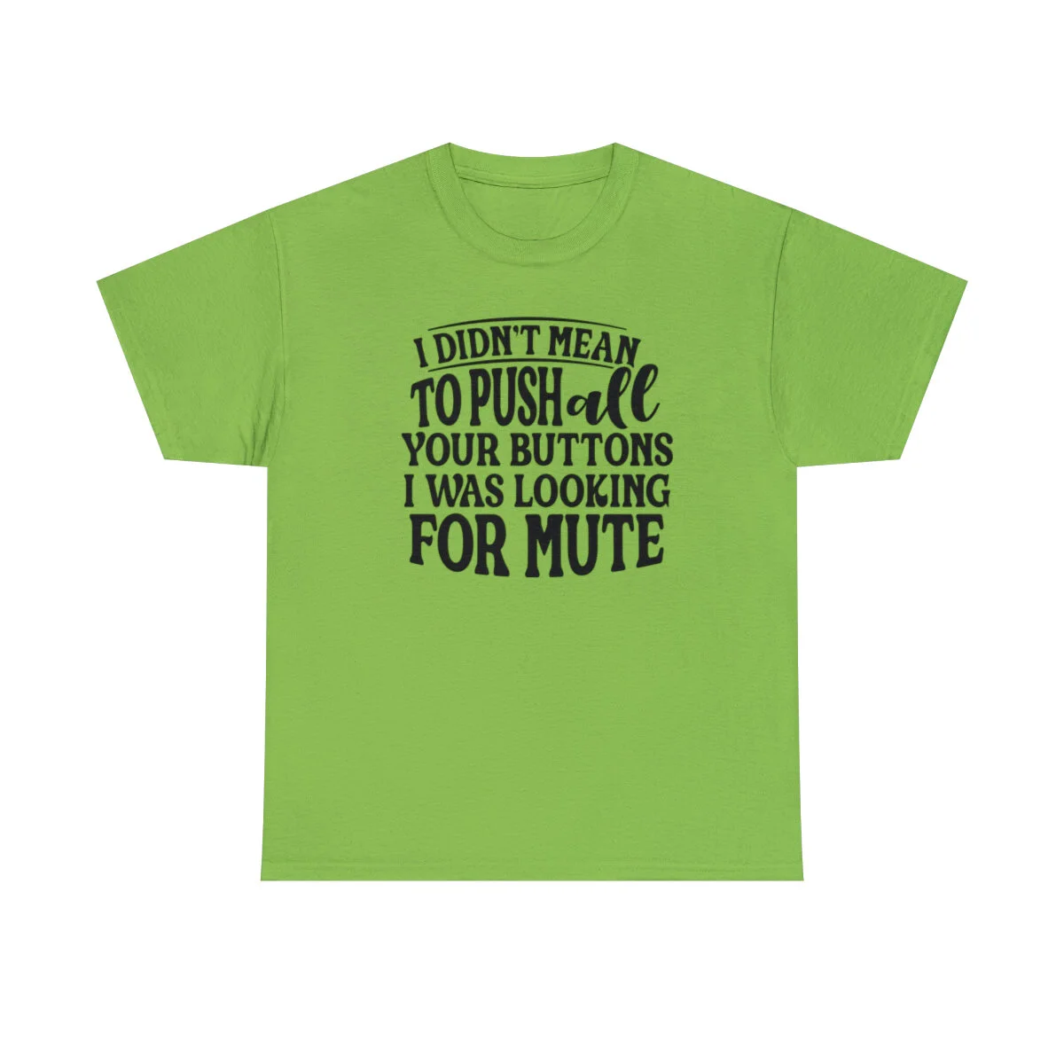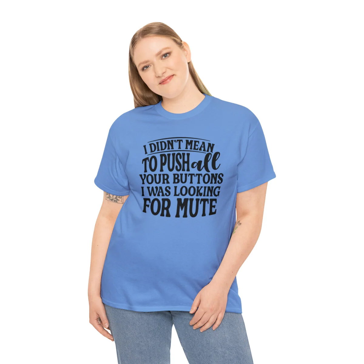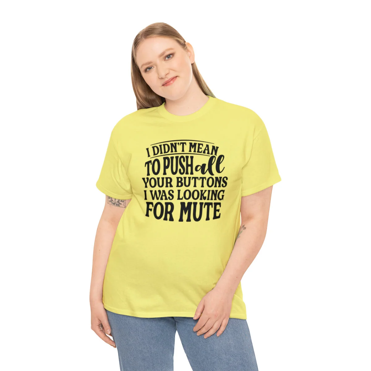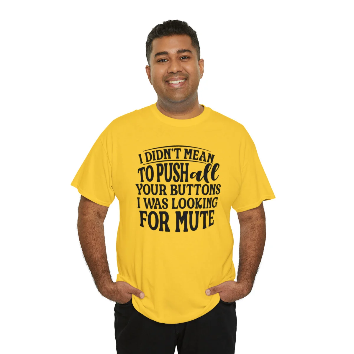 Crafted with care, this t-shirt is made from high-quality fabric to ensure exceptional comfort and durability. The design features the clever phrase, "I didn't mean to push all your buttons, I was looking for mute," creatively displayed in multiple colors. Choose from a variety of vibrant options to match your personal style.