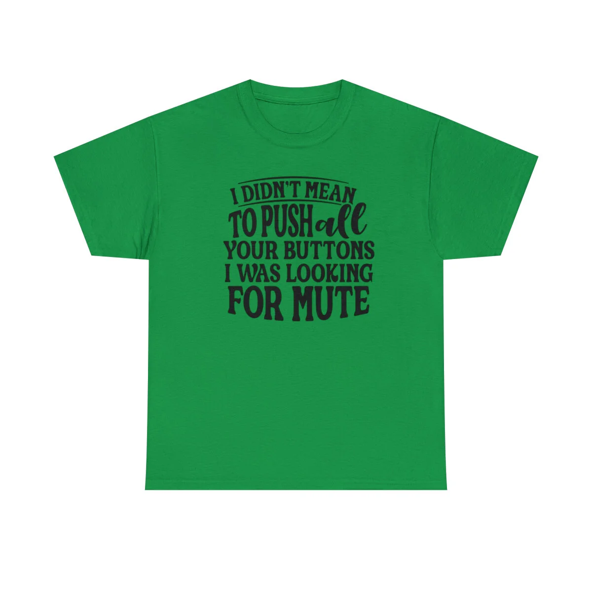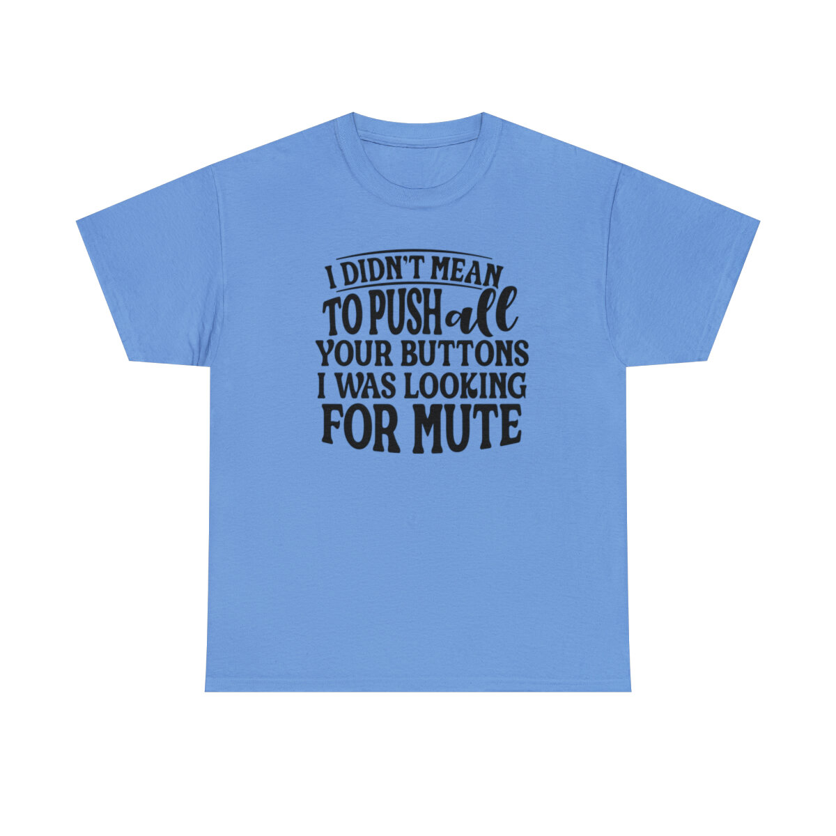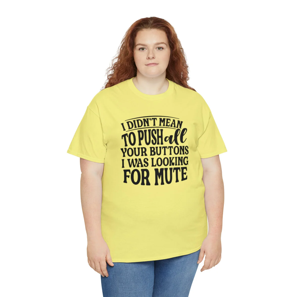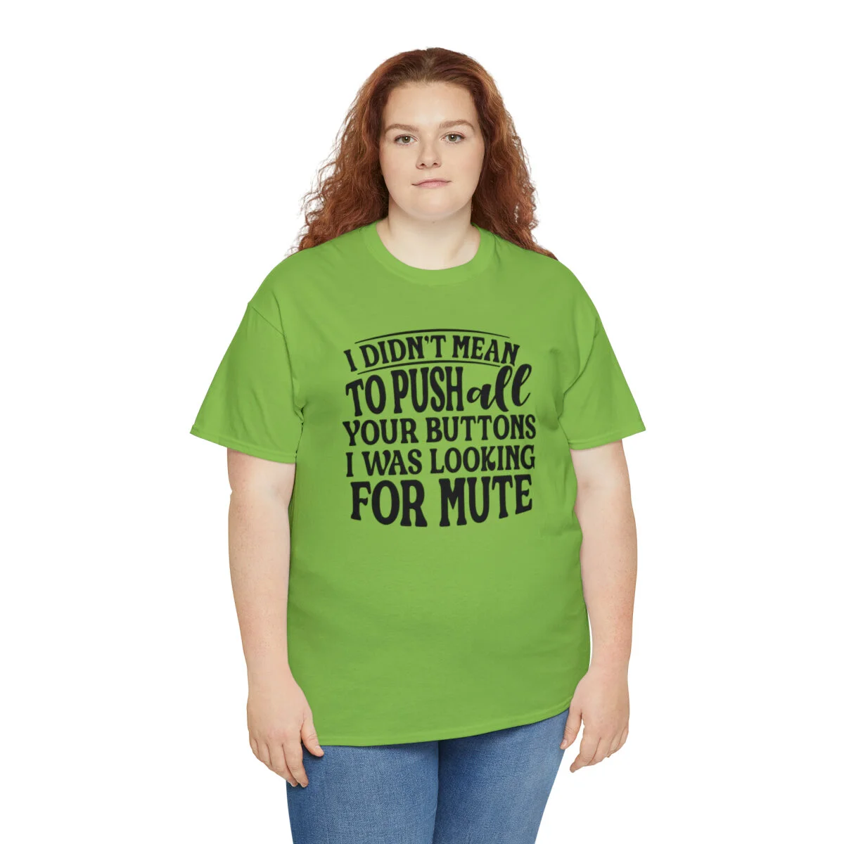 Crafted with care, this t-shirt is made from high-quality fabric to ensure exceptional comfort and durability. The design features the clever phrase, "I didn't mean to push all your buttons, I was looking for mute," creatively displayed in multiple colors. Choose from a variety of vibrant options to match your personal style.