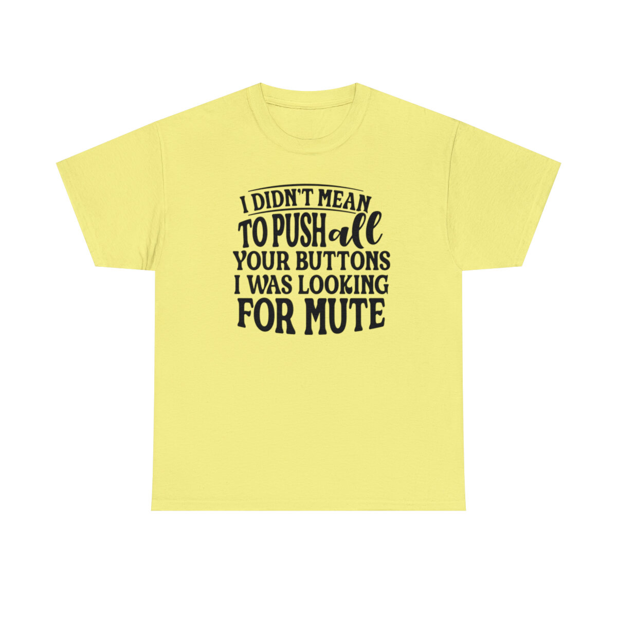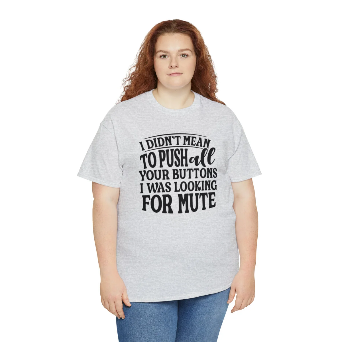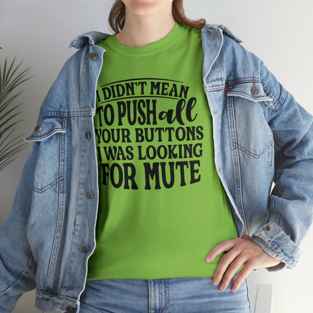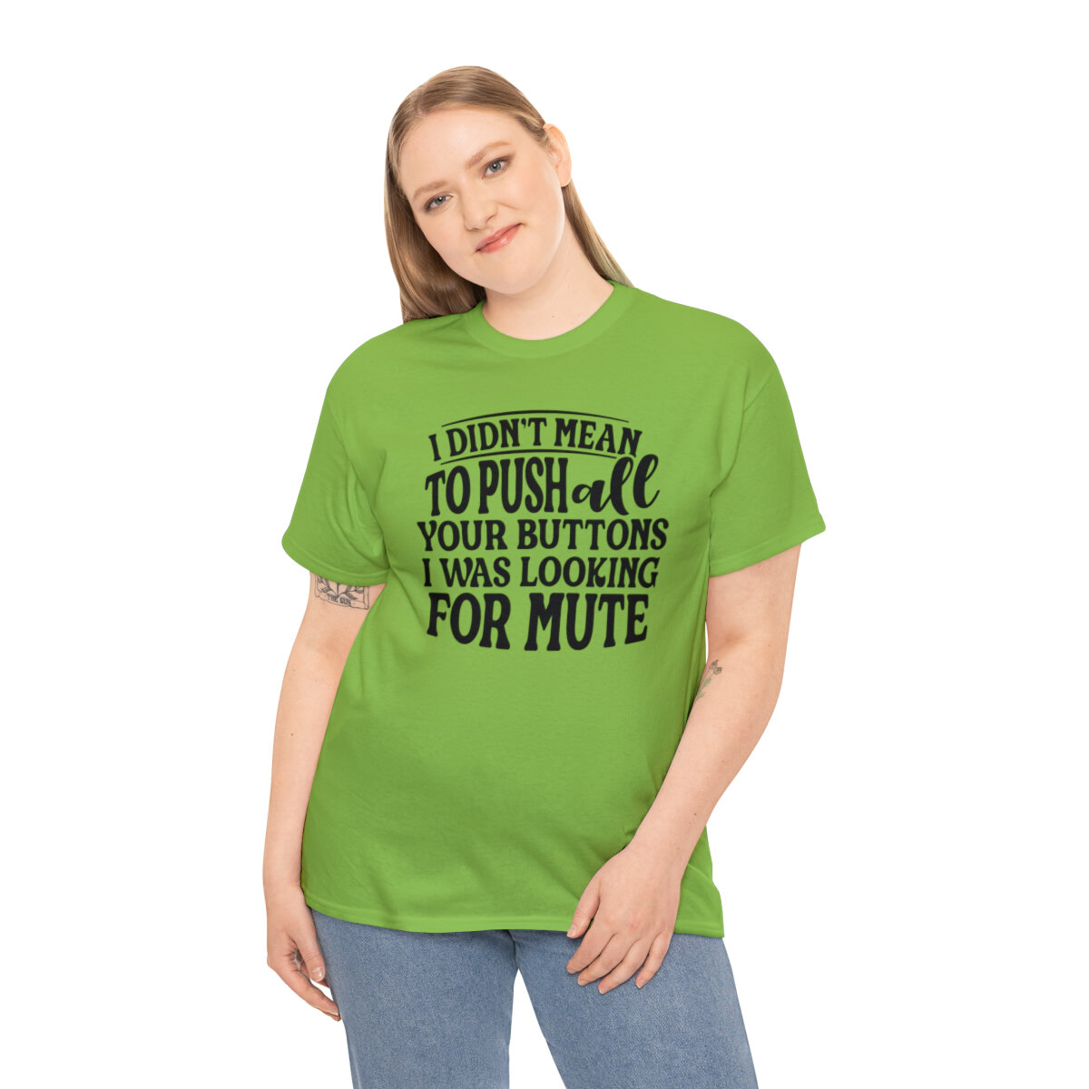 Crafted with care, this t-shirt is made from high-quality fabric to ensure exceptional comfort and durability. The design features the clever phrase, "I didn't mean to push all your buttons, I was looking for mute," creatively displayed in multiple colors. Choose from a variety of vibrant options to match your personal style.