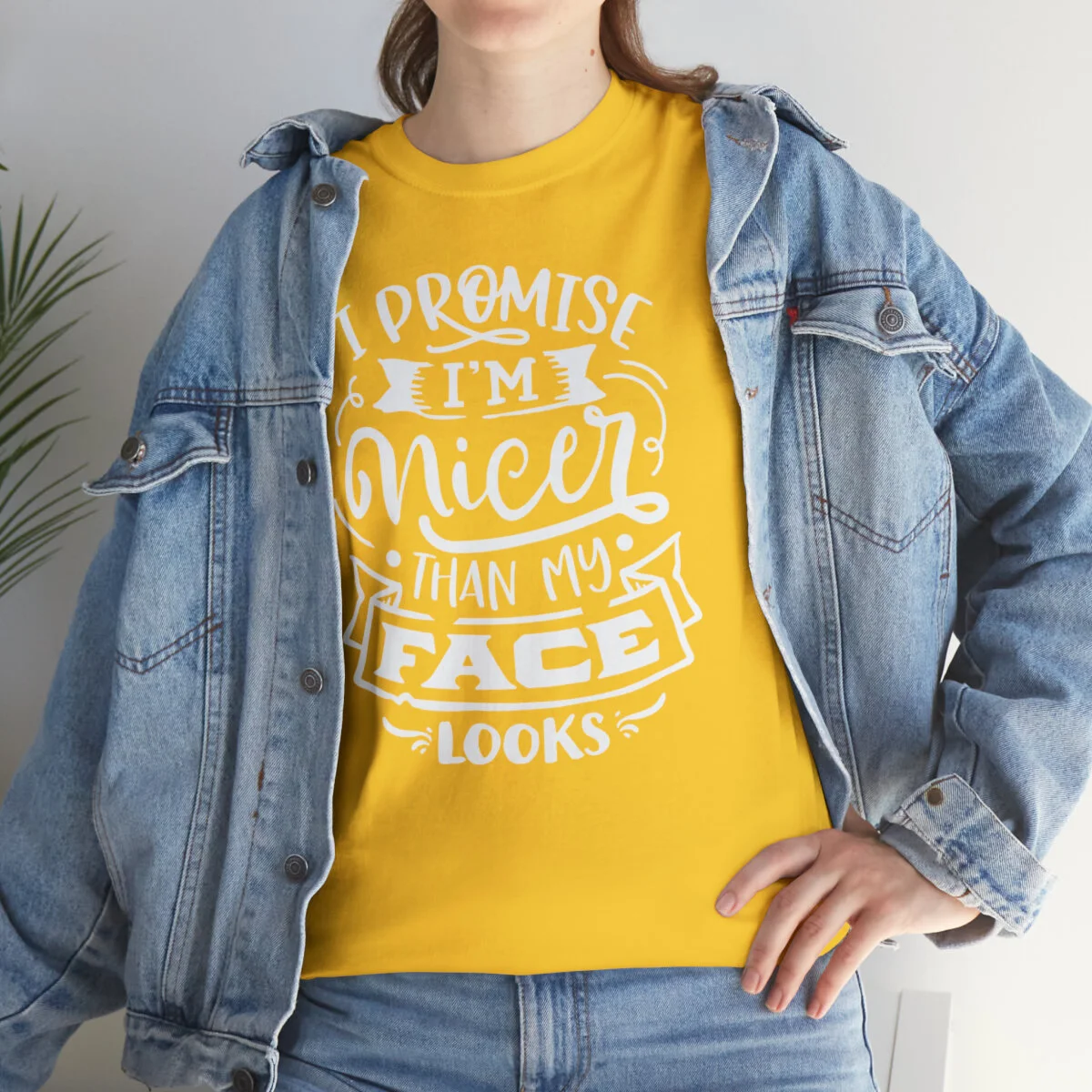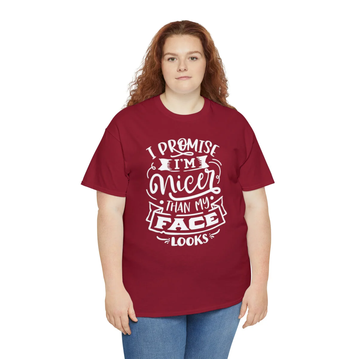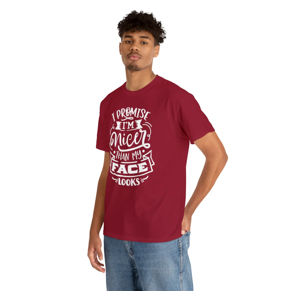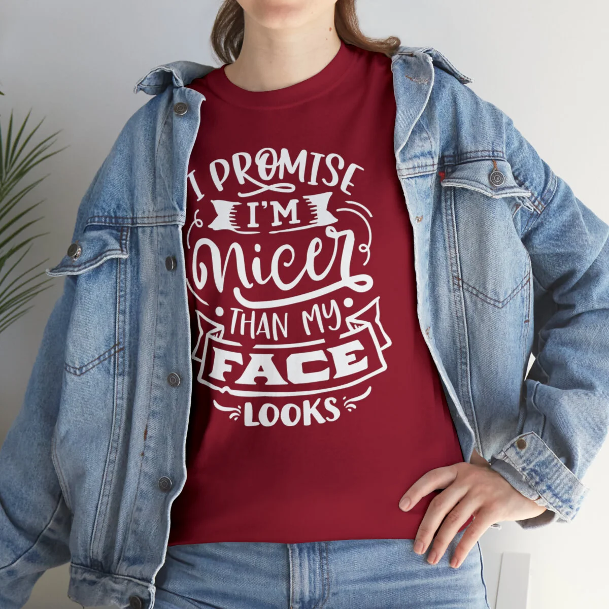 Crafted with care, this t-shirt is made from high-quality fabric for ultimate comfort and durability. The minimalist design features the bold statement, "I promise I'm nicer than my face looks..." elegantly displayed in black font on a variety of vibrant colors. The contrasting colors and sleek typography make for a visually striking combination that is sure to grab attention.