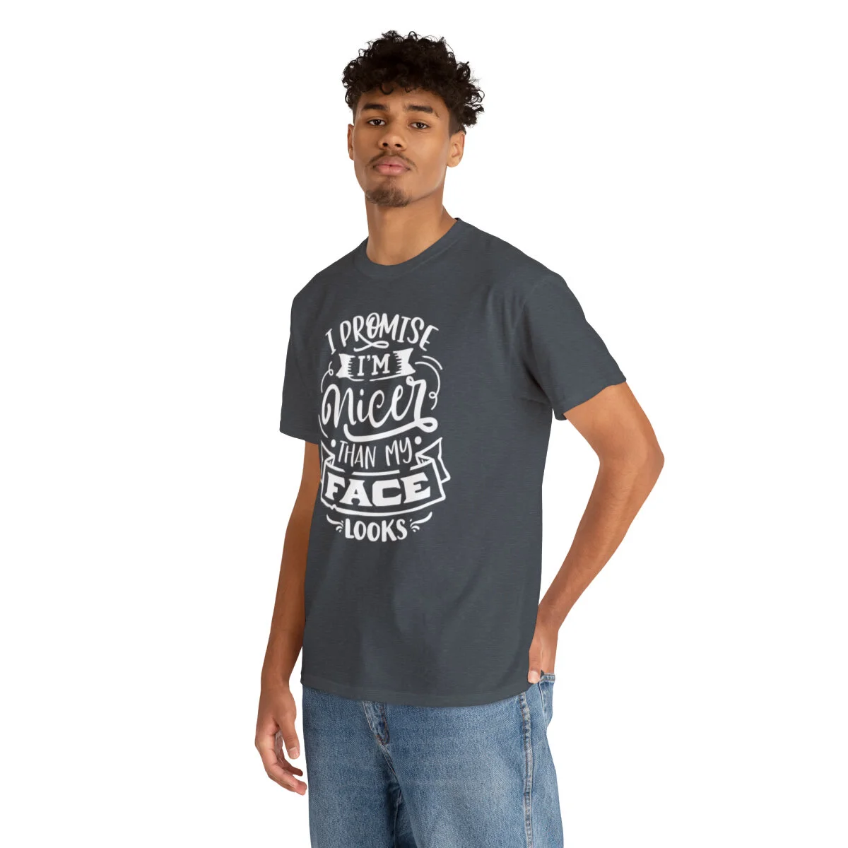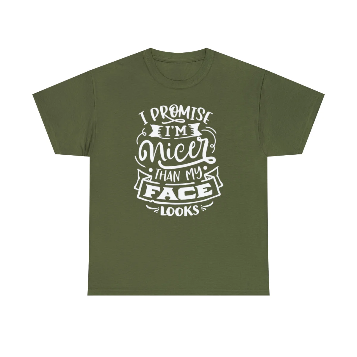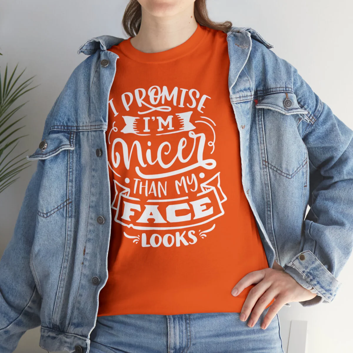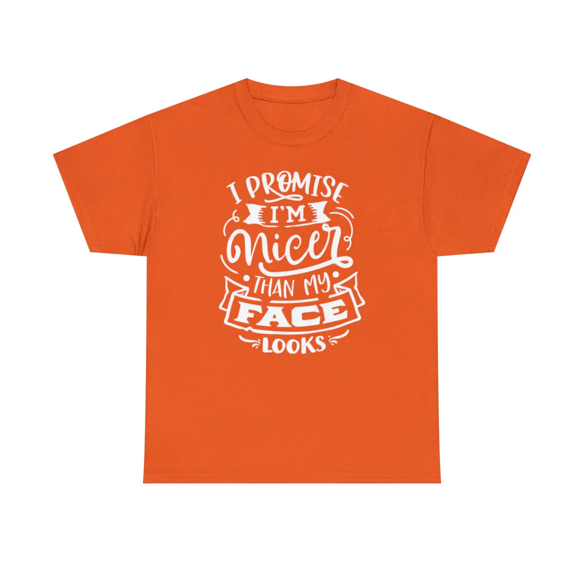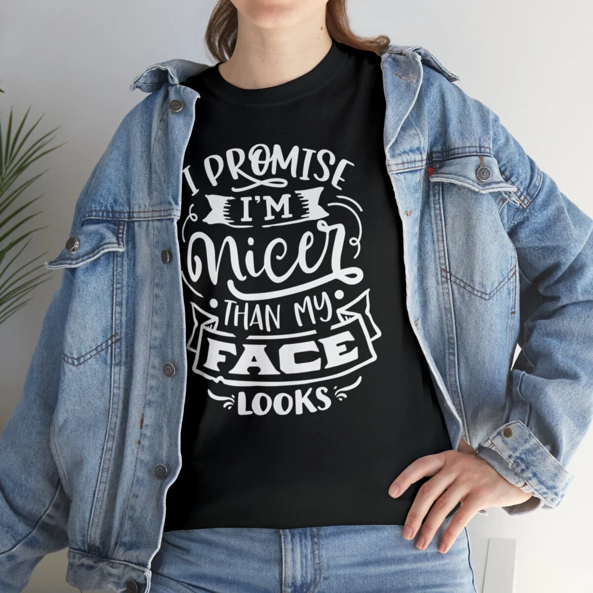 Crafted with care, this t-shirt is made from high-quality fabric for ultimate comfort and durability. The minimalist design features the bold statement, "I promise I'm nicer than my face looks..." elegantly displayed in black font on a variety of vibrant colors. The contrasting colors and sleek typography make for a visually striking combination that is sure to grab attention.