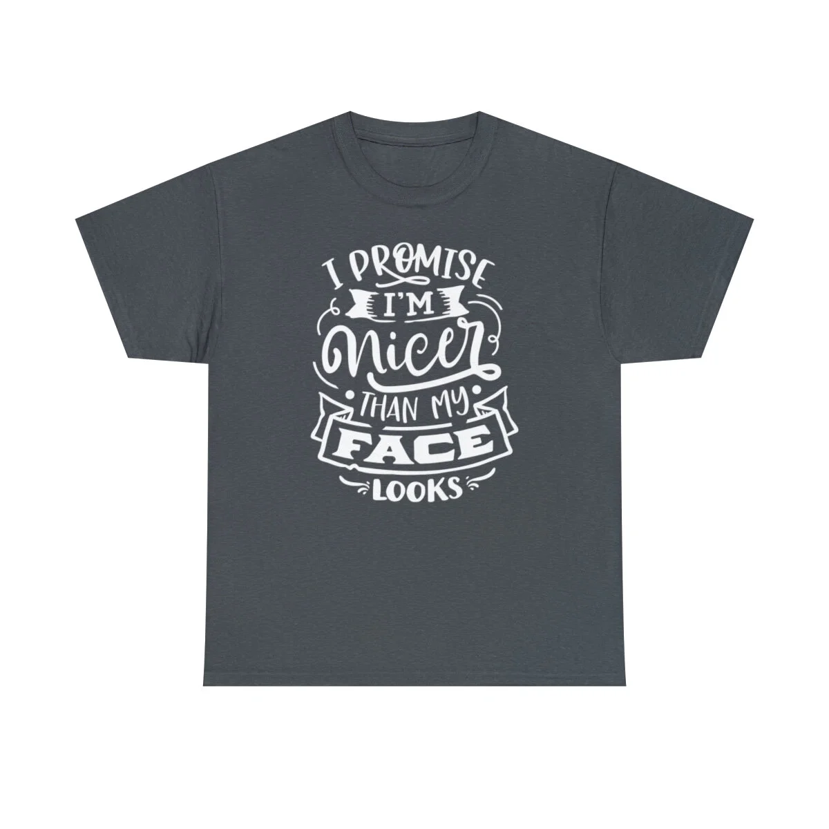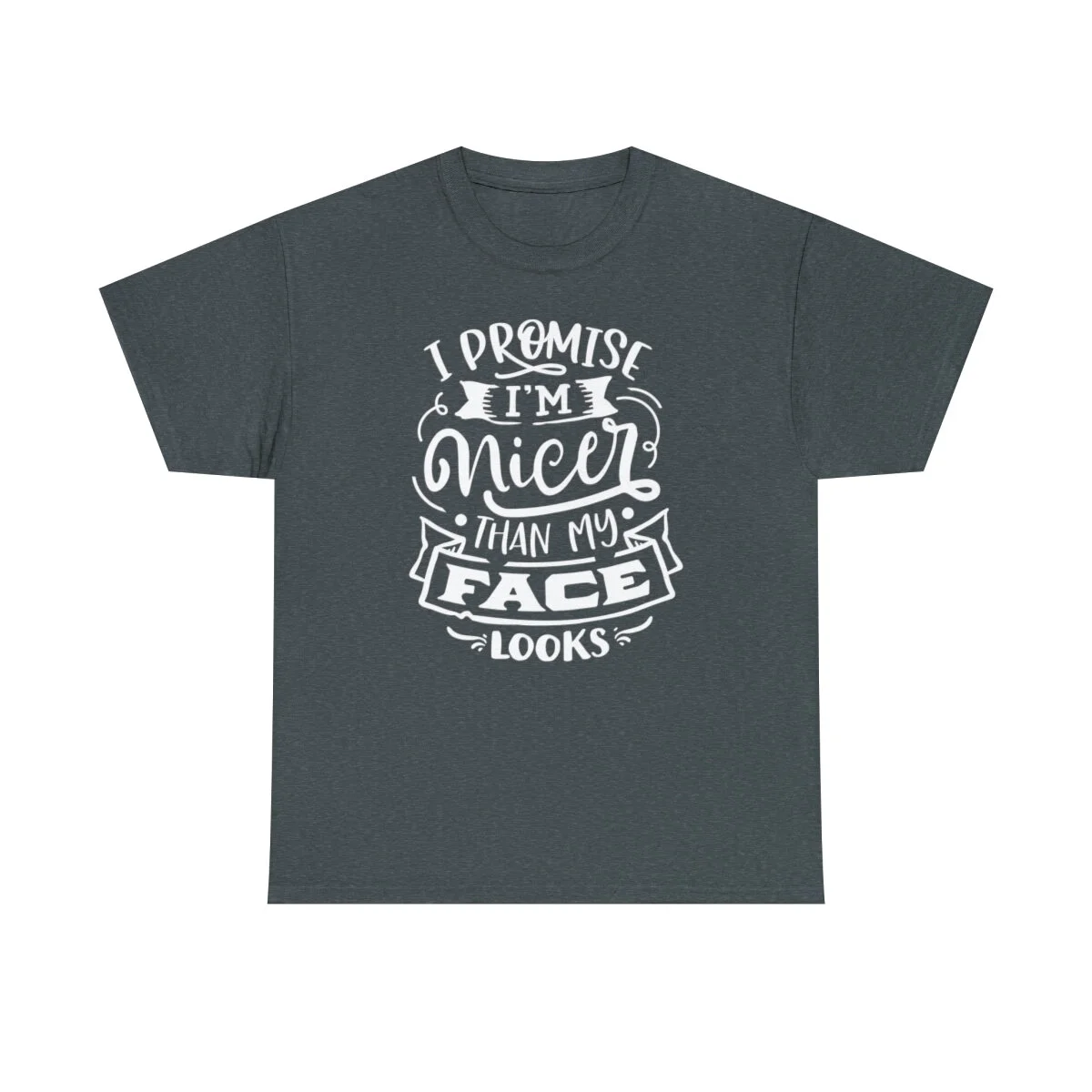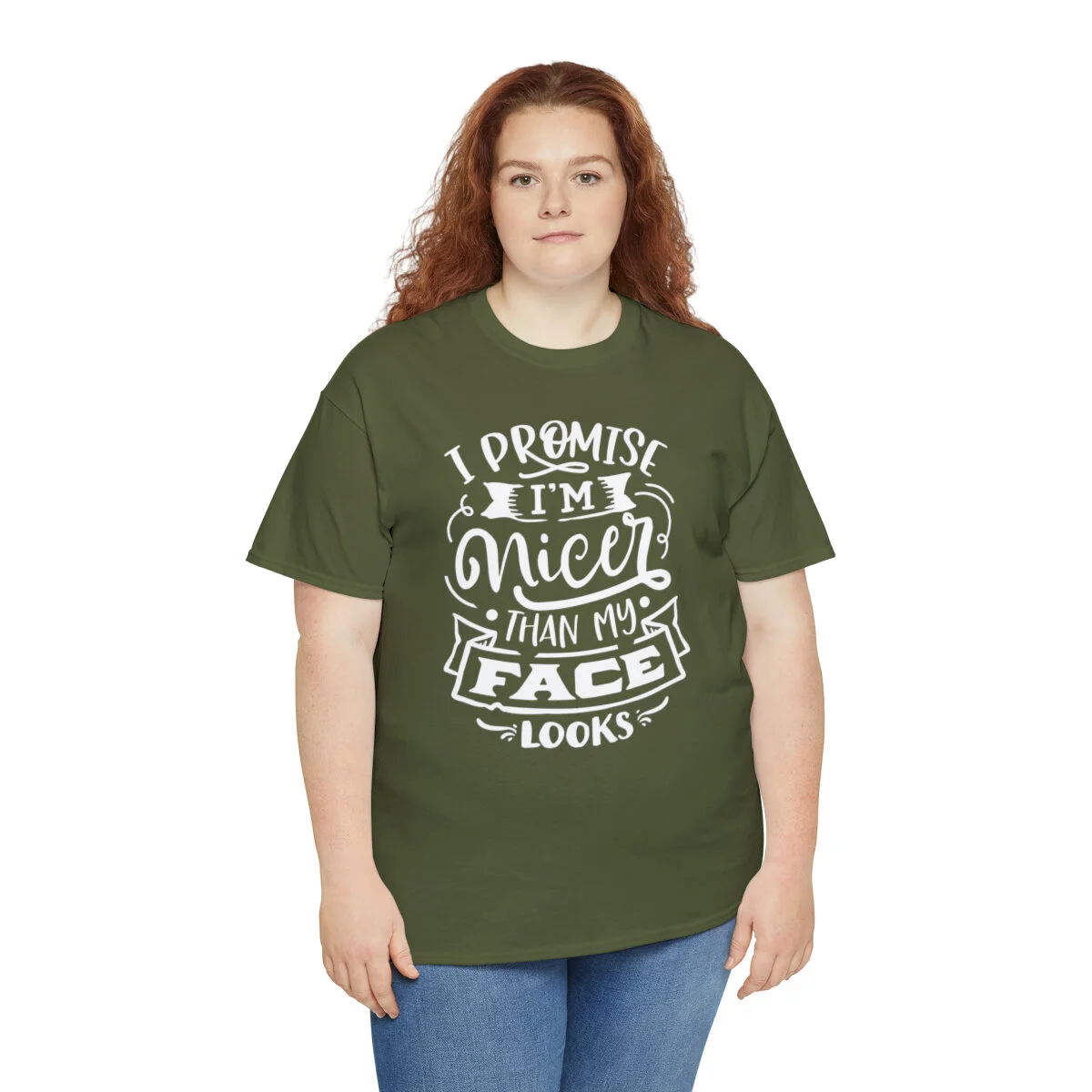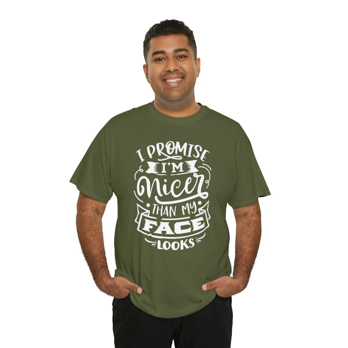 Crafted with care, this t-shirt is made from high-quality fabric for ultimate comfort and durability. The minimalist design features the bold statement, "I promise I'm nicer than my face looks..." elegantly displayed in black font on a variety of vibrant colors. The contrasting colors and sleek typography make for a visually striking combination that is sure to grab attention.