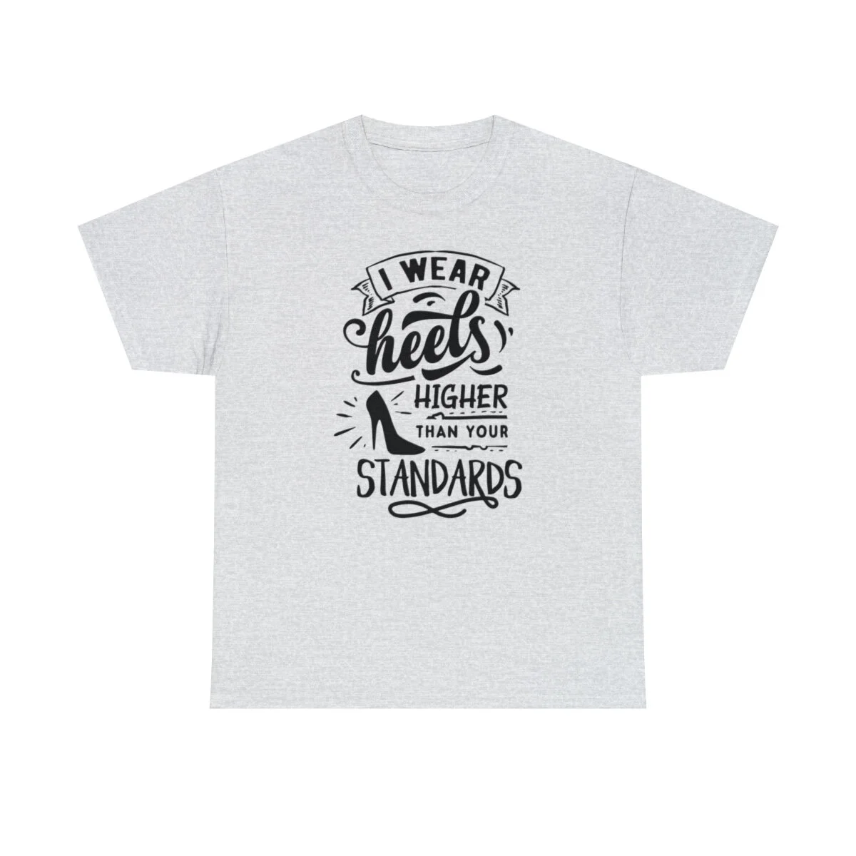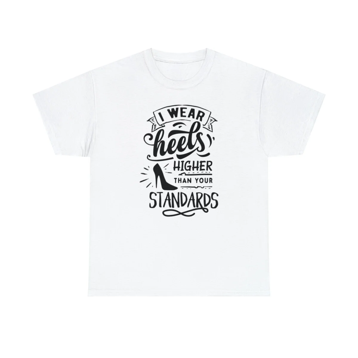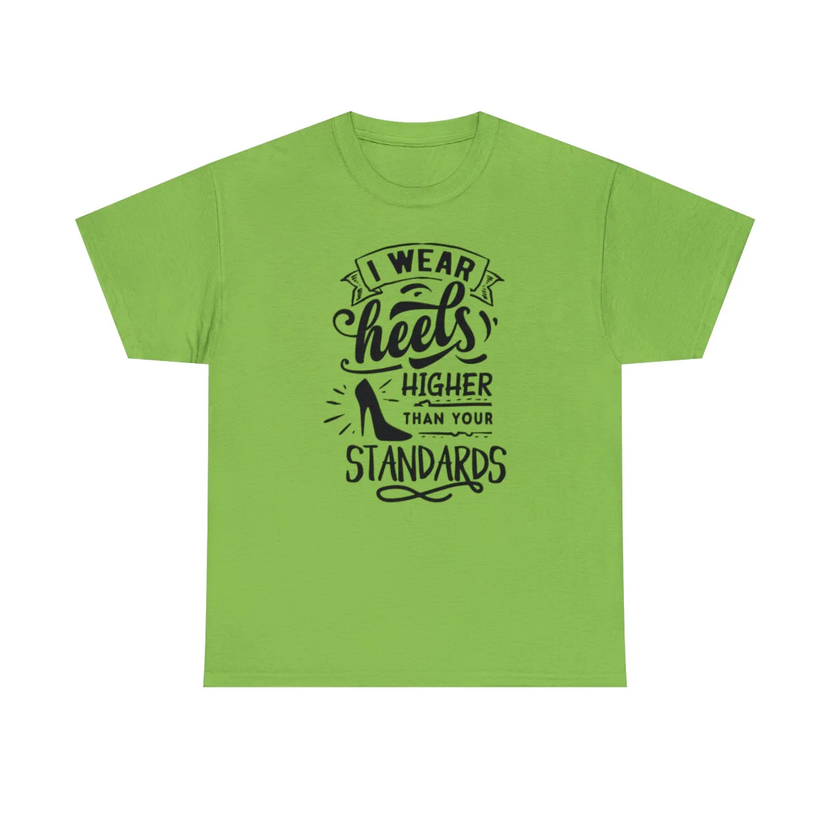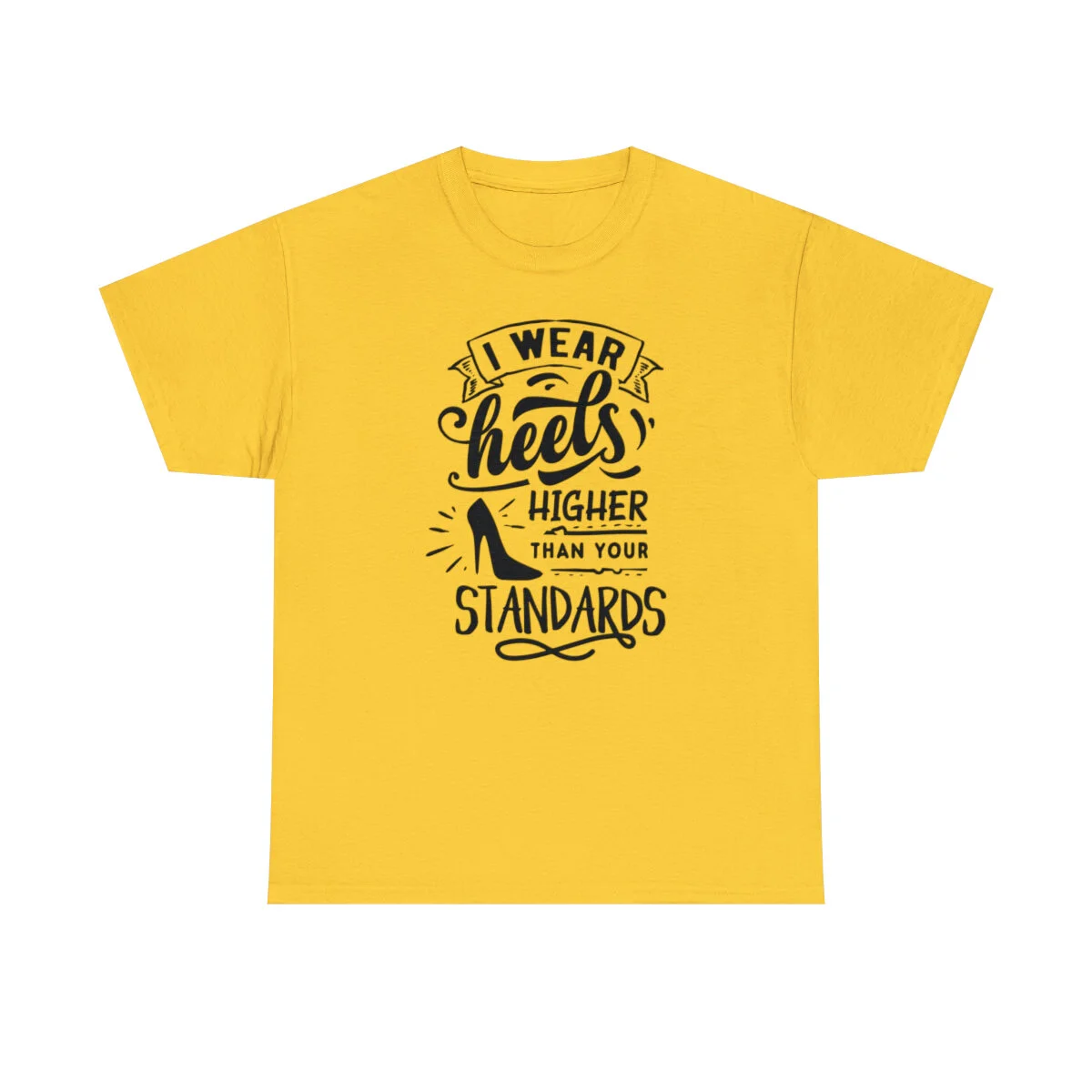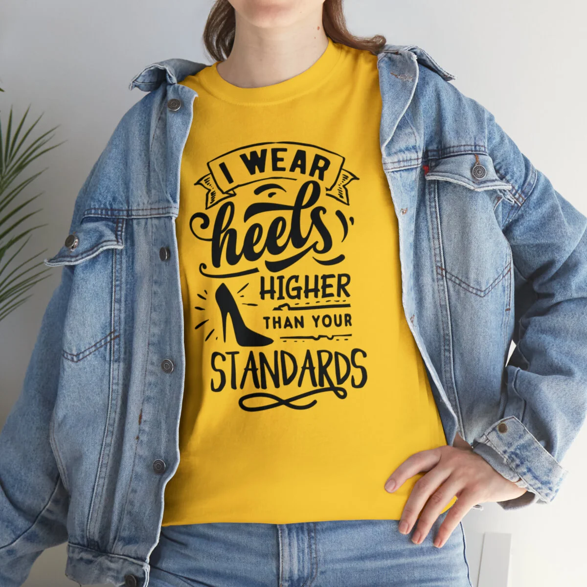 "I wear heels higher than your standards" Sarcastic T Shirt.