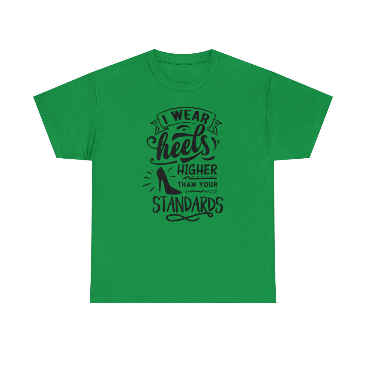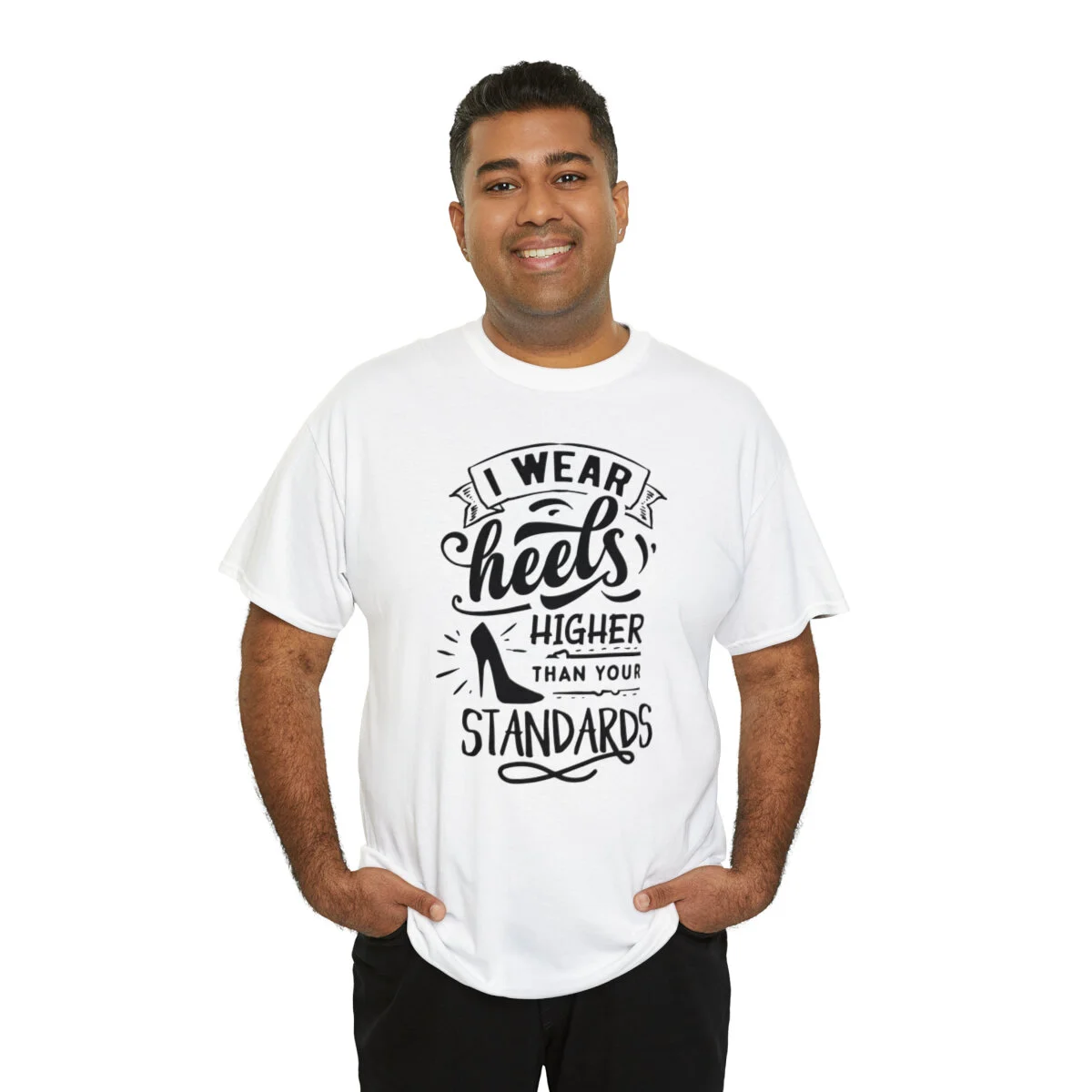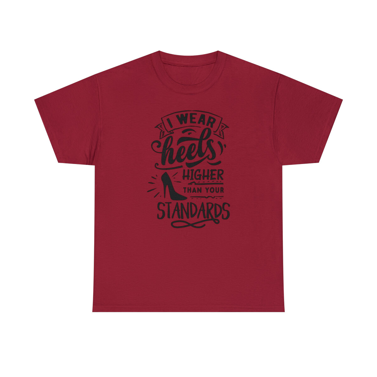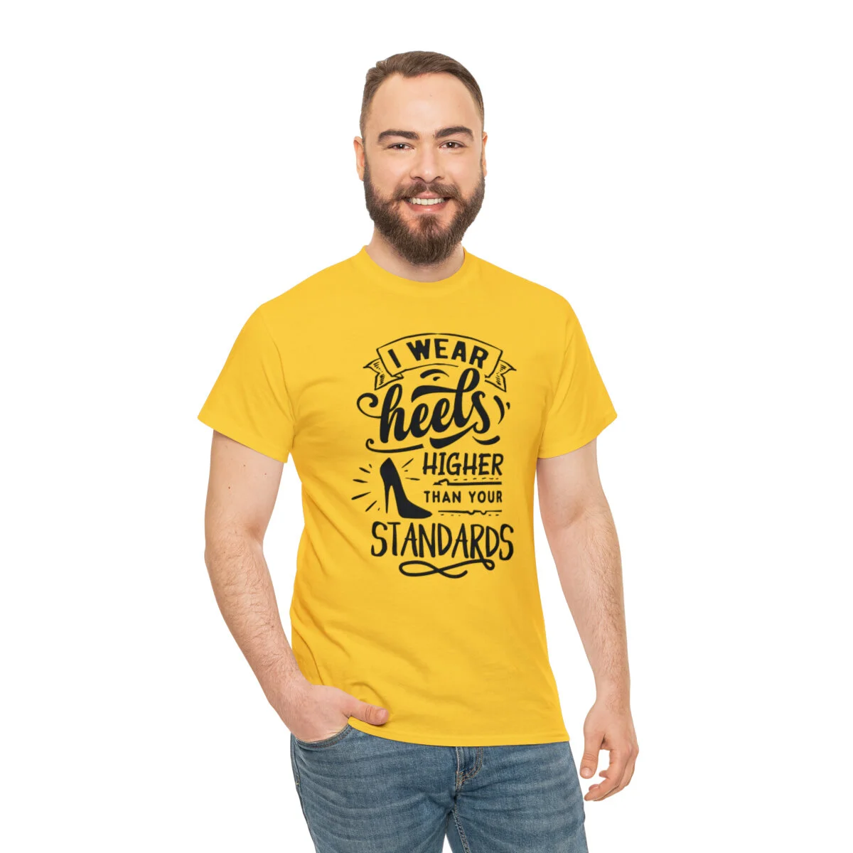 "I wear heels higher than your standards" Sarcastic T Shirt.