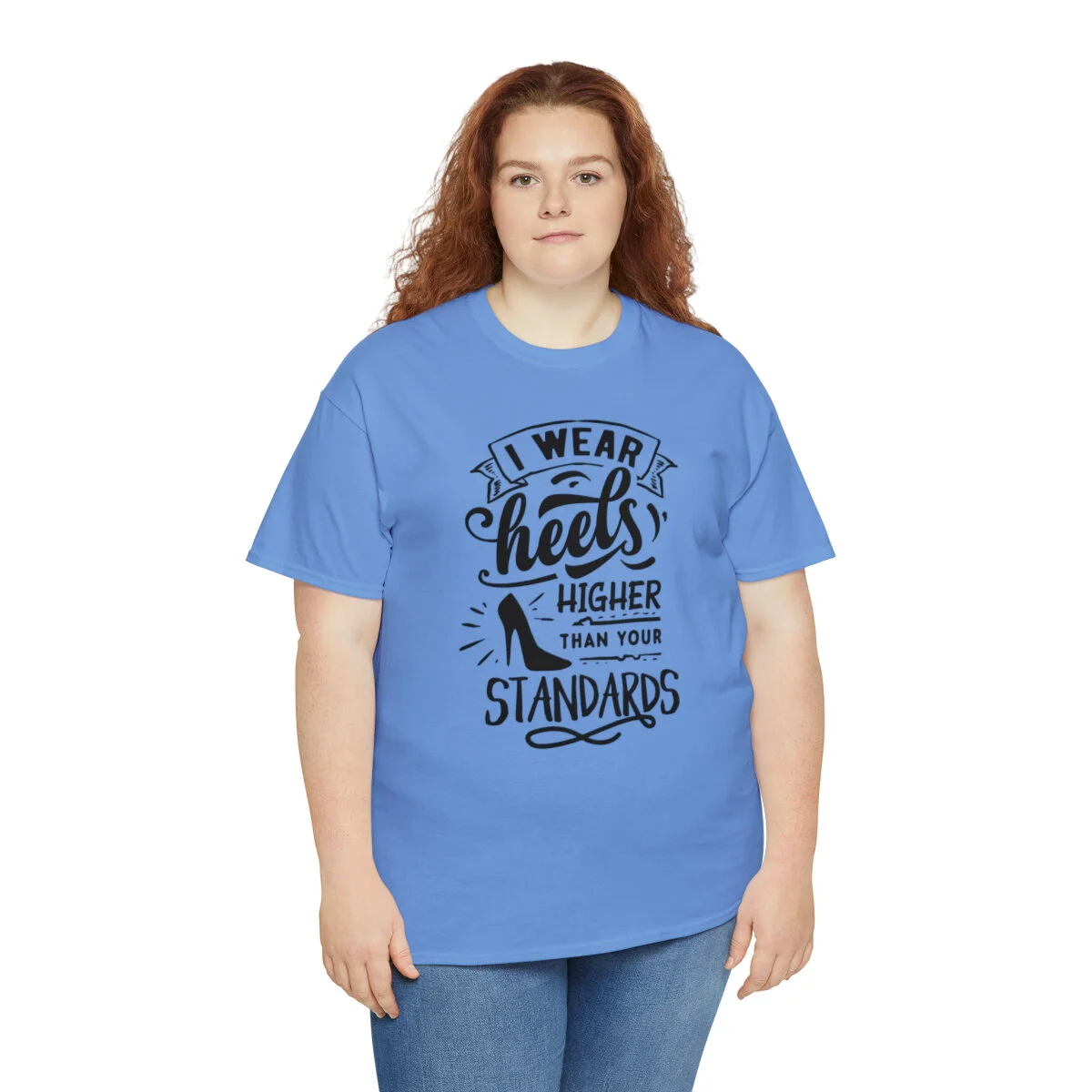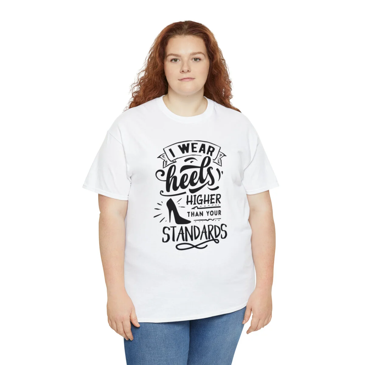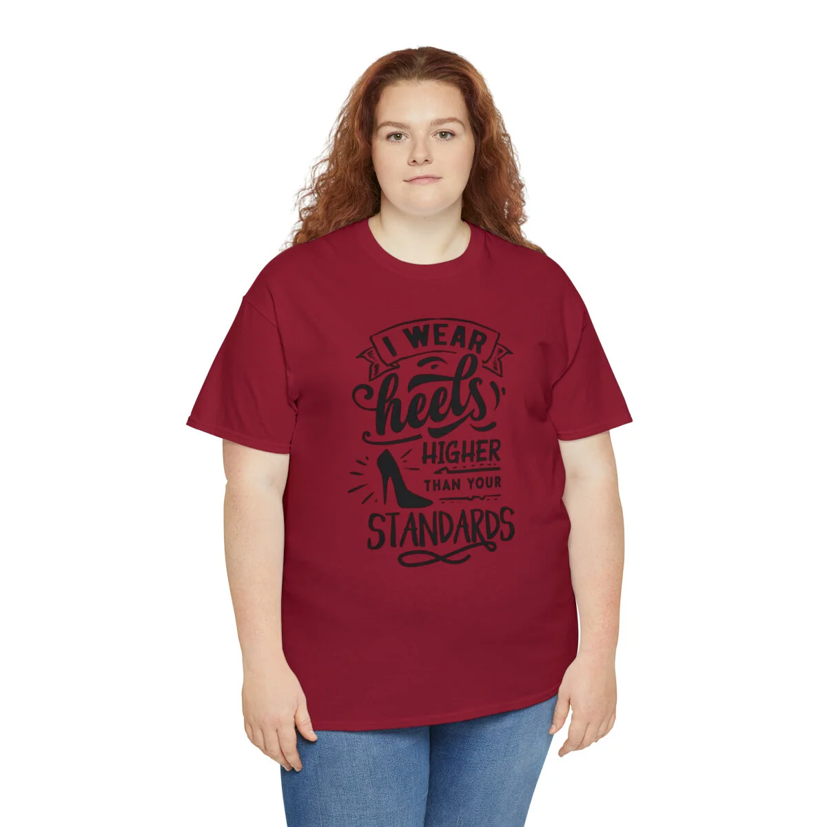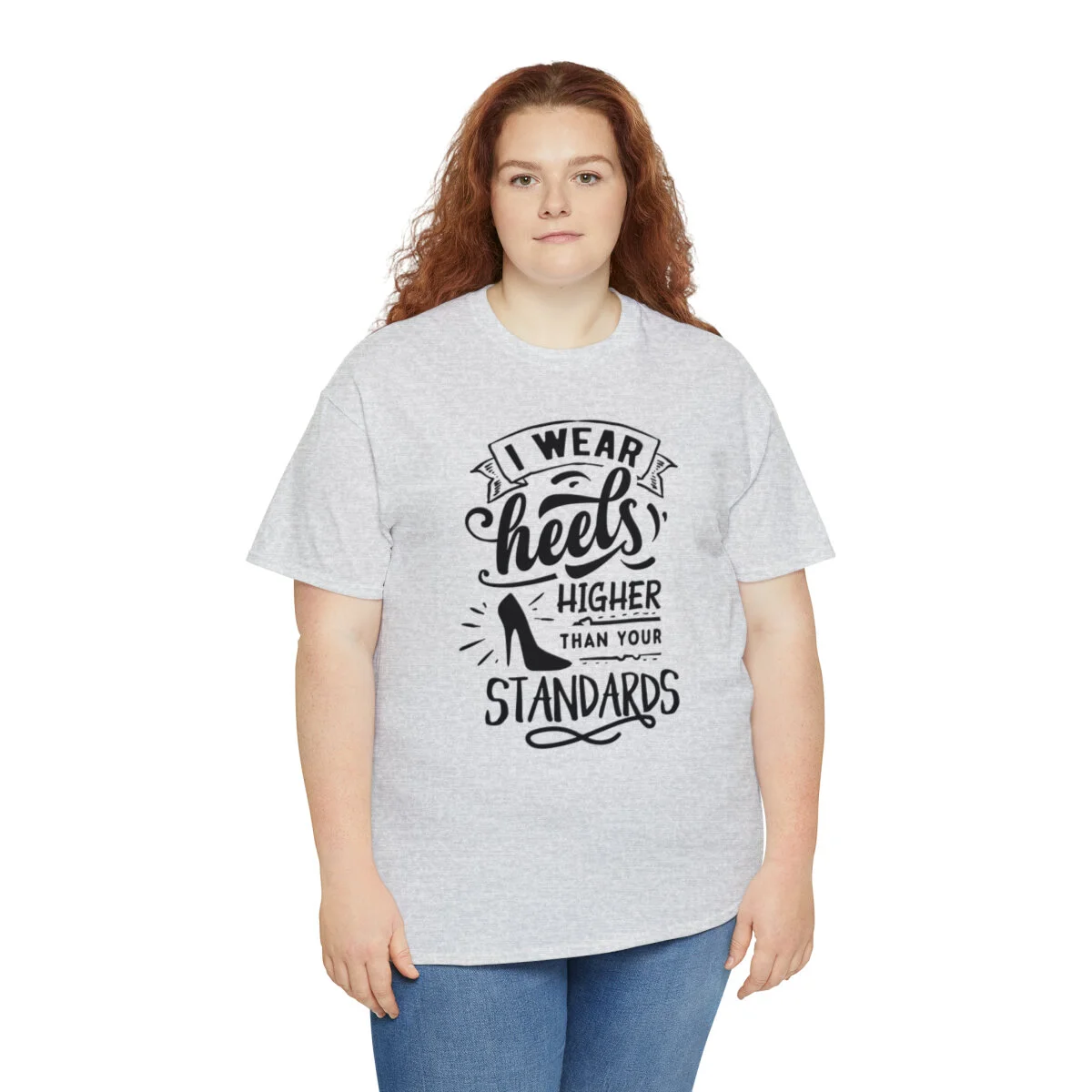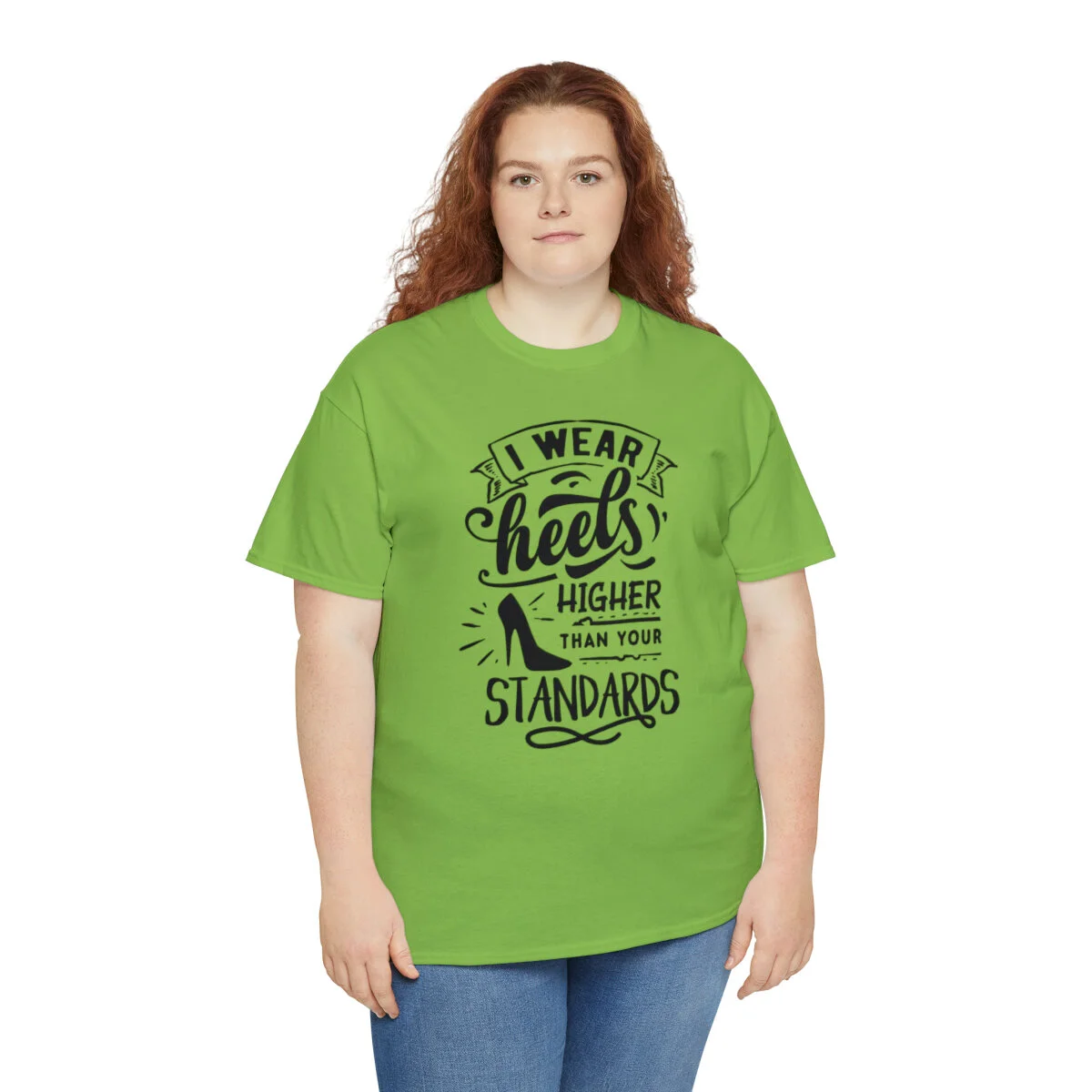 "I wear heels higher than your standards" Sarcastic T Shirt.