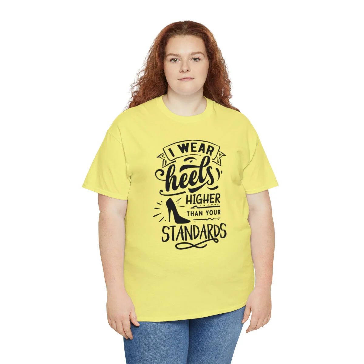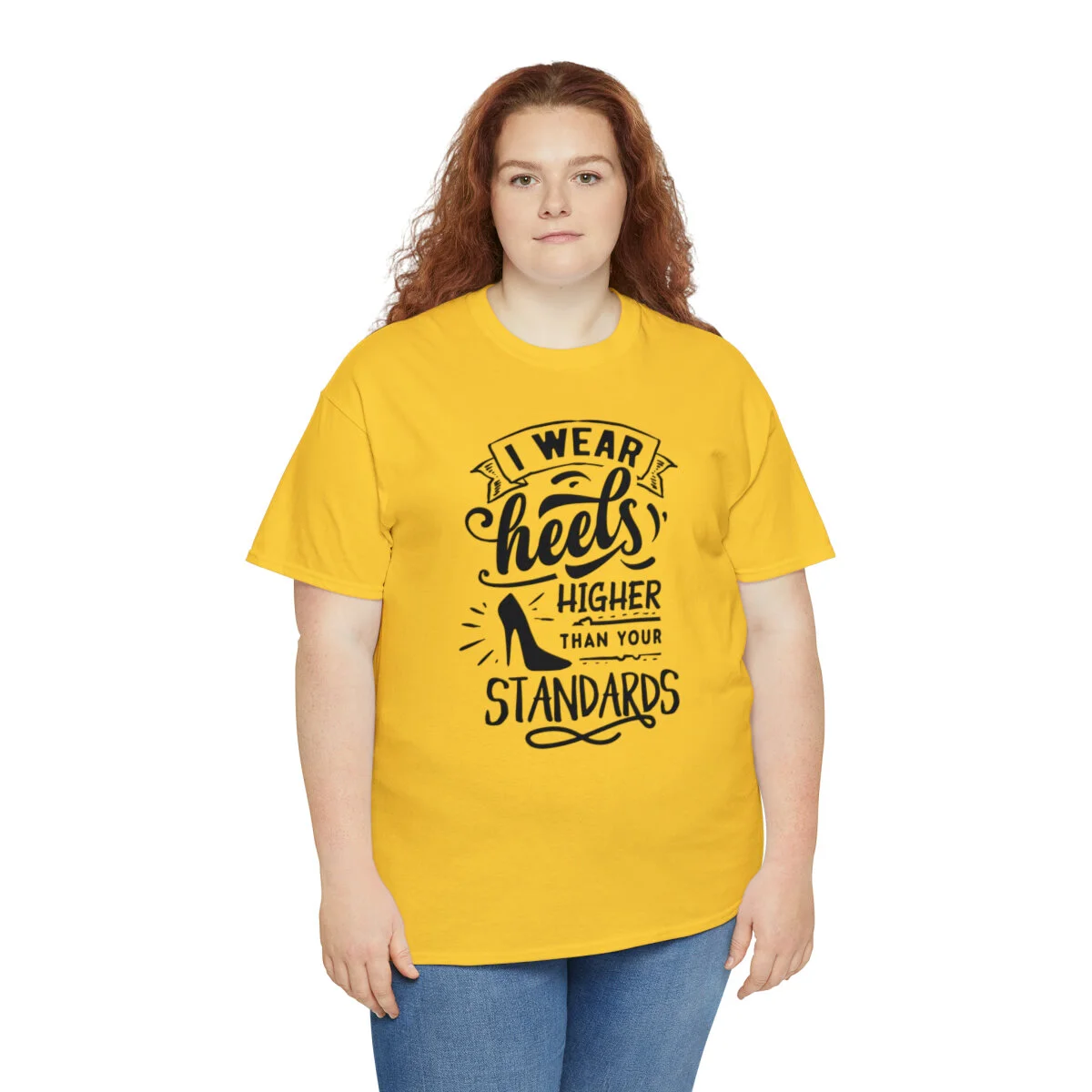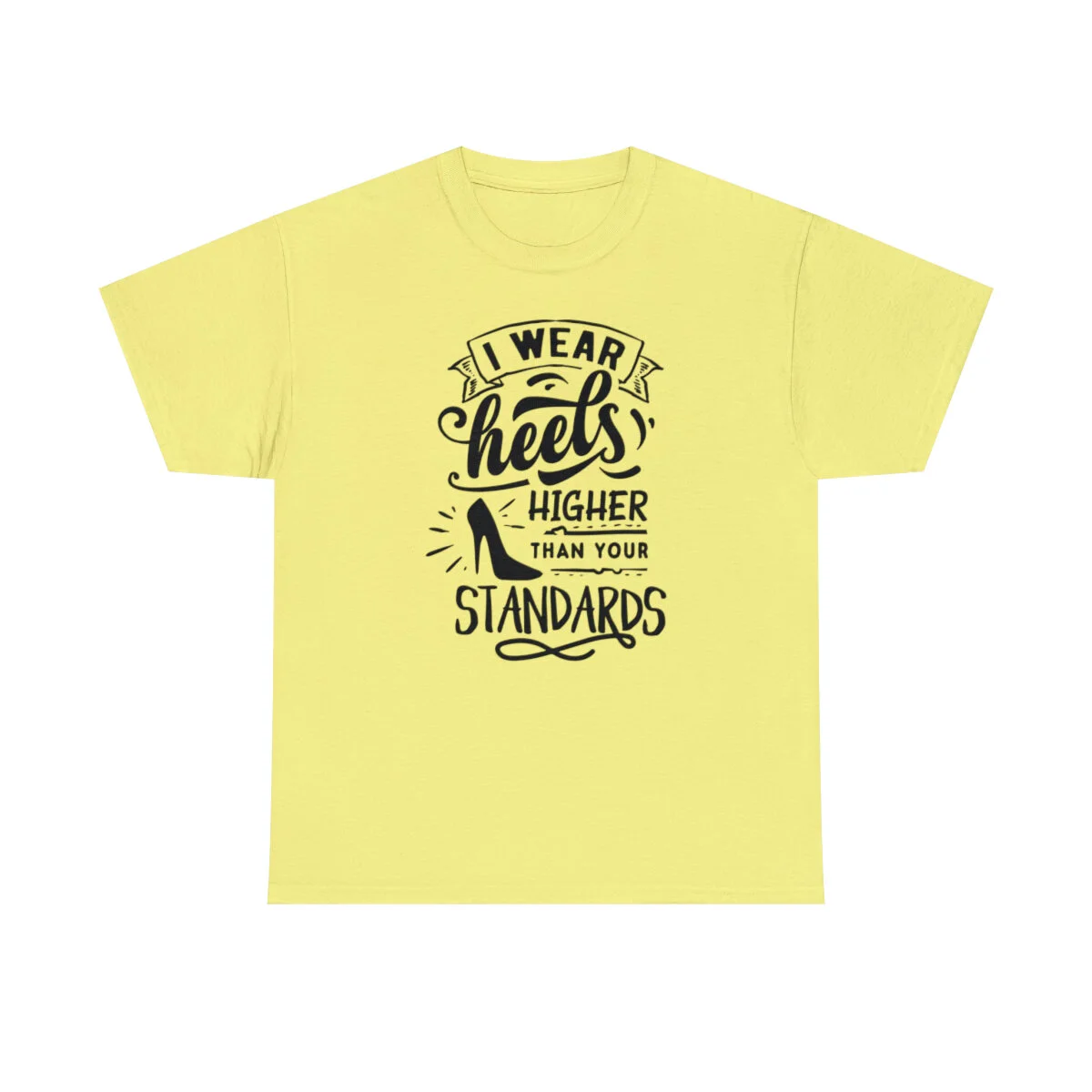 Crafted with utmost care, this t-shirt is made from high-quality fabric, ensuring exceptional comfort and durability. The design features the bold and empowering phrase, "I wear heels higher than your standards," elegantly displayed in black font on a range of vibrant colors. The striking contrast between the font and the background creates a visually captivating effect that demands attention.