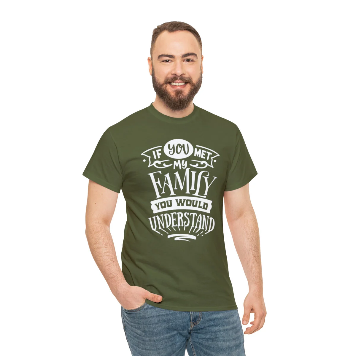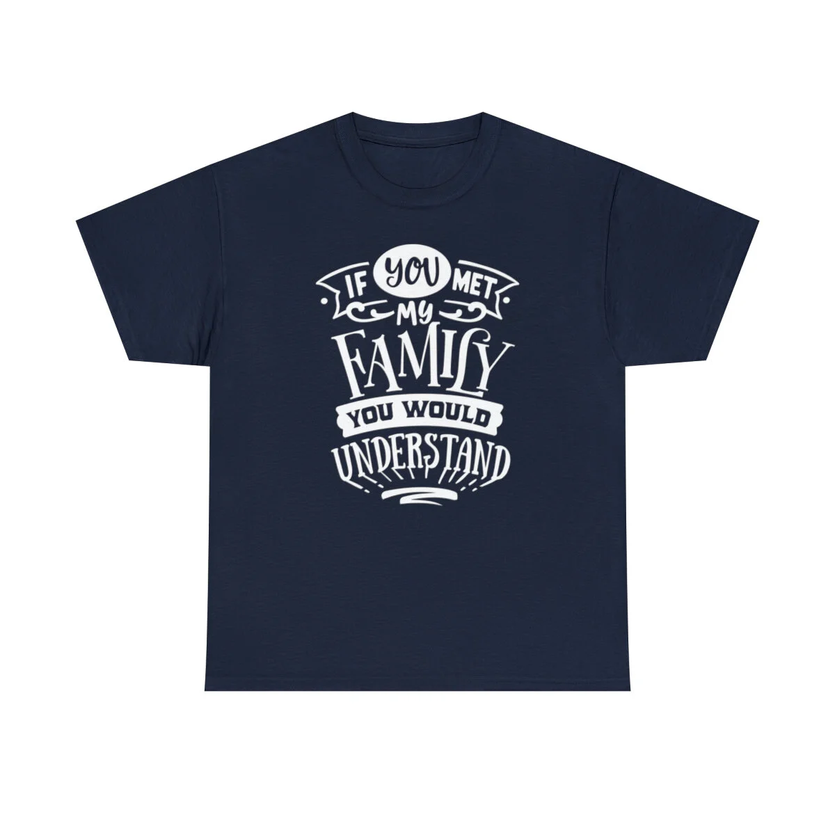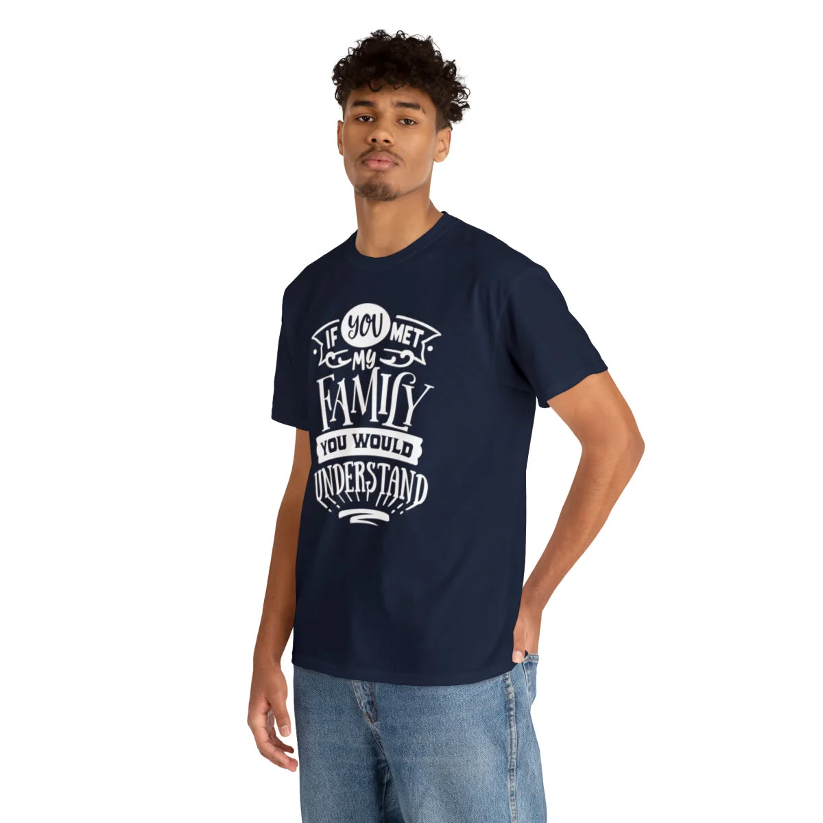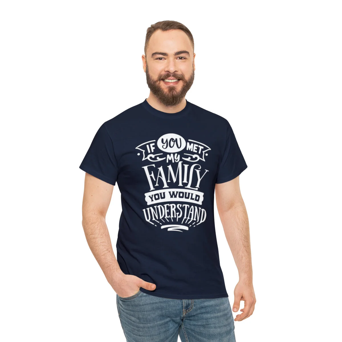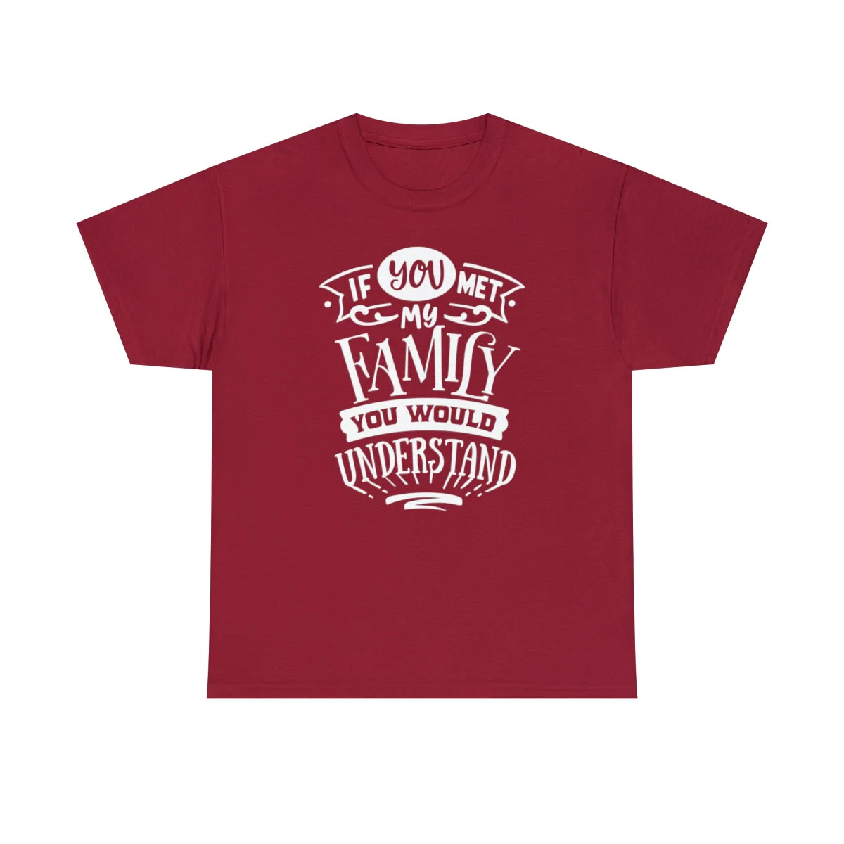 Crafted with care, this t-shirt is made from high-quality fabric to ensure exceptional comfort and durability. The design features the witty phrase, "If you met my family, you'd understand," elegantly displayed in multiple colors. Choose from a variety of vibrant options, including red, blue, yellow, and classic black and white, to find the hue that best matches your style and personality.