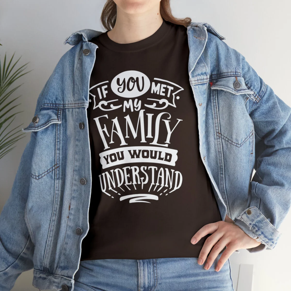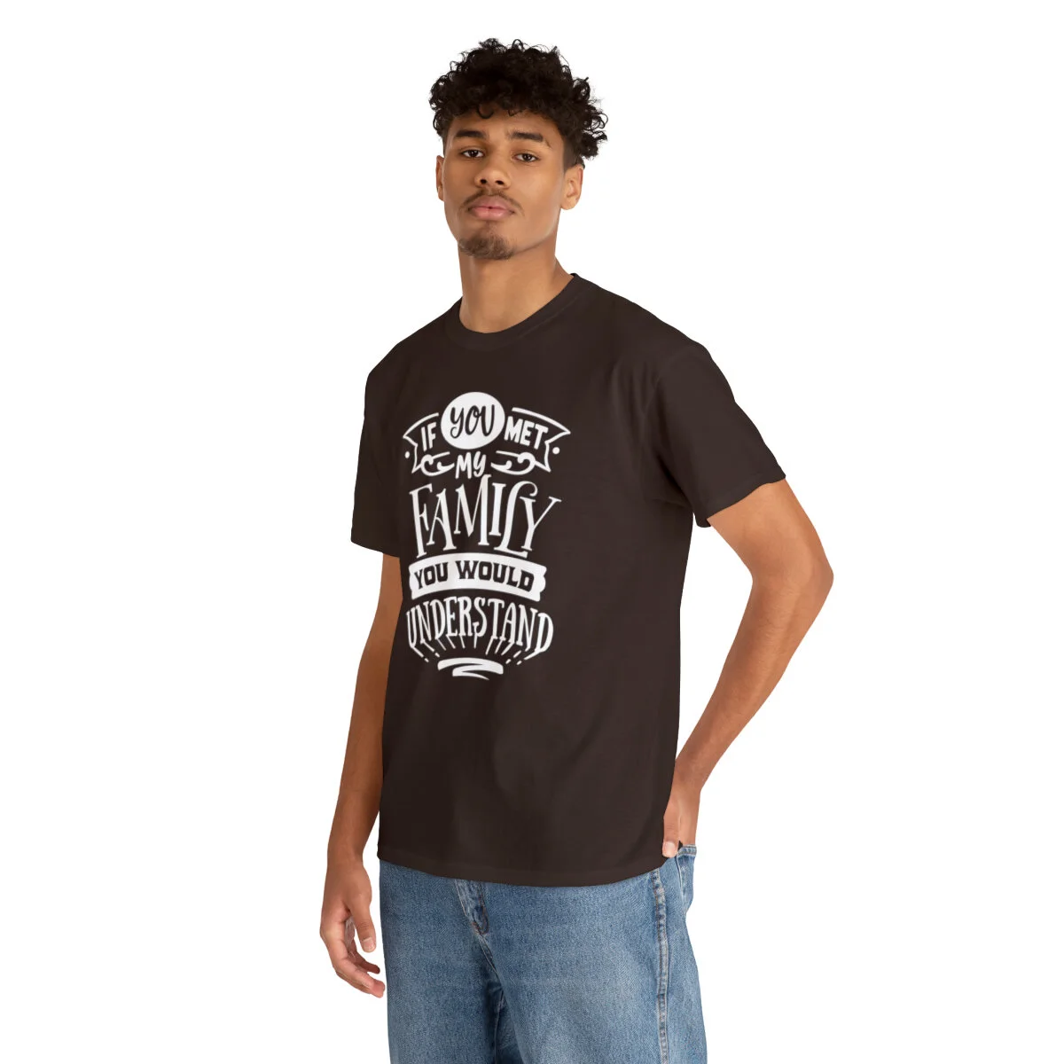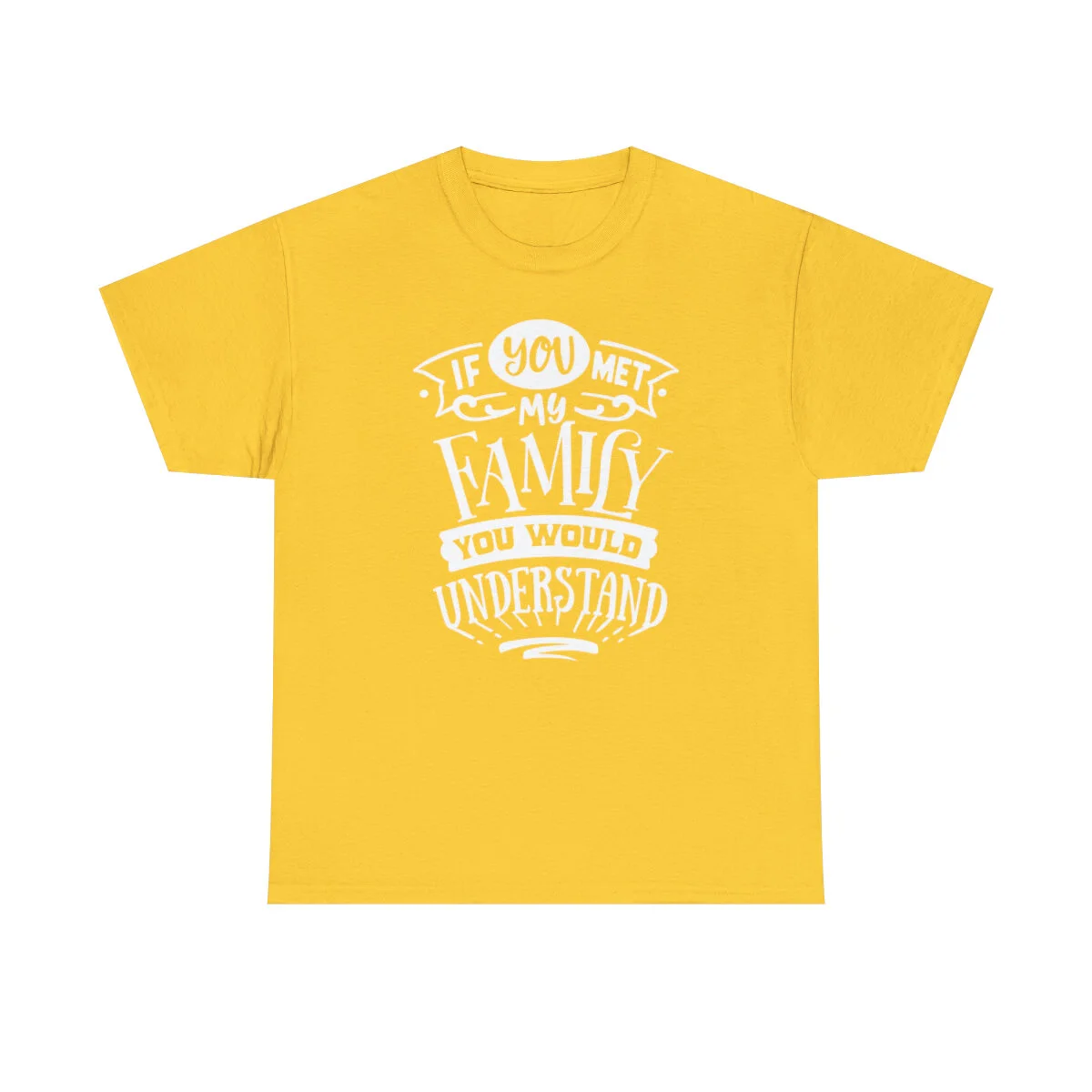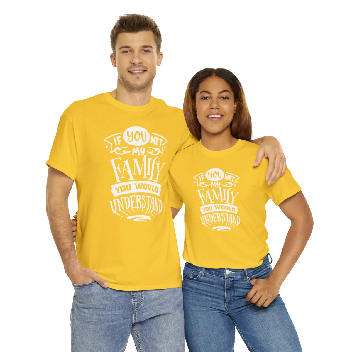 Crafted with care, this t-shirt is made from high-quality fabric to ensure exceptional comfort and durability. The design features the witty phrase, "If you met my family, you'd understand," elegantly displayed in multiple colors. Choose from a variety of vibrant options, including red, blue, yellow, and classic black and white, to find the hue that best matches your style and personality.