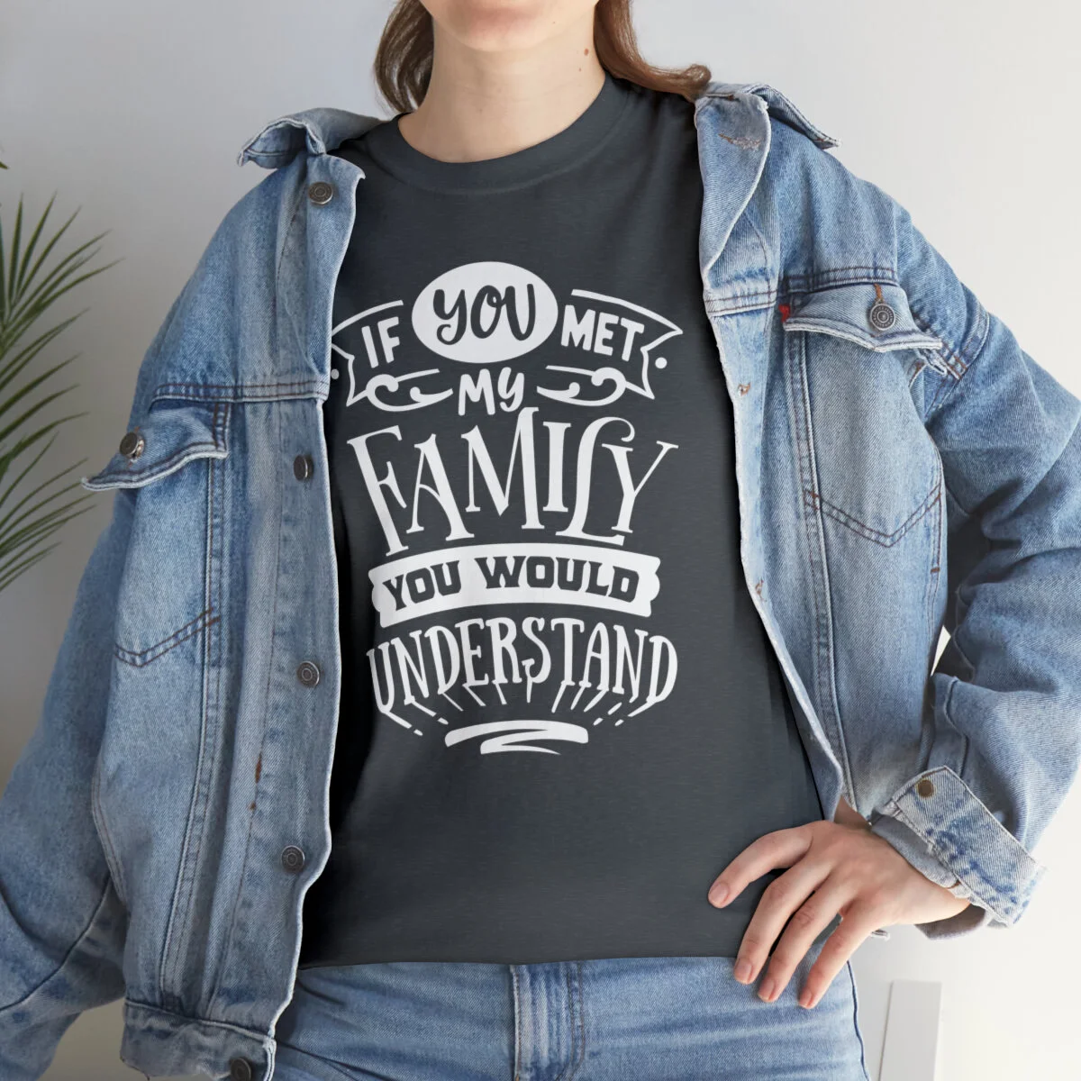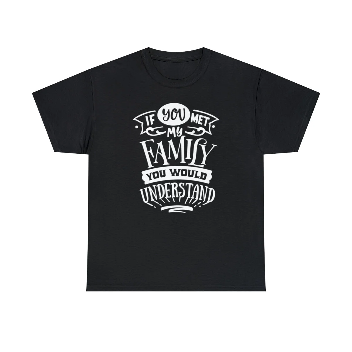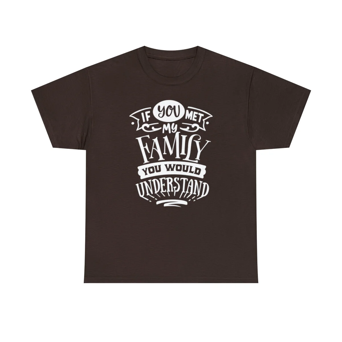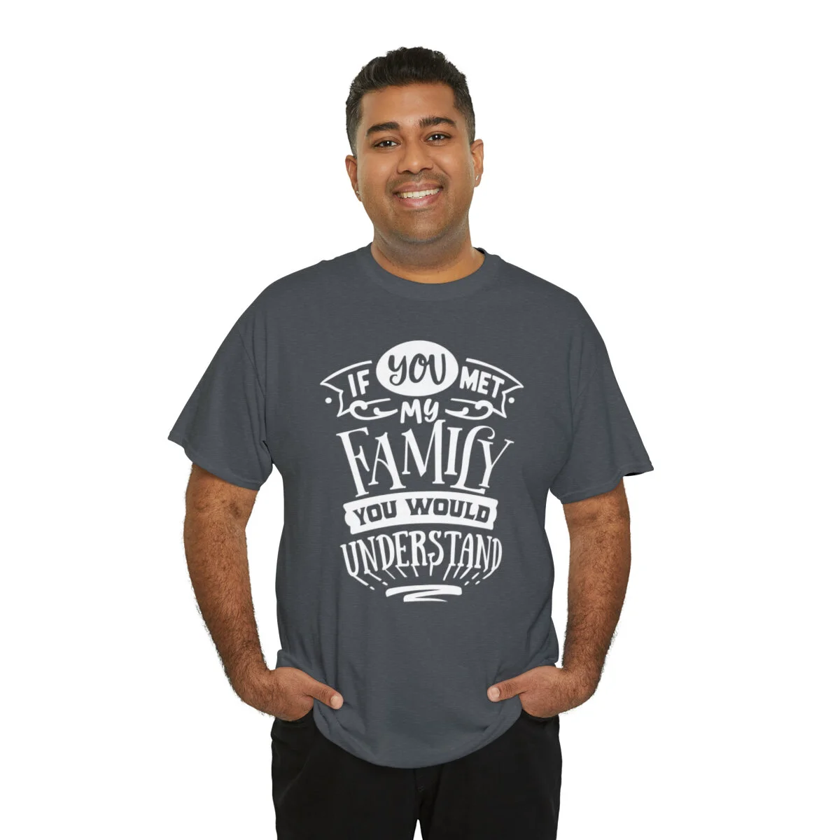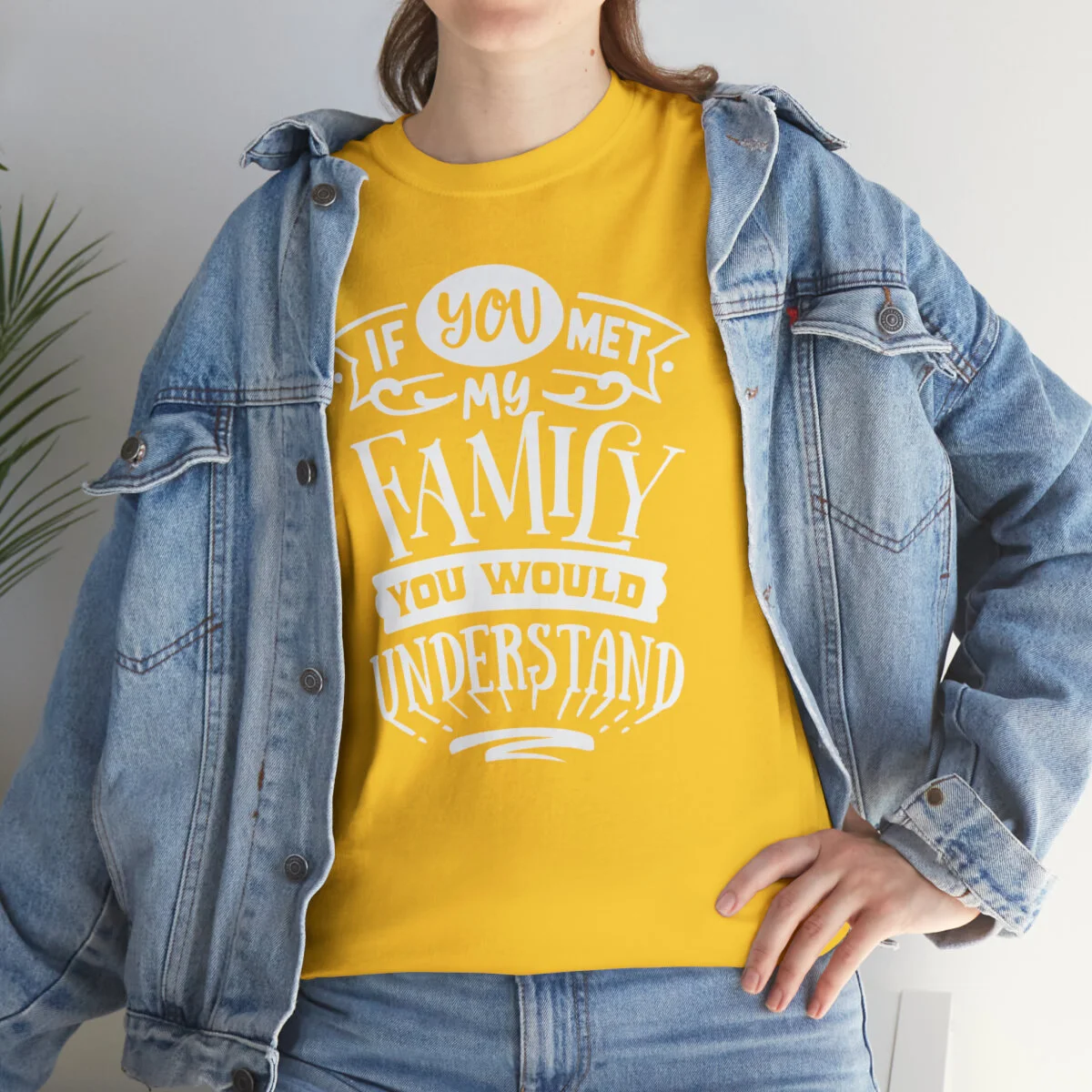 Crafted with care, this t-shirt is made from high-quality fabric to ensure exceptional comfort and durability. The design features the witty phrase, "If you met my family, you'd understand," elegantly displayed in multiple colors. Choose from a variety of vibrant options, including red, blue, yellow, and classic black and white, to find the hue that best matches your style and personality.