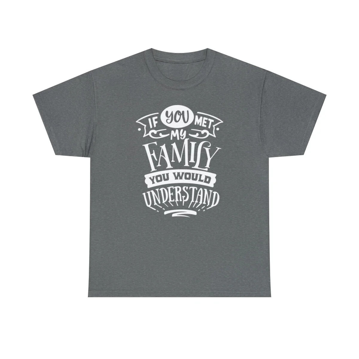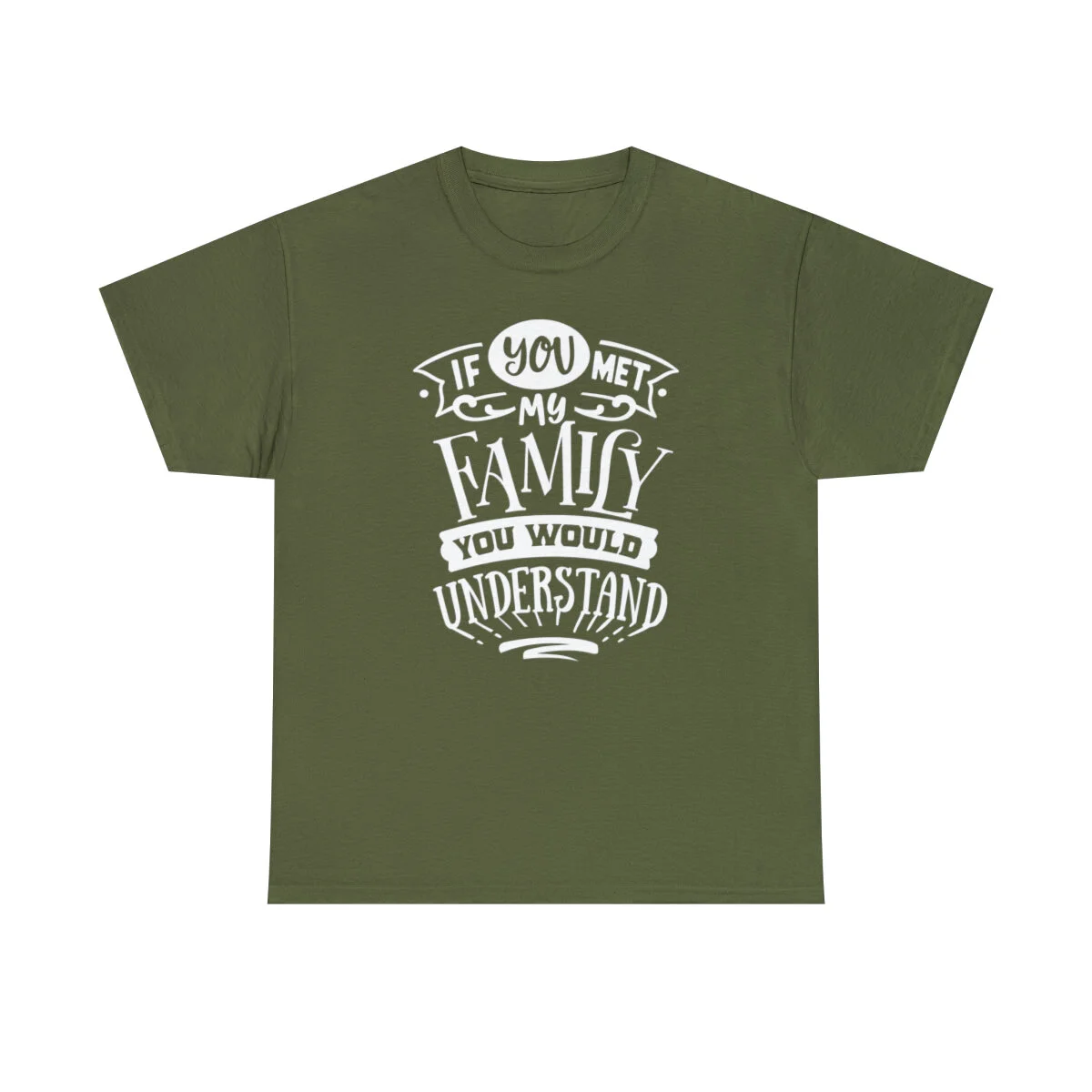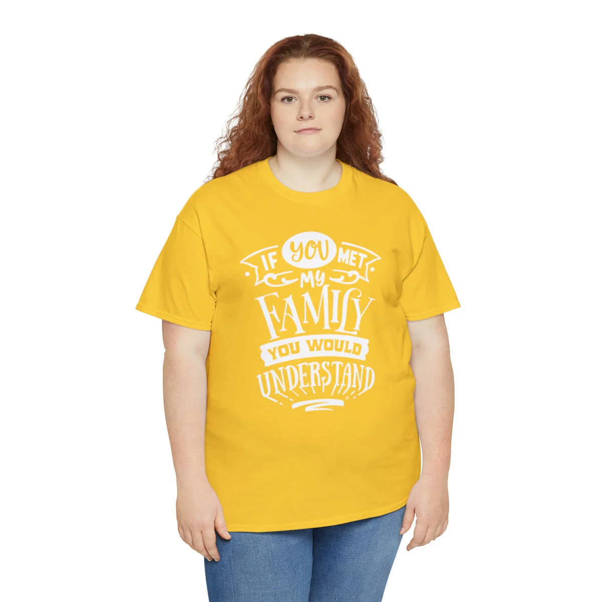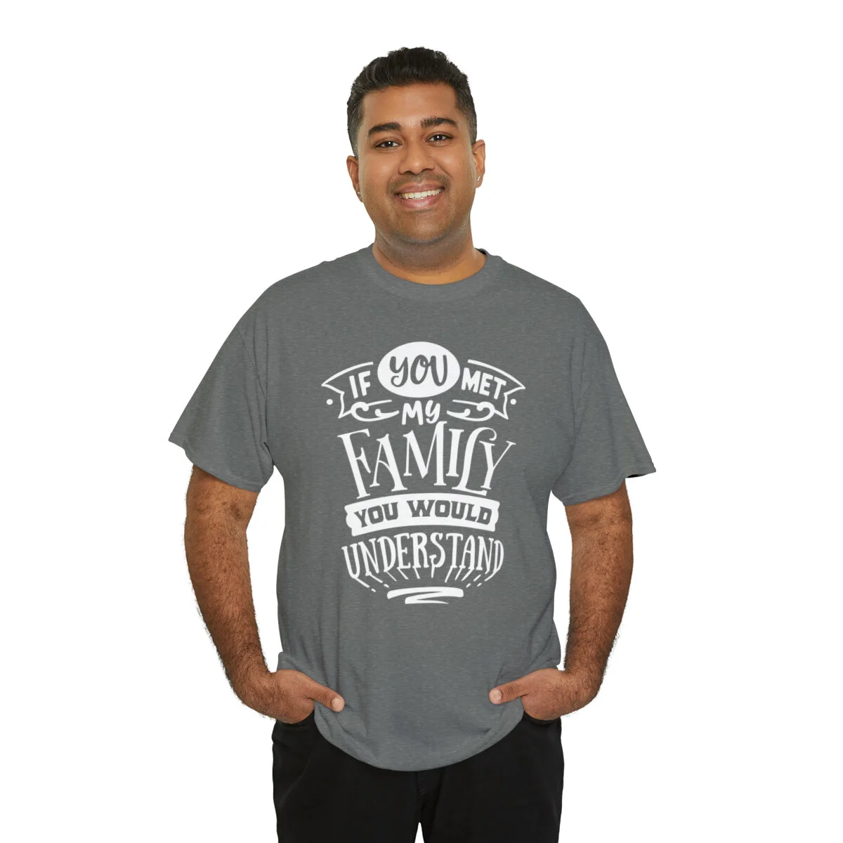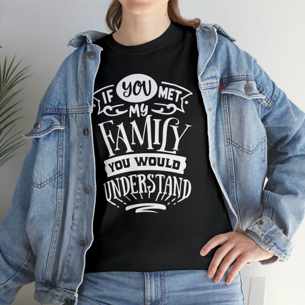 Crafted with care, this t-shirt is made from high-quality fabric to ensure exceptional comfort and durability. The design features the witty phrase, "If you met my family, you'd understand," elegantly displayed in multiple colors. Choose from a variety of vibrant options, including red, blue, yellow, and classic black and white, to find the hue that best matches your style and personality.