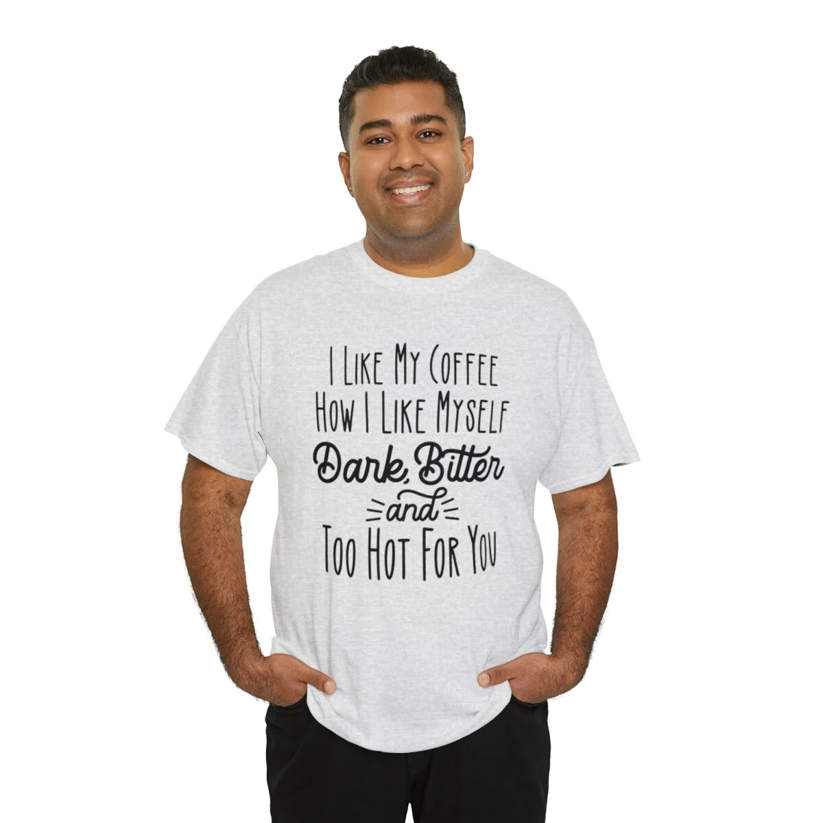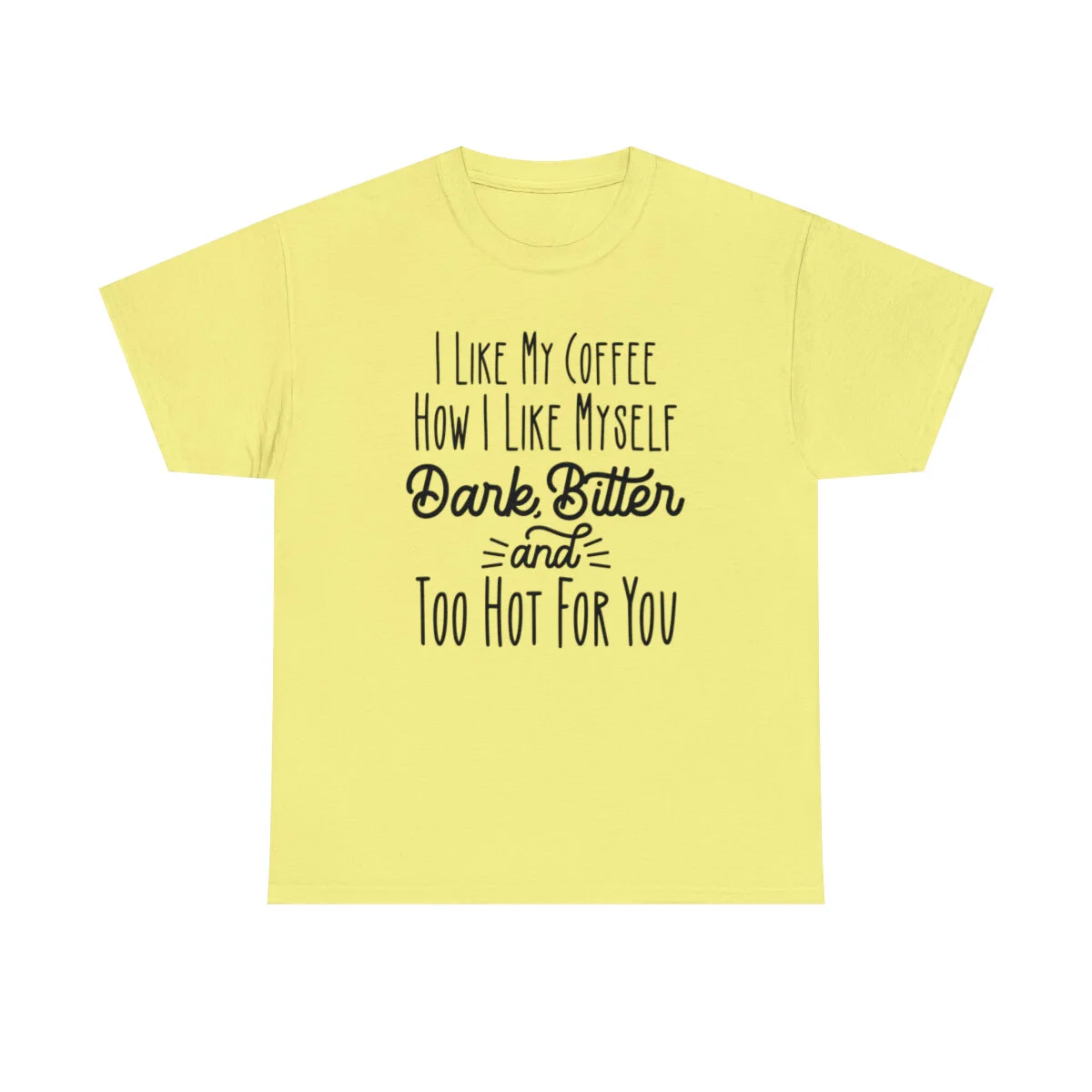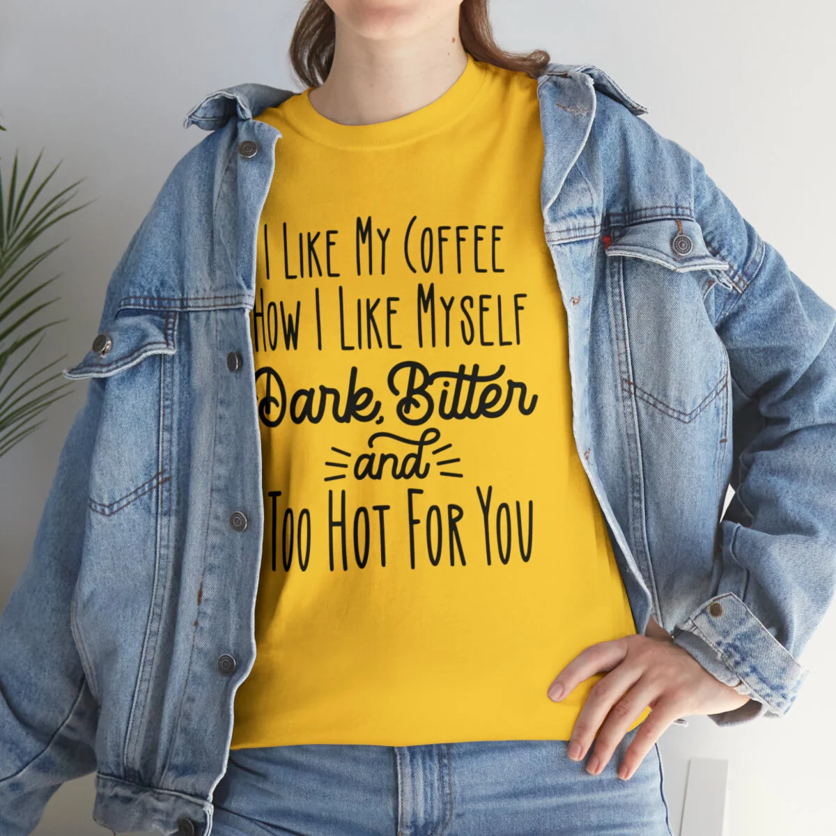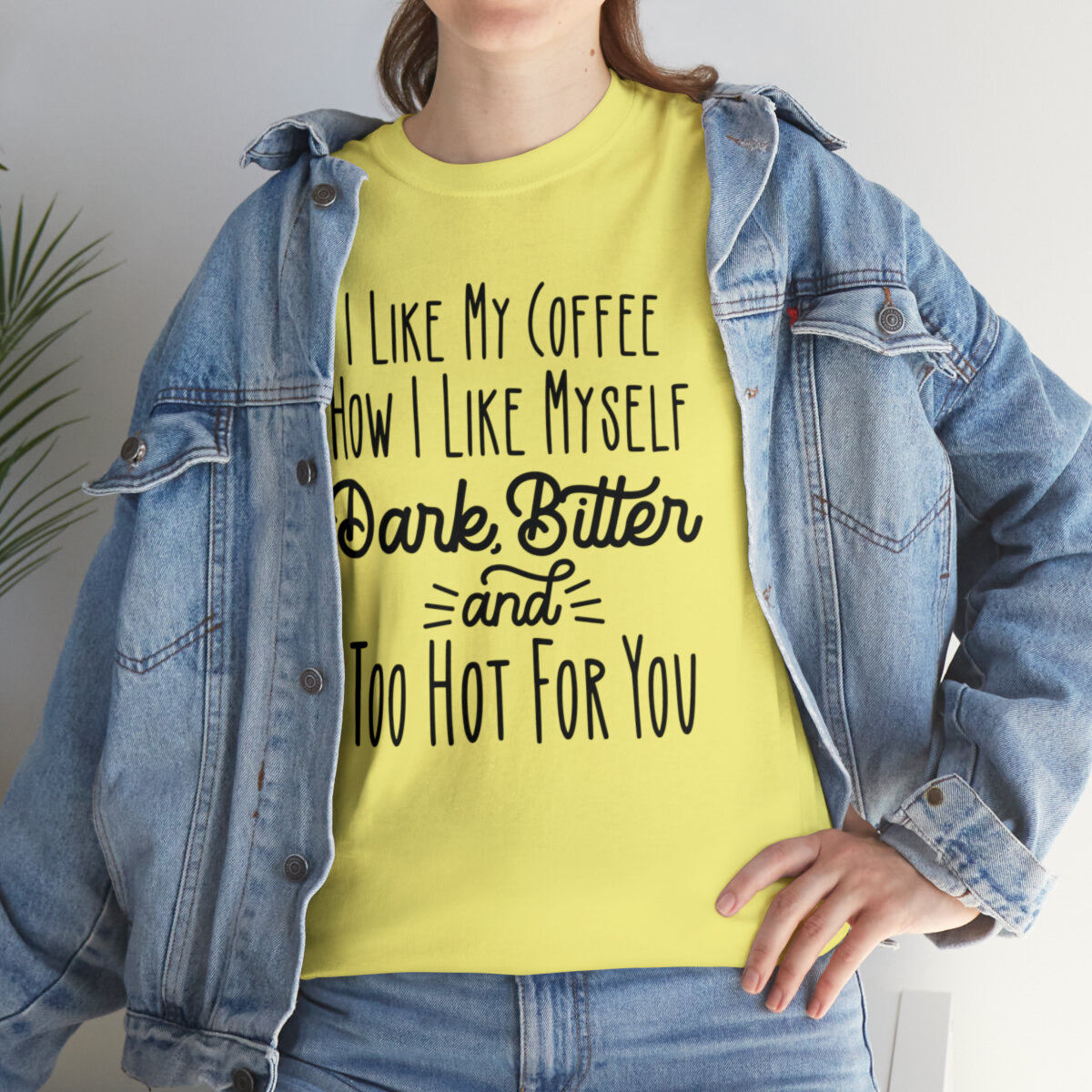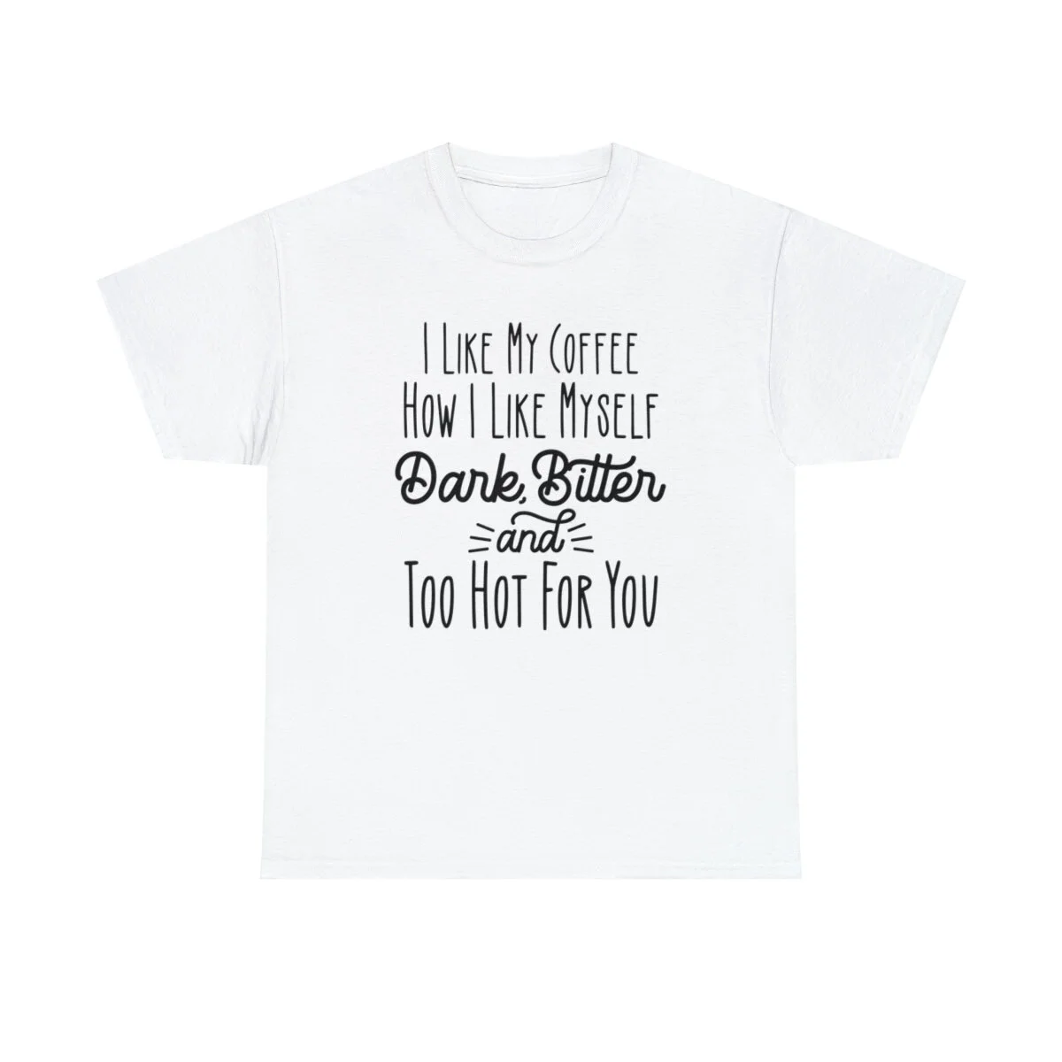 "Ilike myself like I like my coffee. Dark, Bitter and way too hot for you." Tee