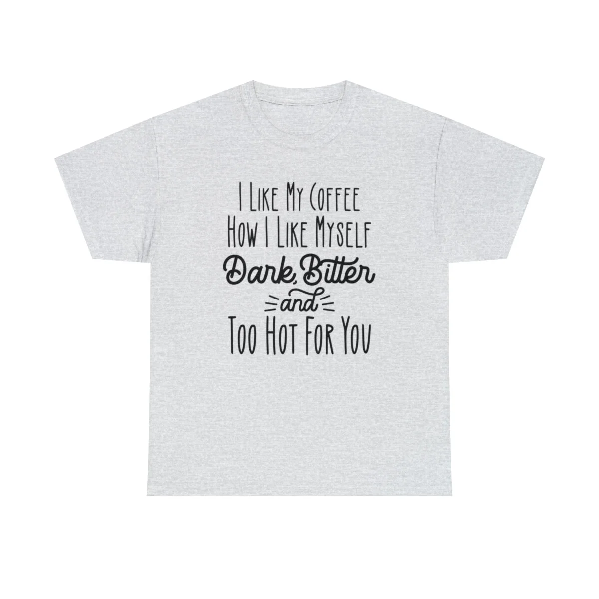 Please note that this design is intended to celebrate individuality and personal preferences with a touch of humor. Wear it with the intention of embracing your uniqueness and sparking lighthearted conversations. Embrace the empowering message, initiate conversations, and proudly wear the "I like myself how I like myself. Dark, Bitter and too hot for you..." t-shirt that combines style, confidence, and a playful attitude.
