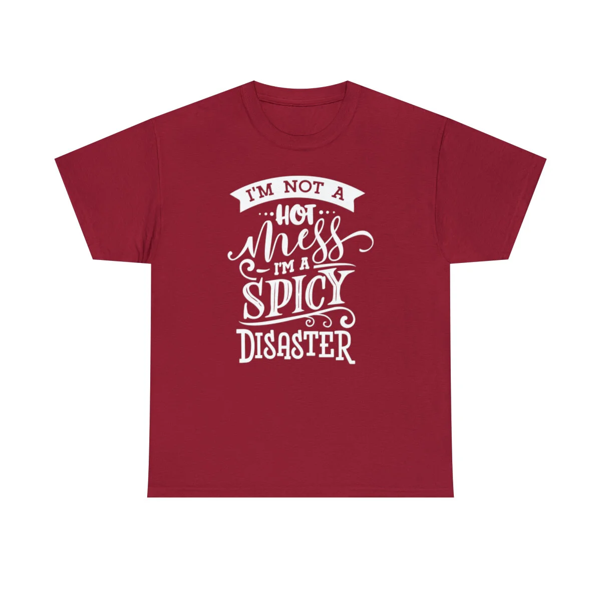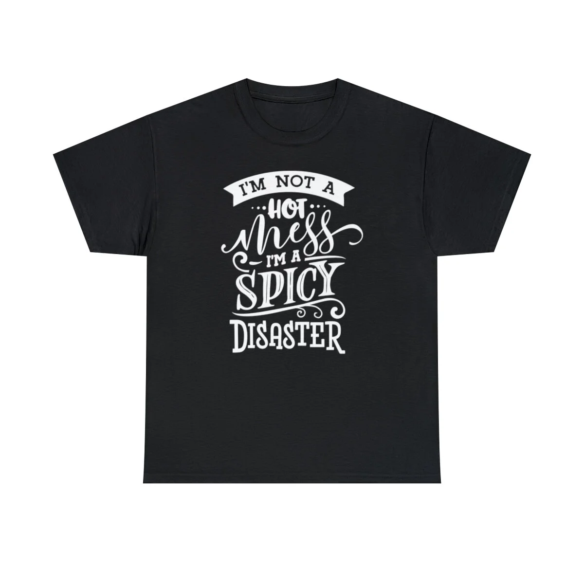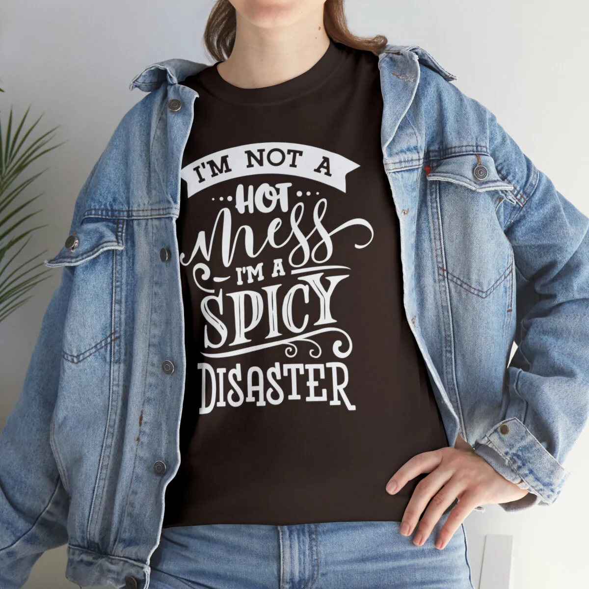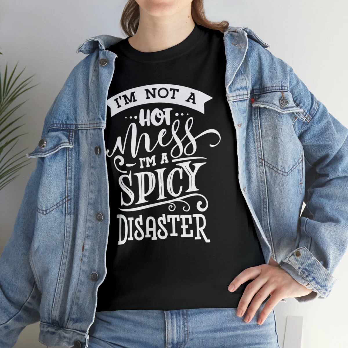 Crafted with utmost care, this t-shirt is made from high-quality fabric to ensure exceptional comfort and durability. The design features the clever and humorous phrase, "I'm not a hot mess, I'm a spicy disaster," elegantly displayed in multiple colors. Choose from a range of vibrant options, including fiery red, bold blue, sunny yellow, or classic black and white, to find the hue that matches your personality and style.