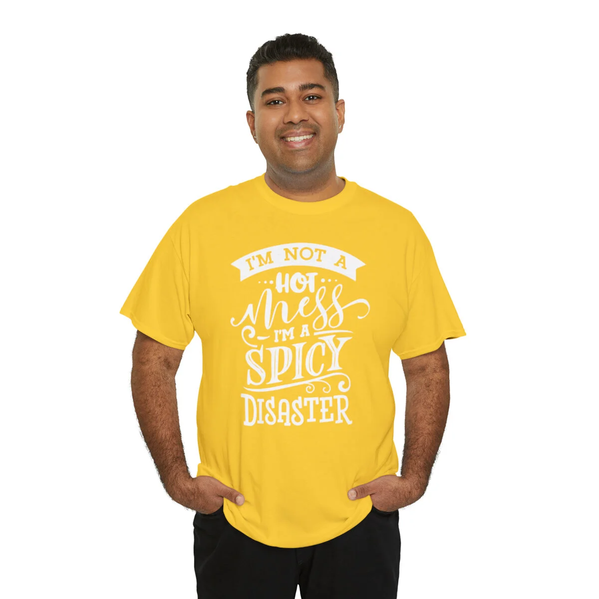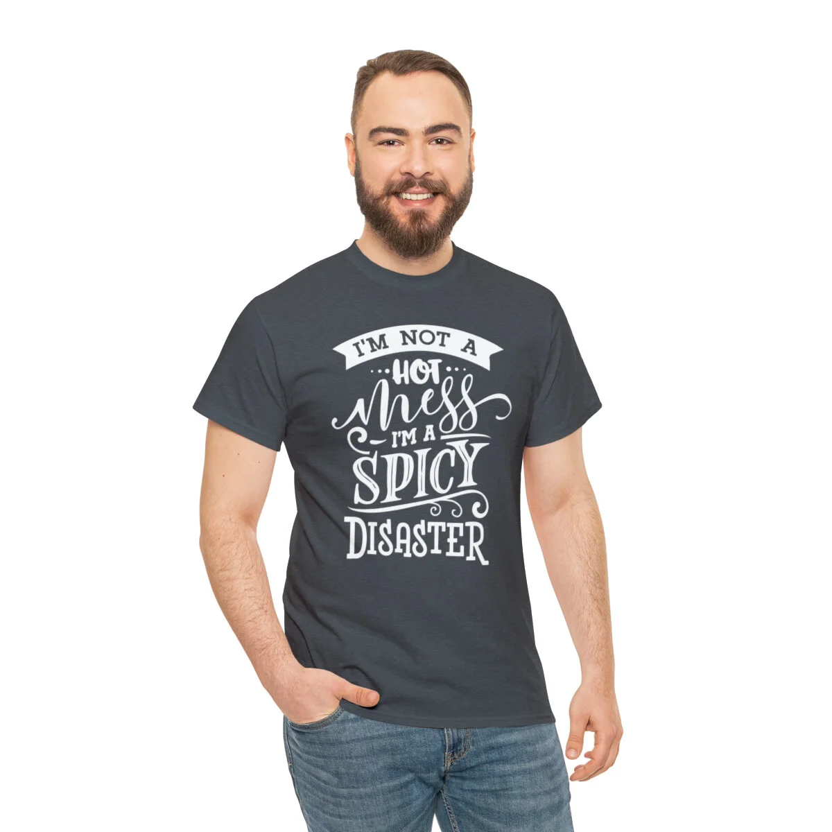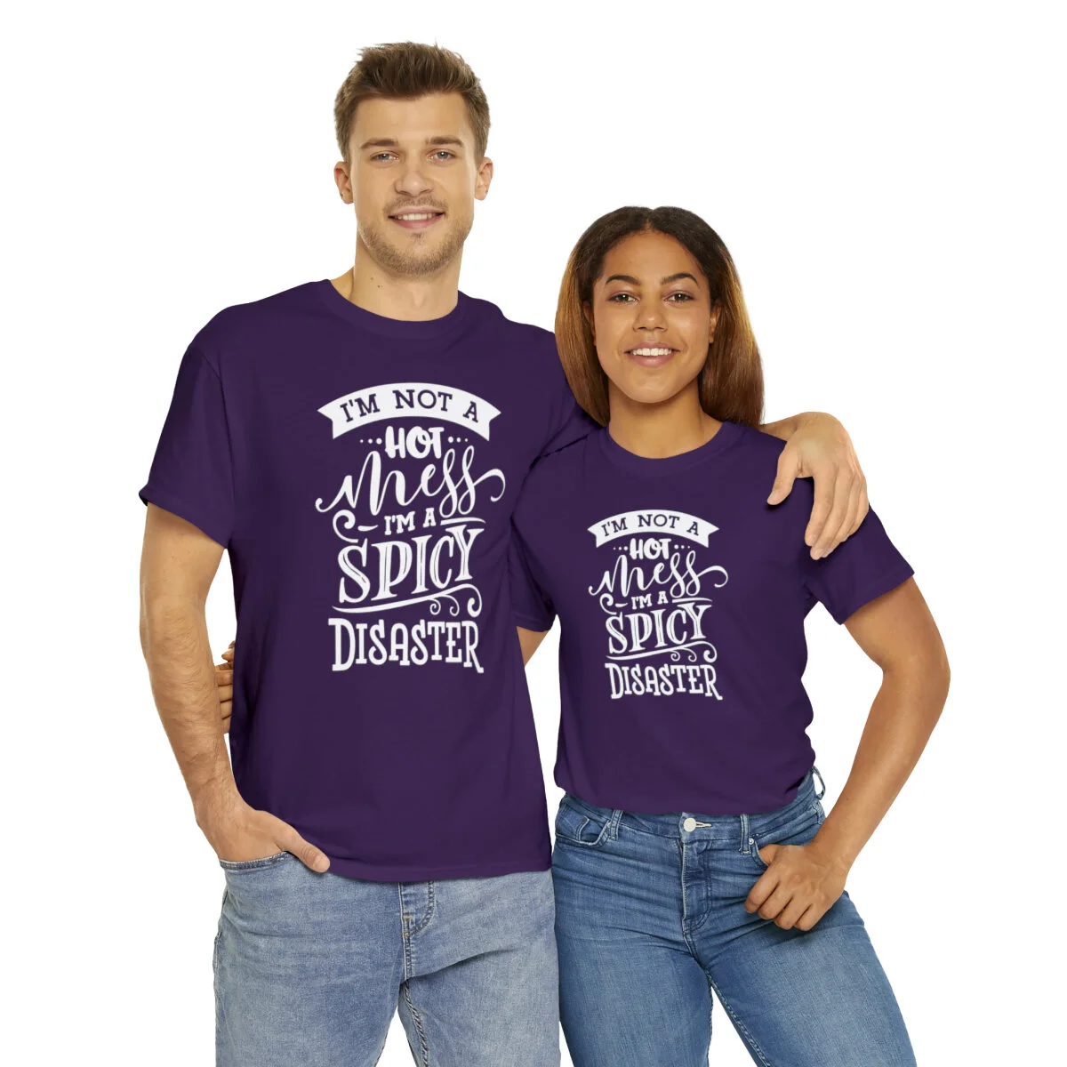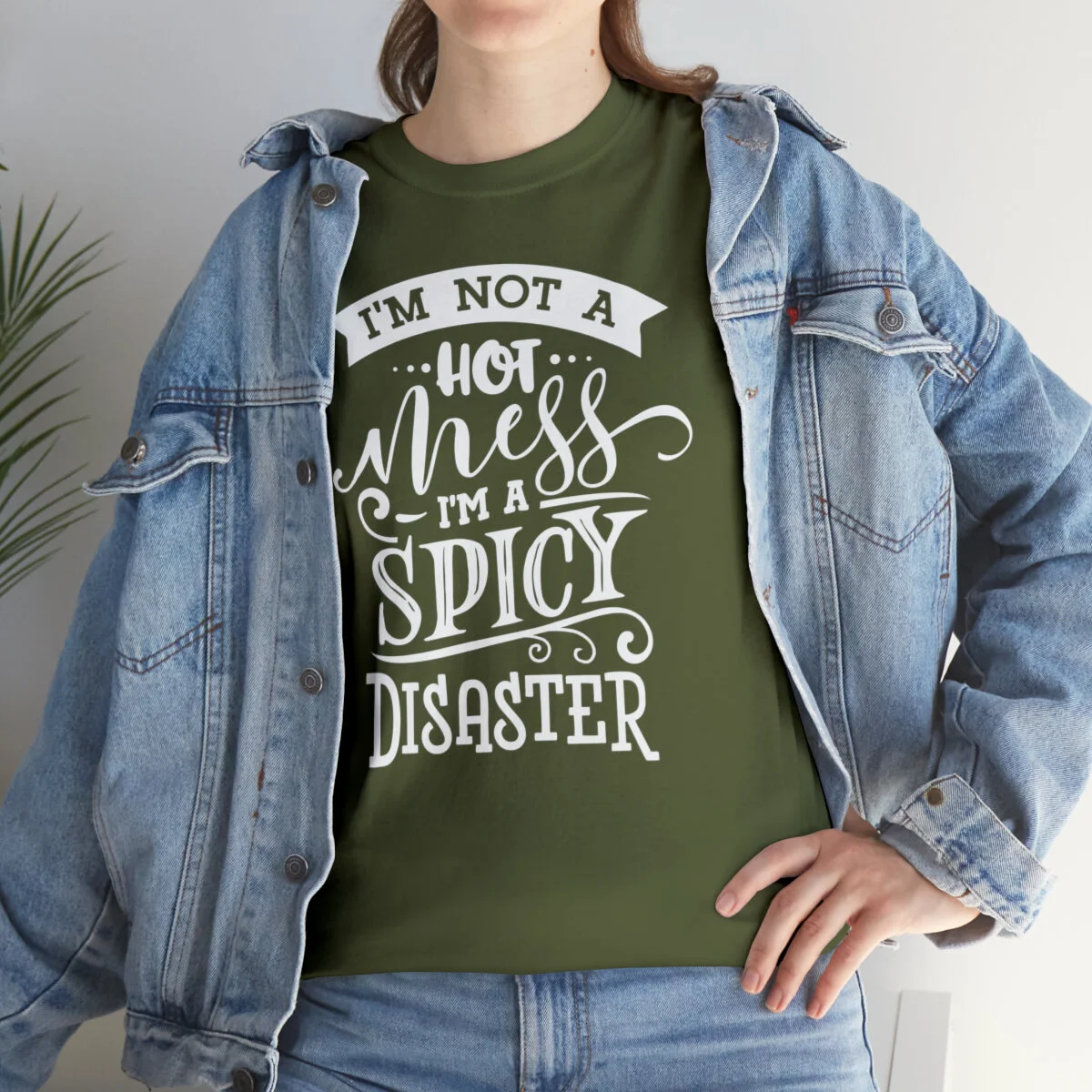 Crafted with utmost care, this t-shirt is made from high-quality fabric to ensure exceptional comfort and durability. The design features the clever and humorous phrase, "I'm not a hot mess, I'm a spicy disaster," elegantly displayed in multiple colors. Choose from a range of vibrant options, including fiery red, bold blue, sunny yellow, or classic black and white, to find the hue that matches your personality and style.
