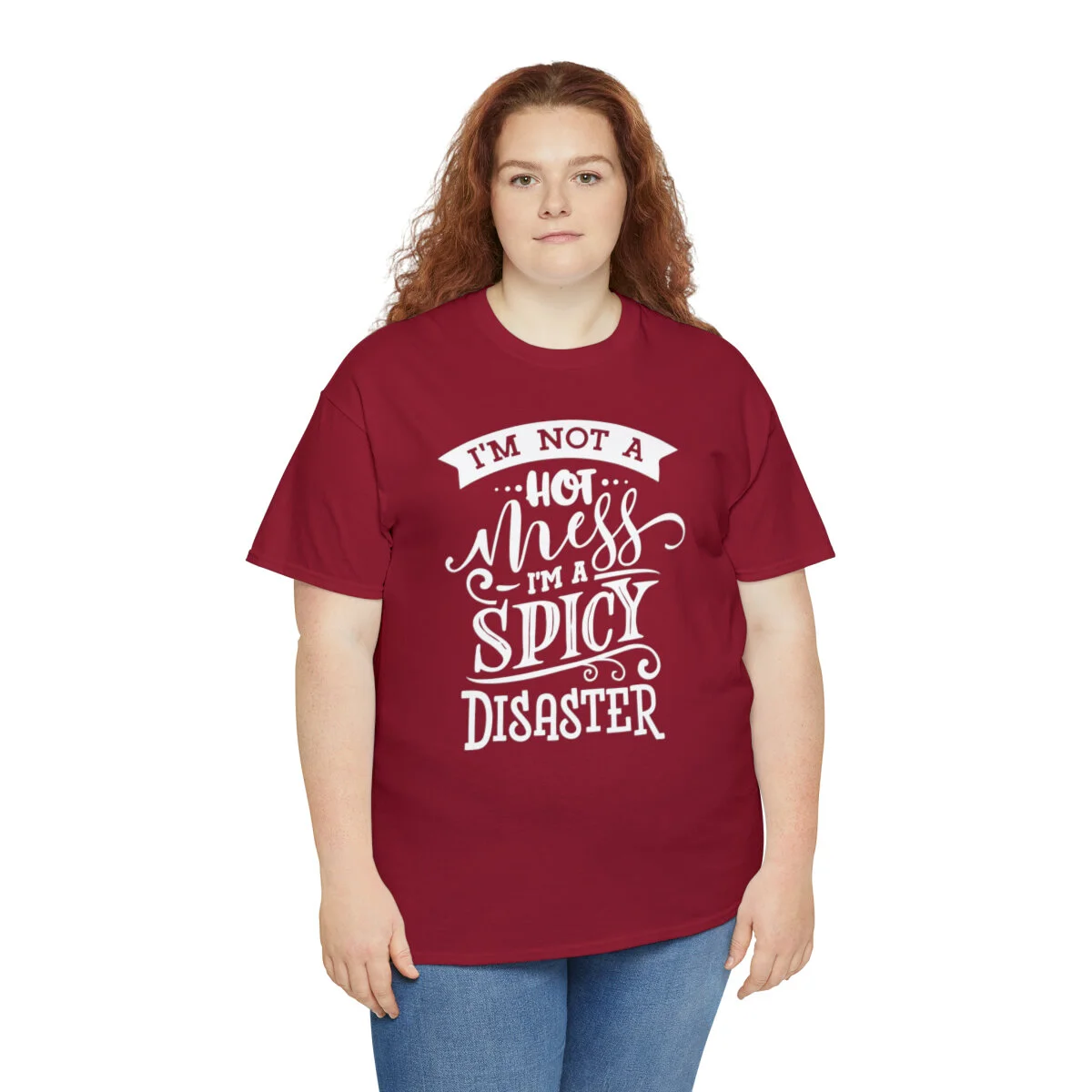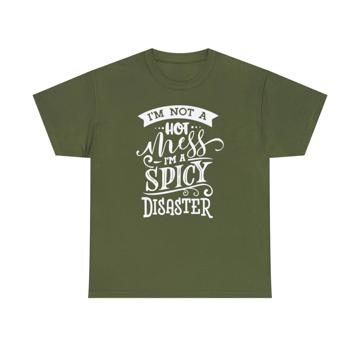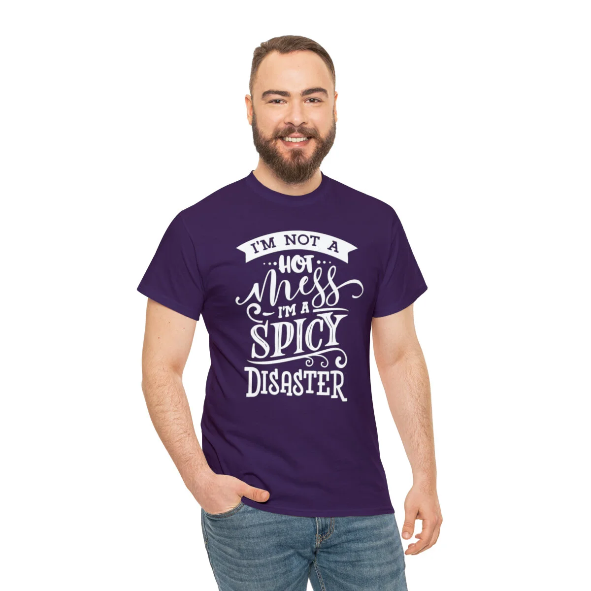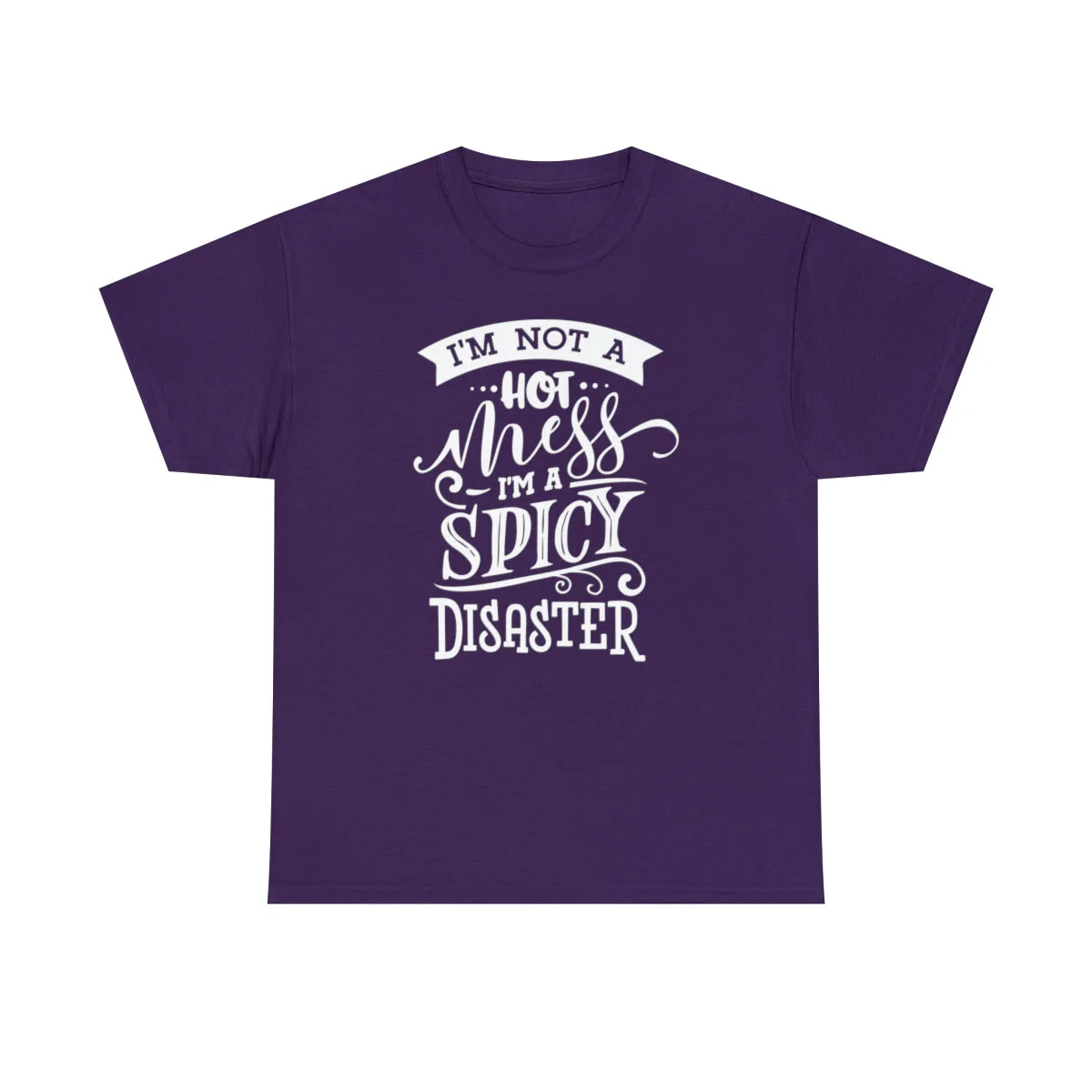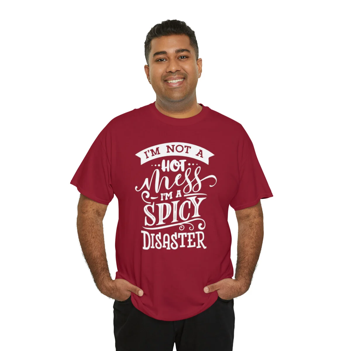 Crafted with utmost care, this t-shirt is made from high-quality fabric to ensure exceptional comfort and durability. The design features the clever and humorous phrase, "I'm not a hot mess, I'm a spicy disaster," elegantly displayed in multiple colors. Choose from a range of vibrant options, including fiery red, bold blue, sunny yellow, or classic black and white, to find the hue that matches your personality and style.