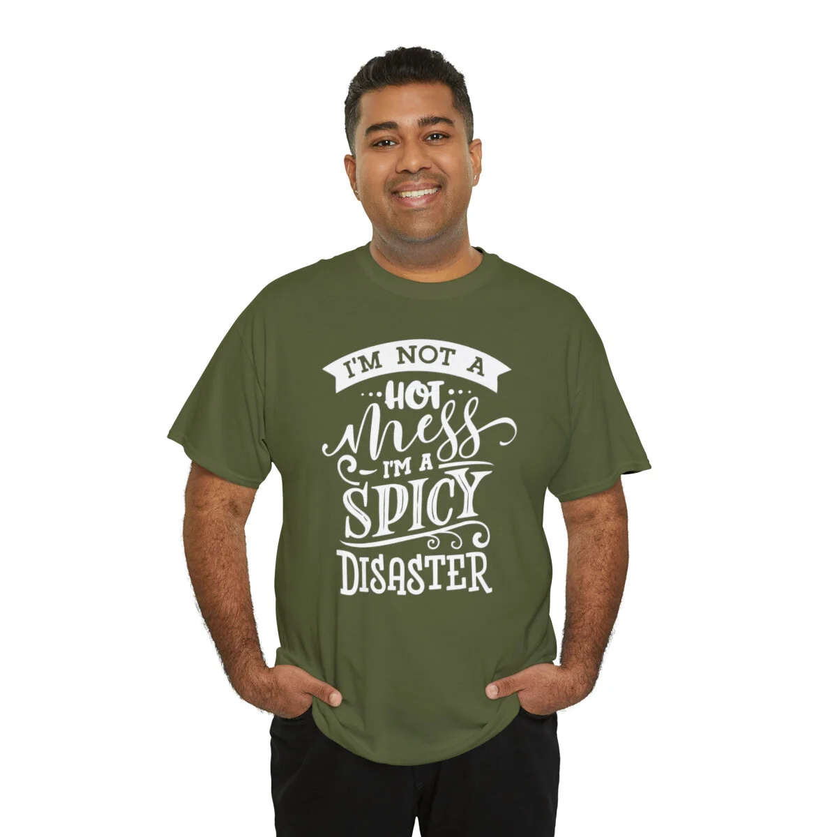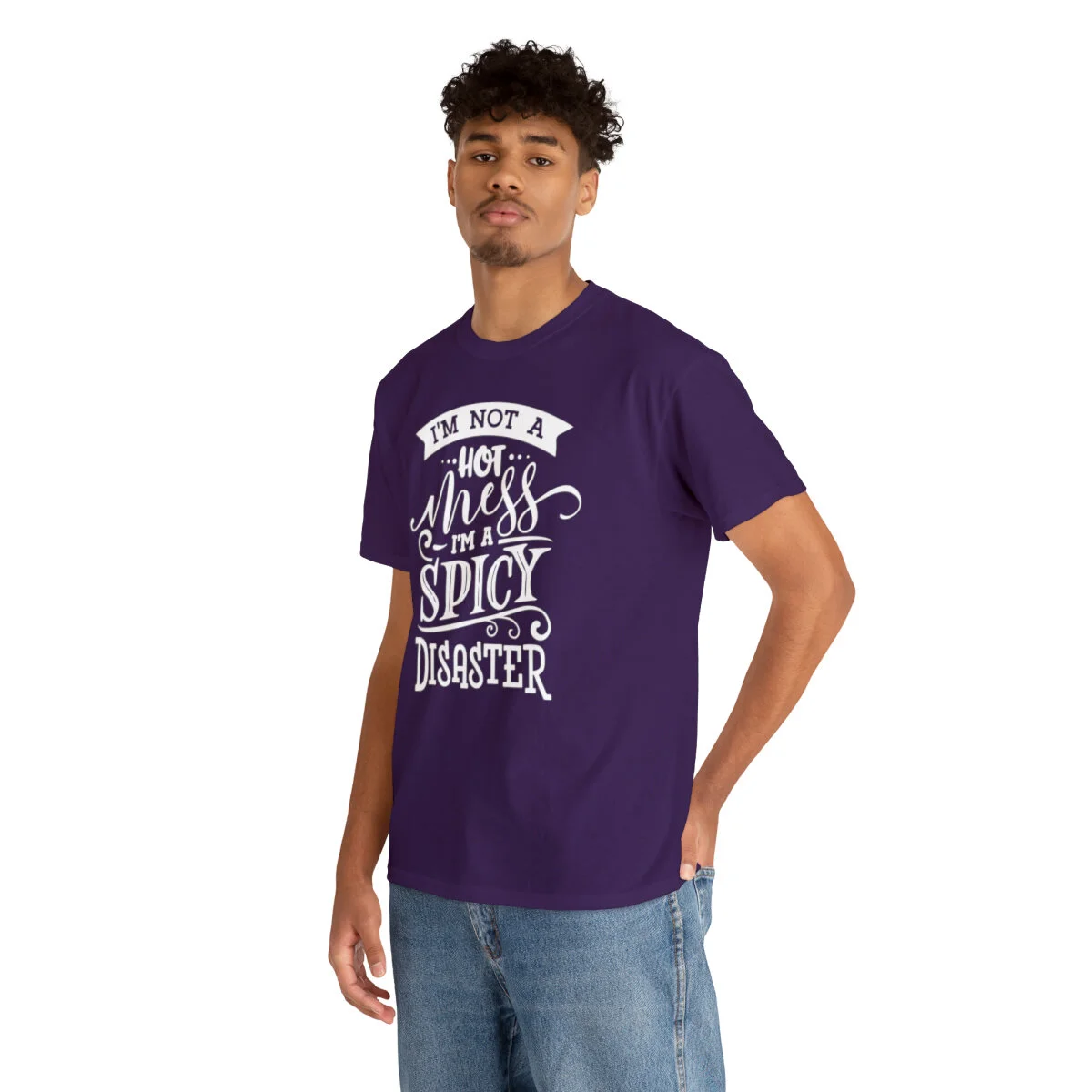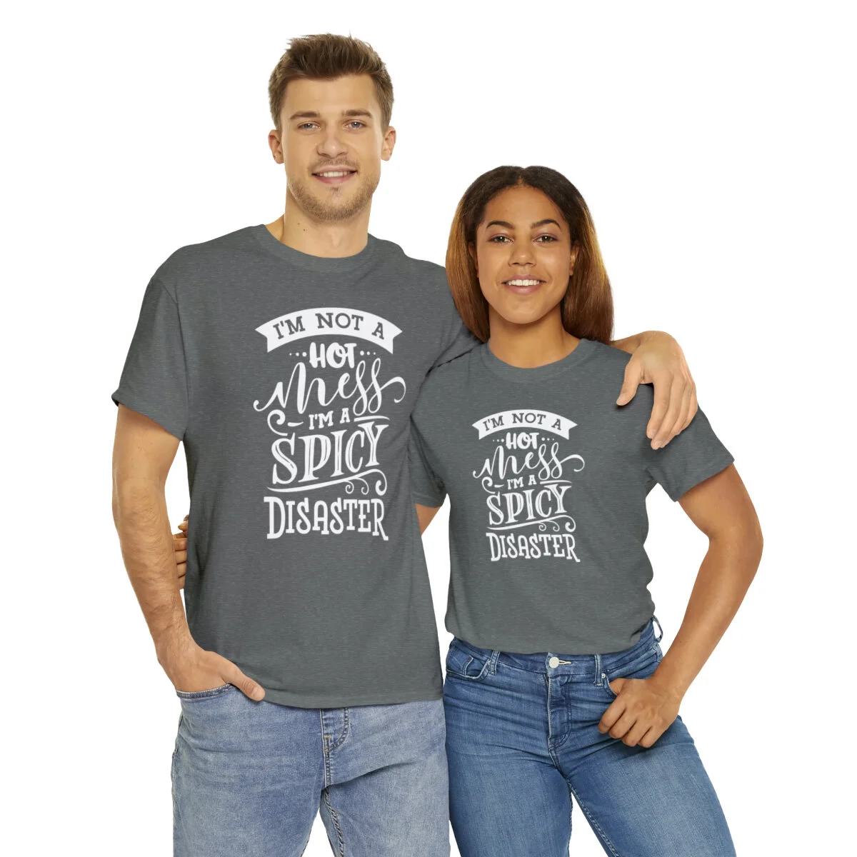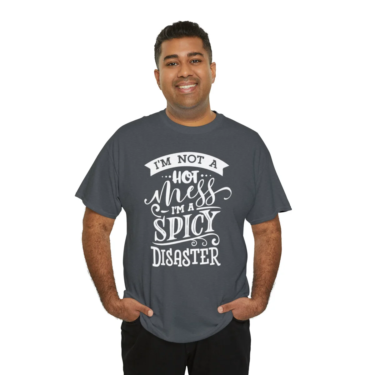 Crafted with utmost care, this t-shirt is made from high-quality fabric to ensure exceptional comfort and durability. The design features the clever and humorous phrase, "I'm not a hot mess, I'm a spicy disaster," elegantly displayed in multiple colors. Choose from a range of vibrant options, including fiery red, bold blue, sunny yellow, or classic black and white, to find the hue that matches your personality and style.