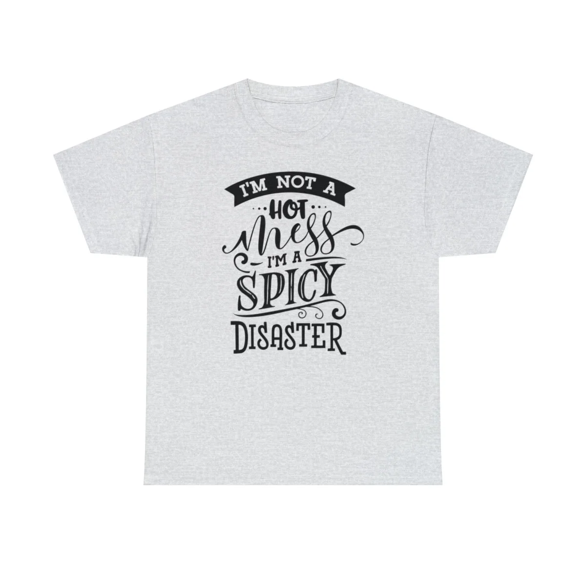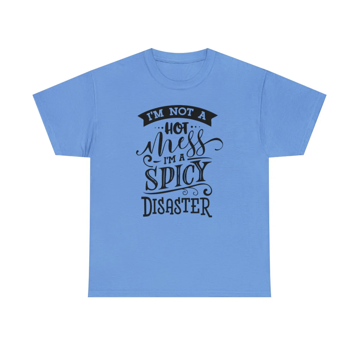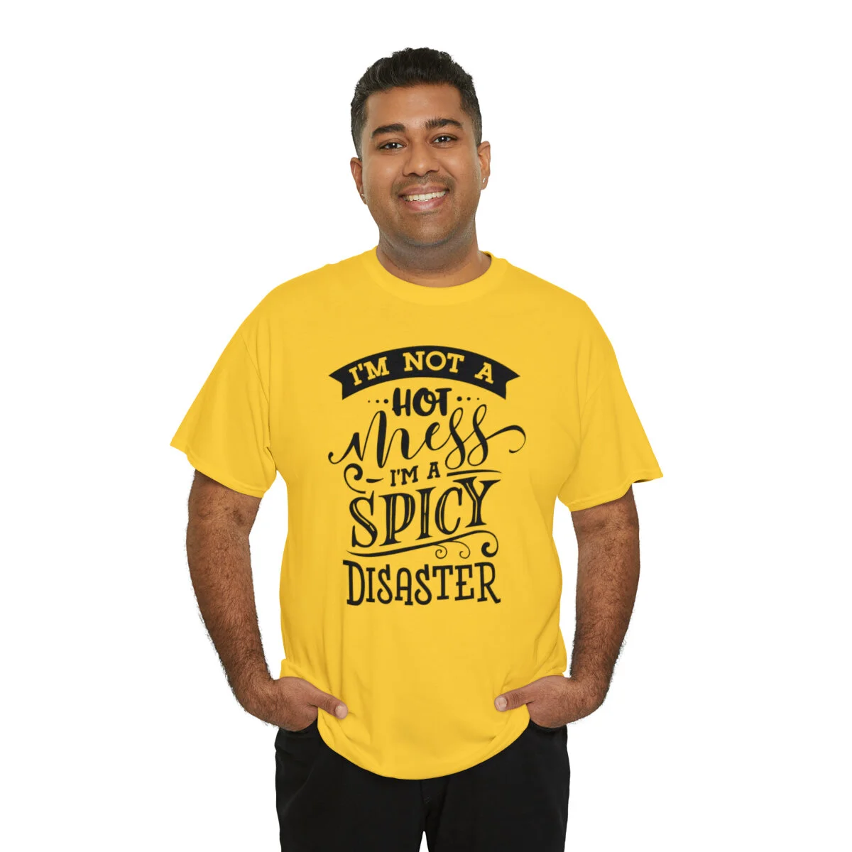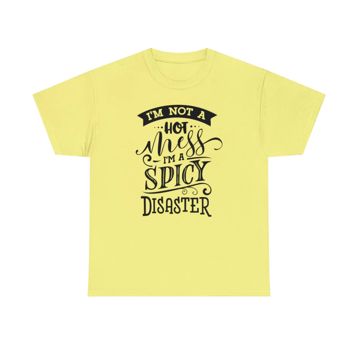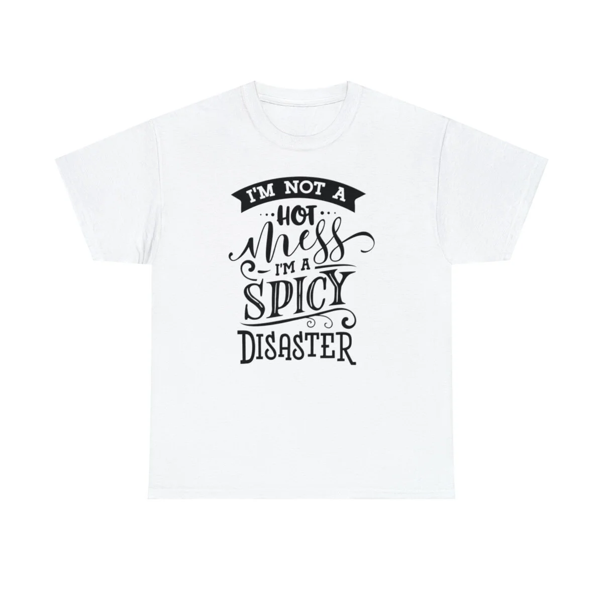 Crafted with utmost care, this t-shirt is made from high-quality fabric to ensure exceptional comfort and durability. The design features the clever and humorous phrase, "I'm not a hot mess, I'm a spicy disaster," elegantly displayed in multiple colors. Choose from a range of vibrant options, including fiery red, bold blue, sunny yellow, or classic black and white, to find the hue that matches your personality and style.