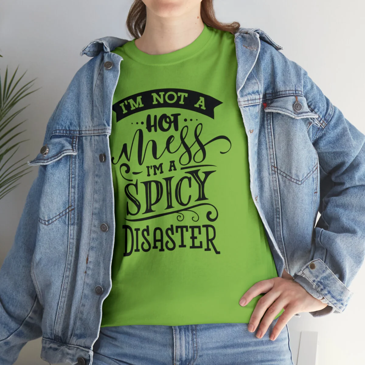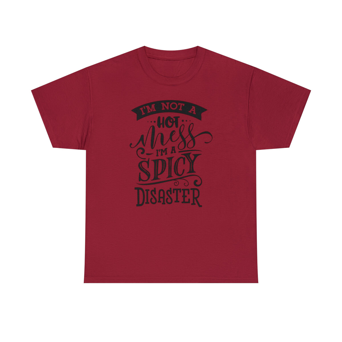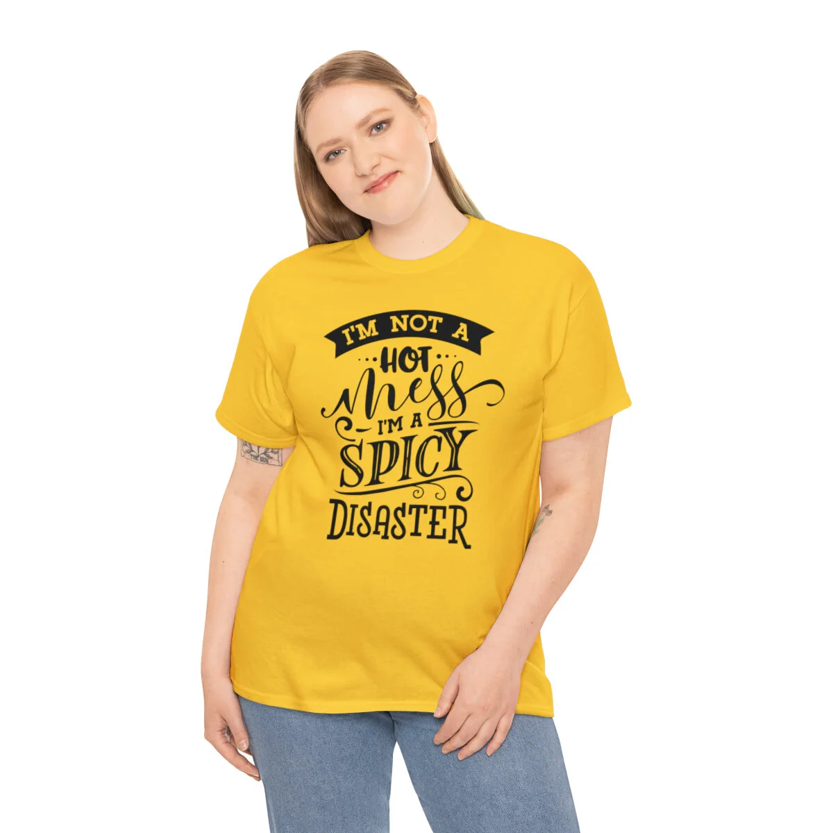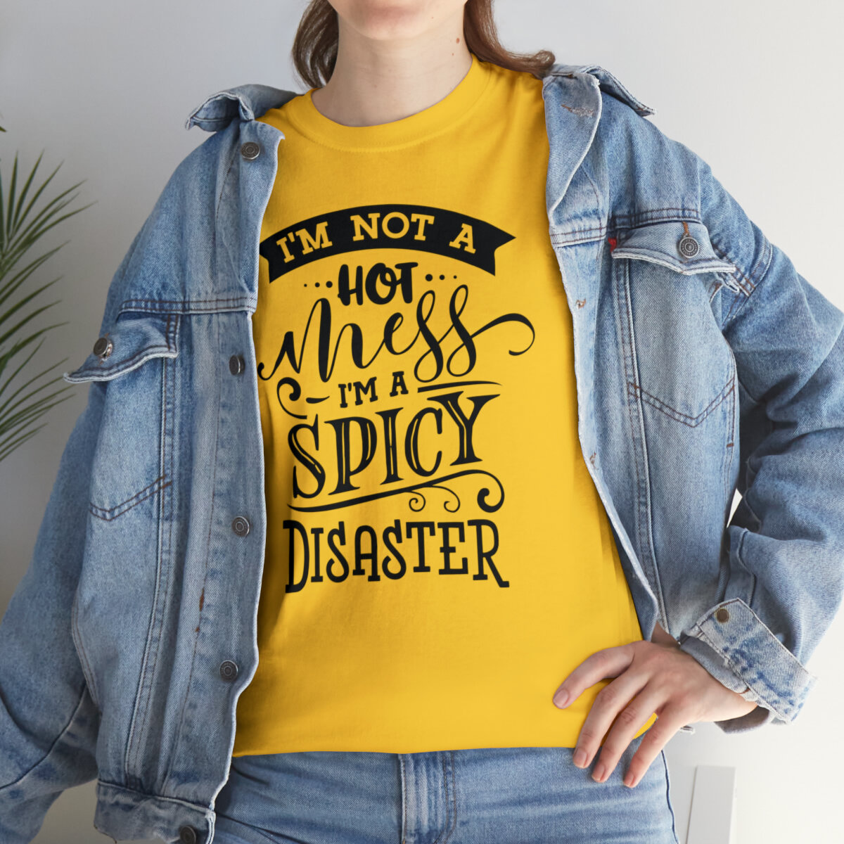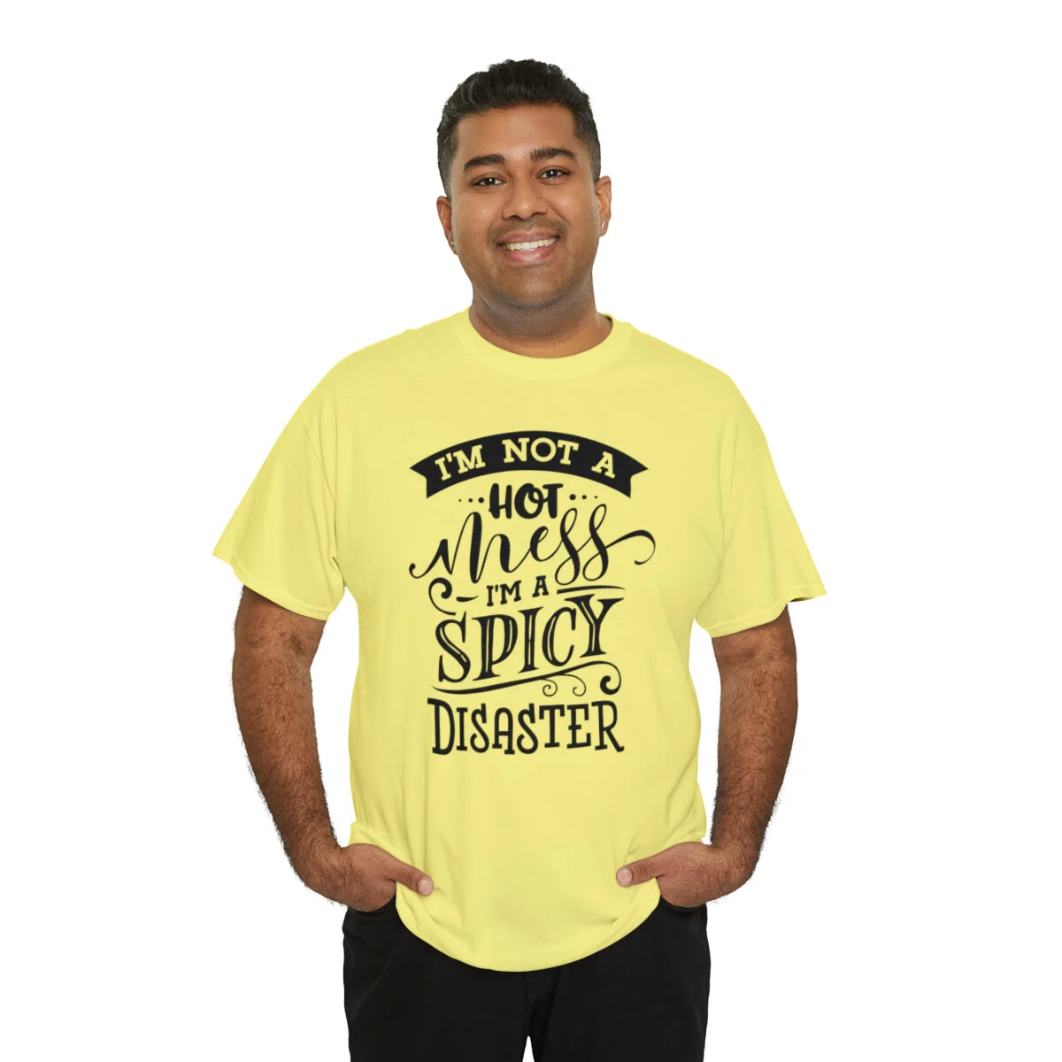 Crafted with utmost care, this t-shirt is made from high-quality fabric to ensure exceptional comfort and durability. The design features the clever and humorous phrase, "I'm not a hot mess, I'm a spicy disaster," elegantly displayed in multiple colors. Choose from a range of vibrant options, including fiery red, bold blue, sunny yellow, or classic black and white, to find the hue that matches your personality and style.