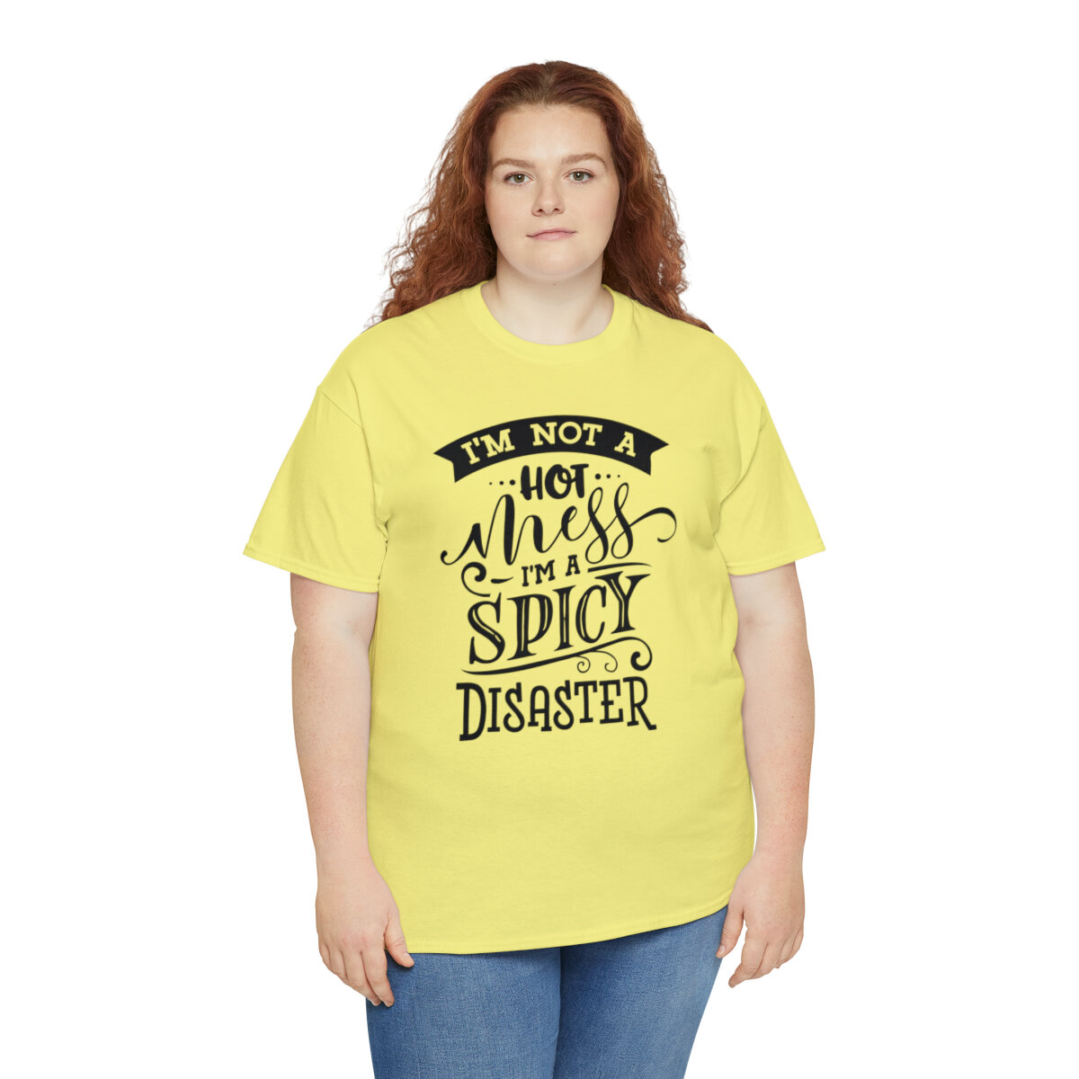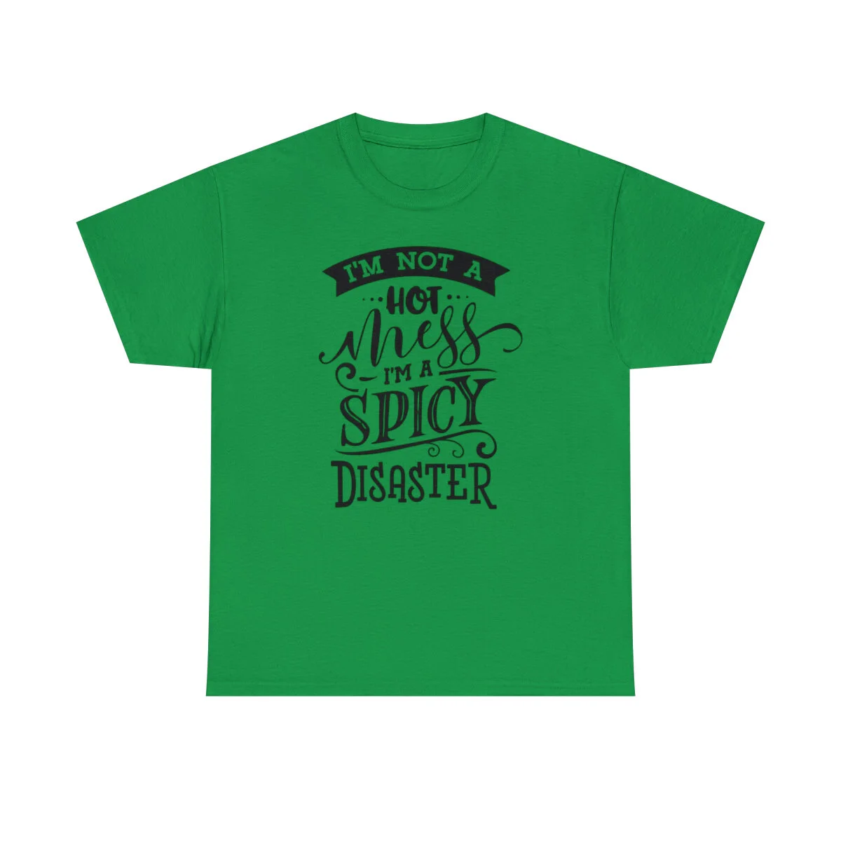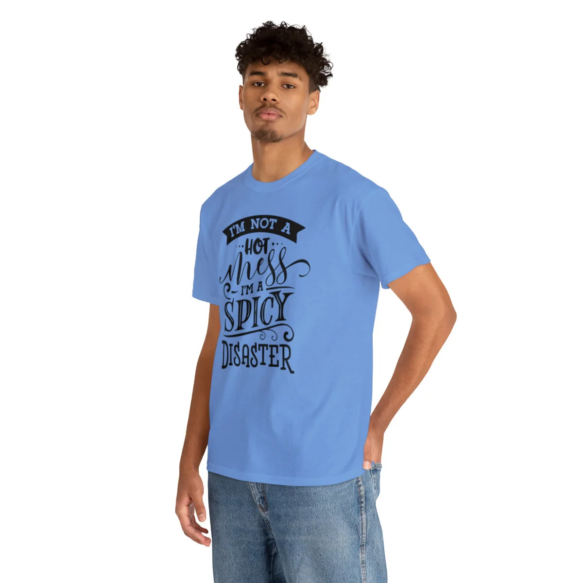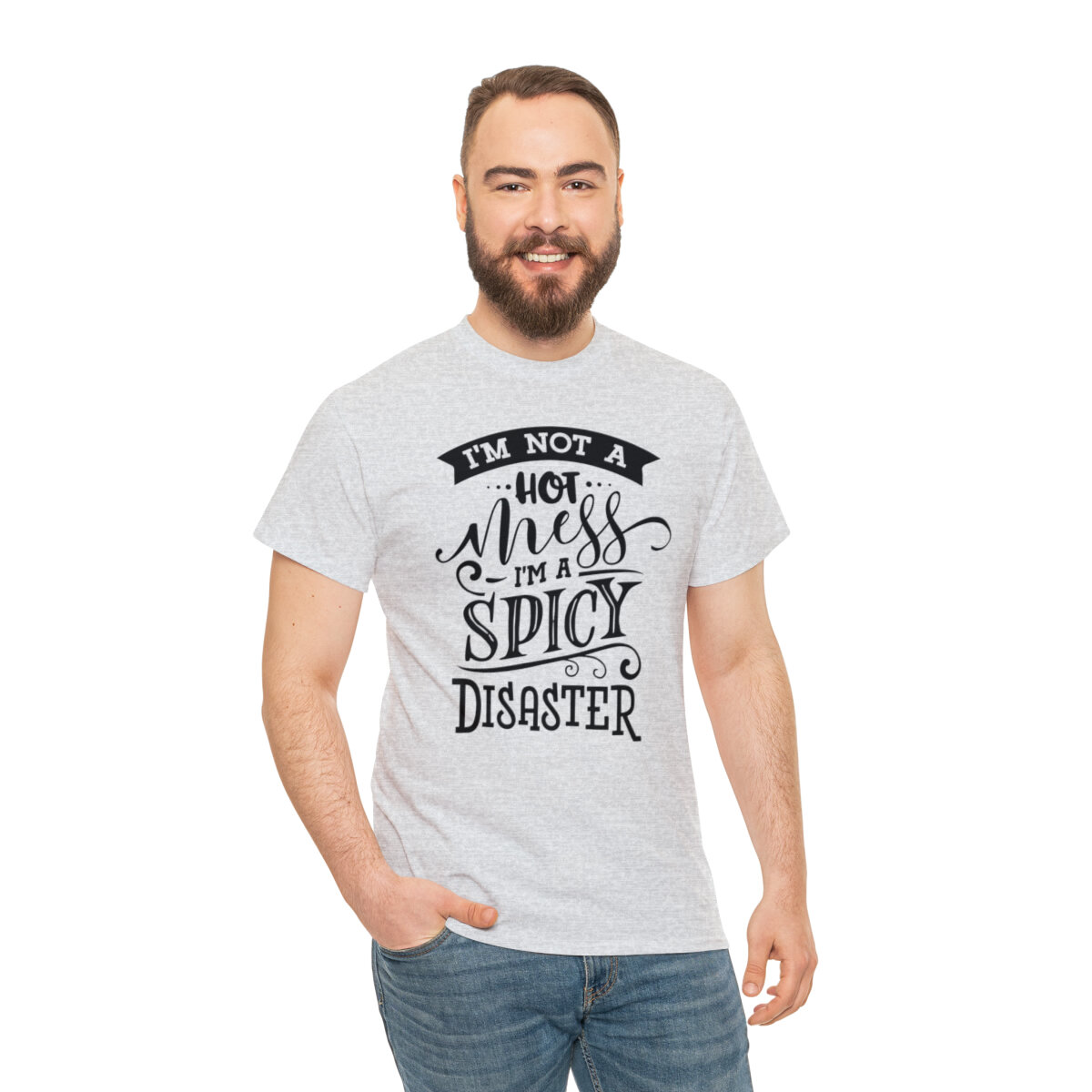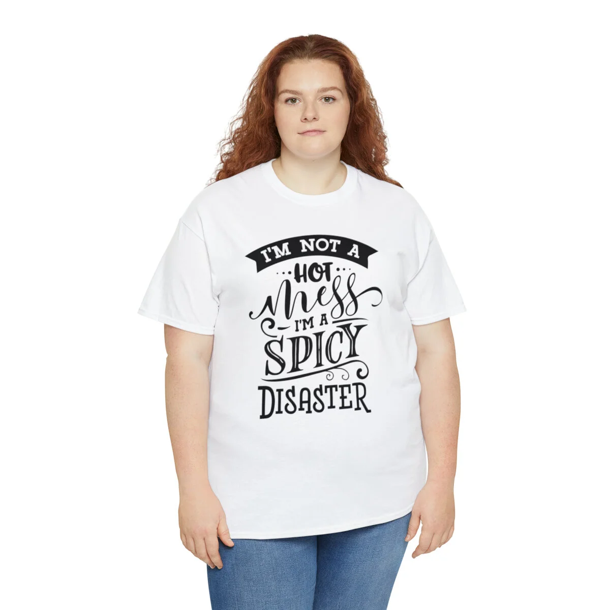 Crafted with utmost care, this t-shirt is made from high-quality fabric to ensure exceptional comfort and durability. The design features the clever and humorous phrase, "I'm not a hot mess, I'm a spicy disaster," elegantly displayed in multiple colors. Choose from a range of vibrant options, including fiery red, bold blue, sunny yellow, or classic black and white, to find the hue that matches your personality and style.