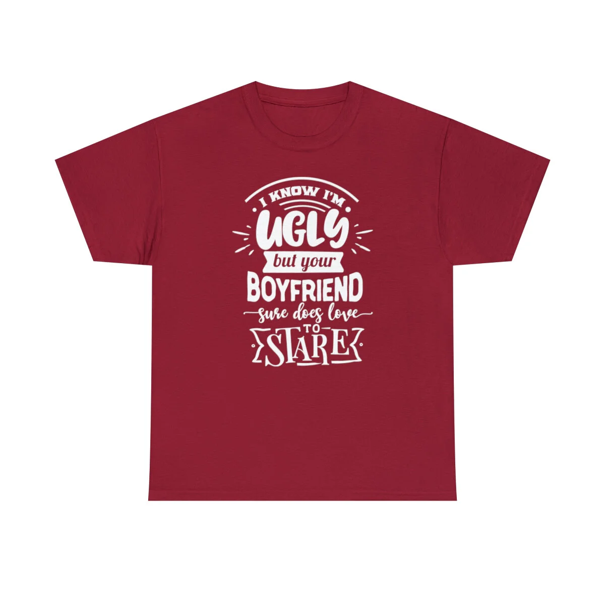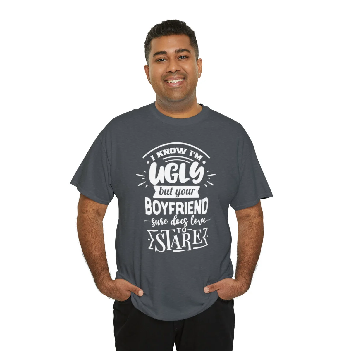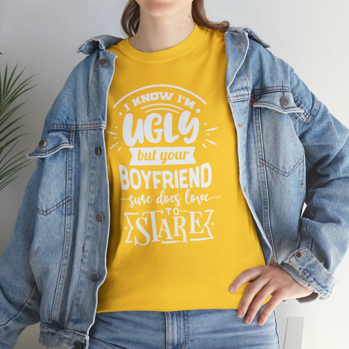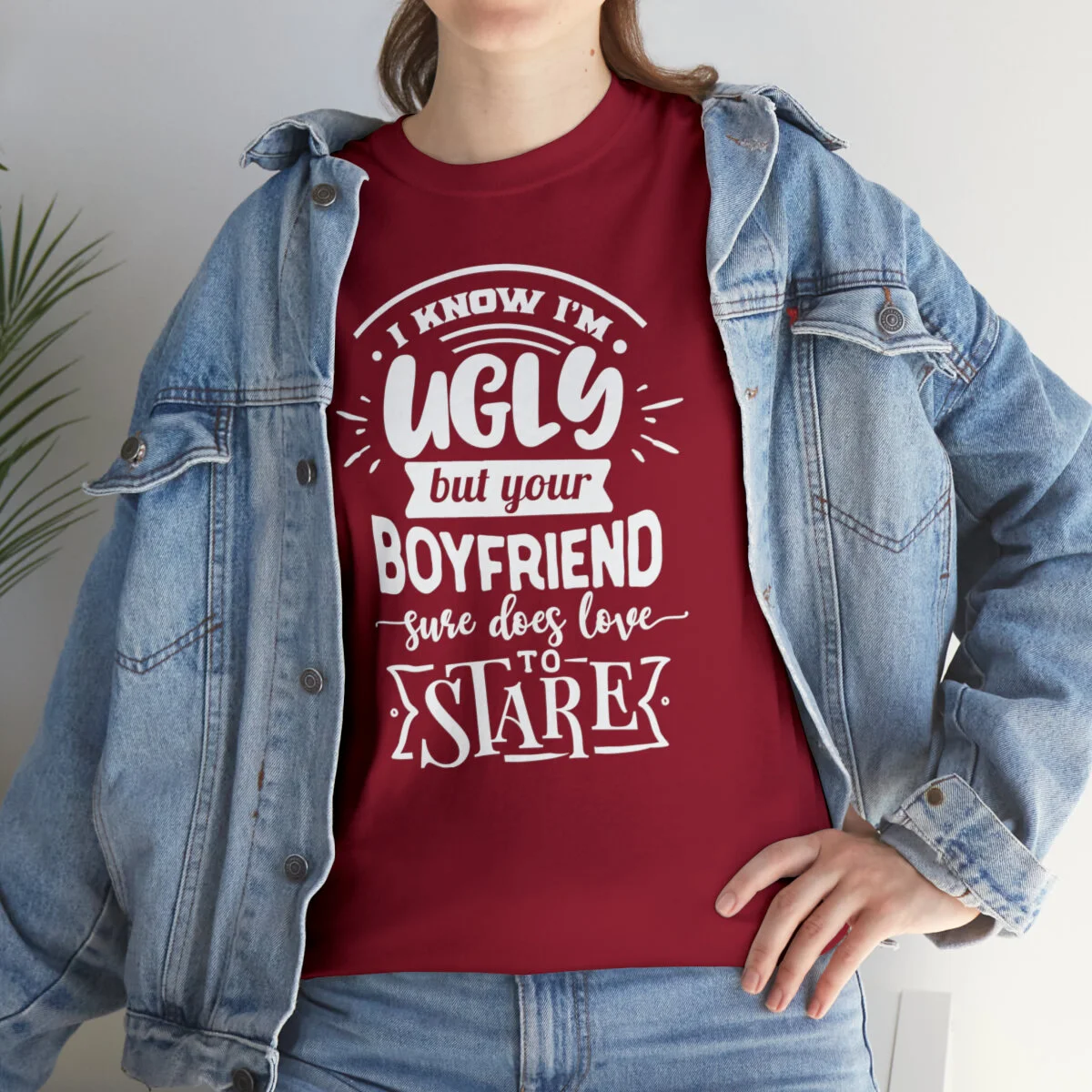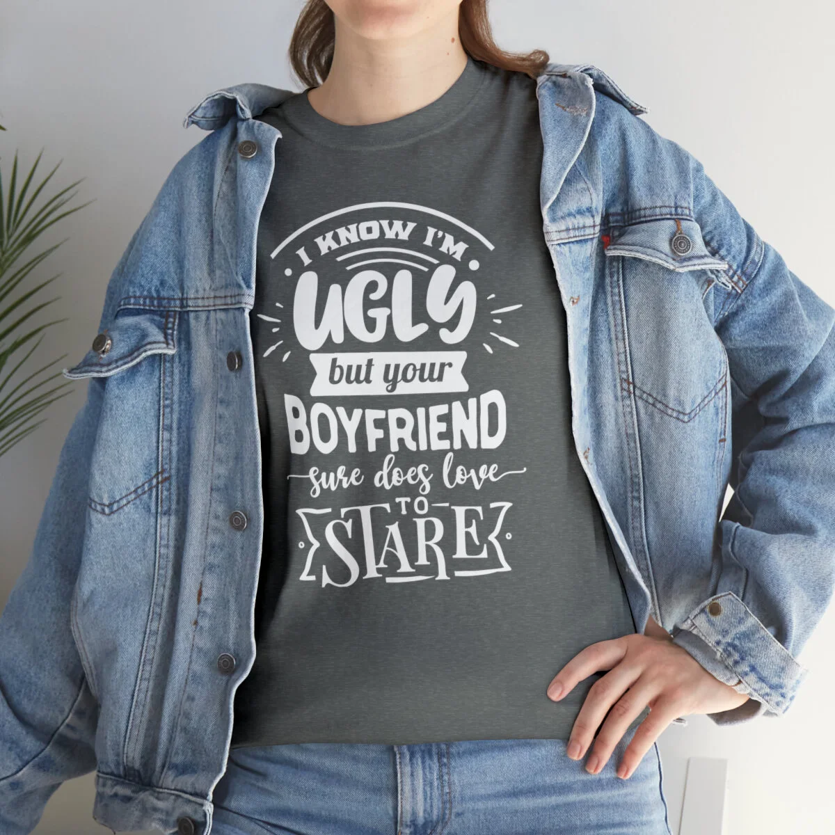 The front of the shirt features the bold and attention-grabbing phrase, "I know I'm ugly, but your boyfriend sure does love to stare." The words are cleverly arranged, with a playful font and eye-catching design, making it impossible to miss. The sarcastic tone is enhanced by the use of contrasting colors and a touch of irony.