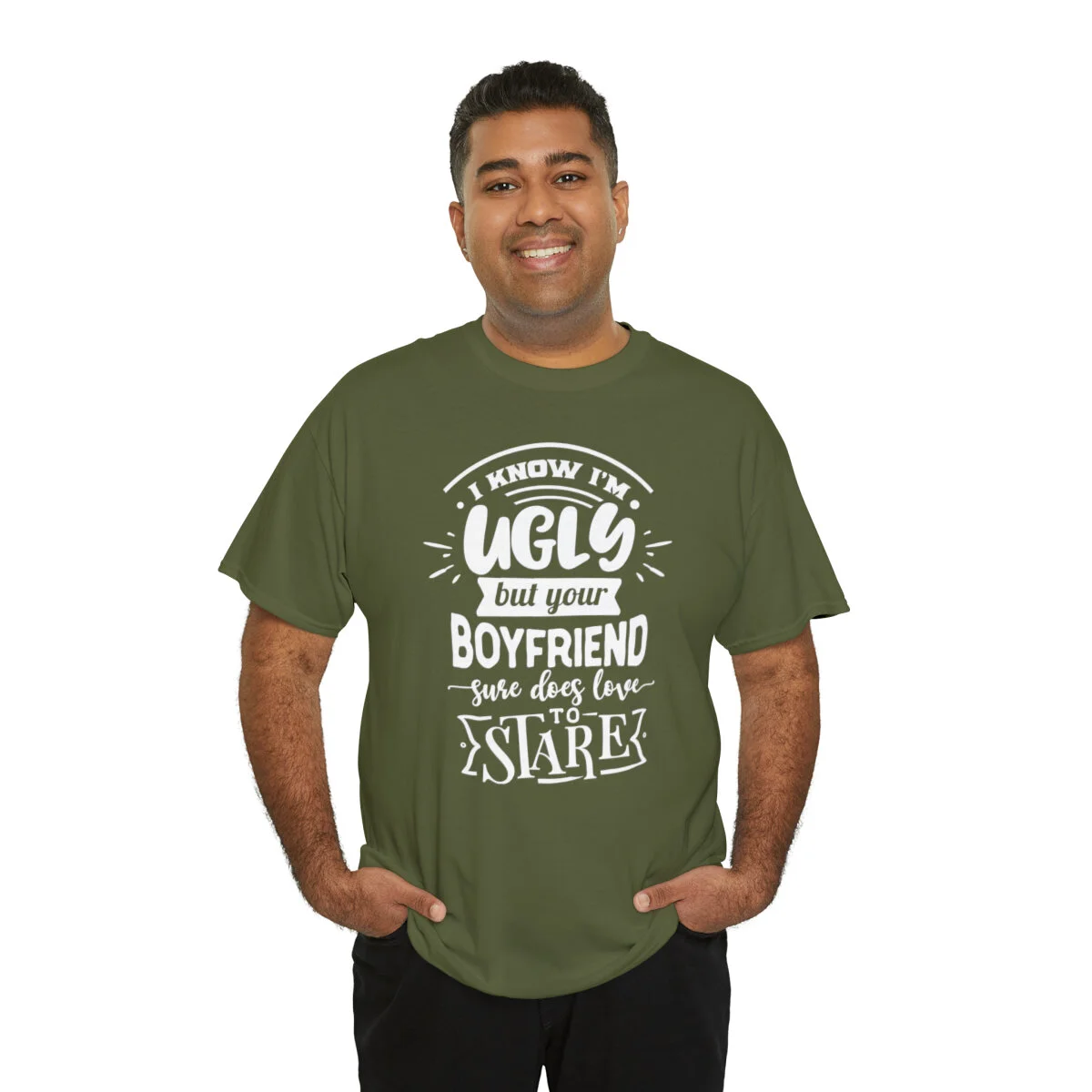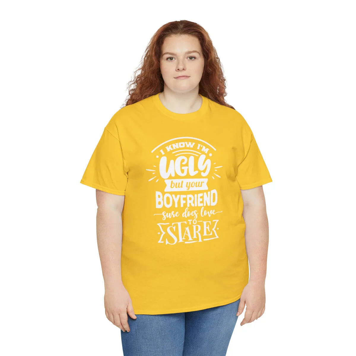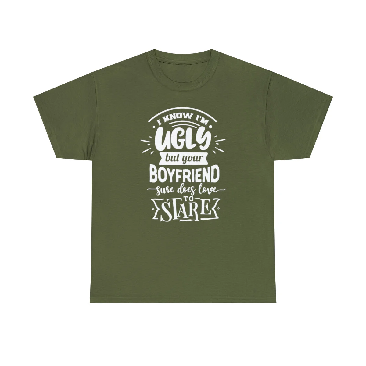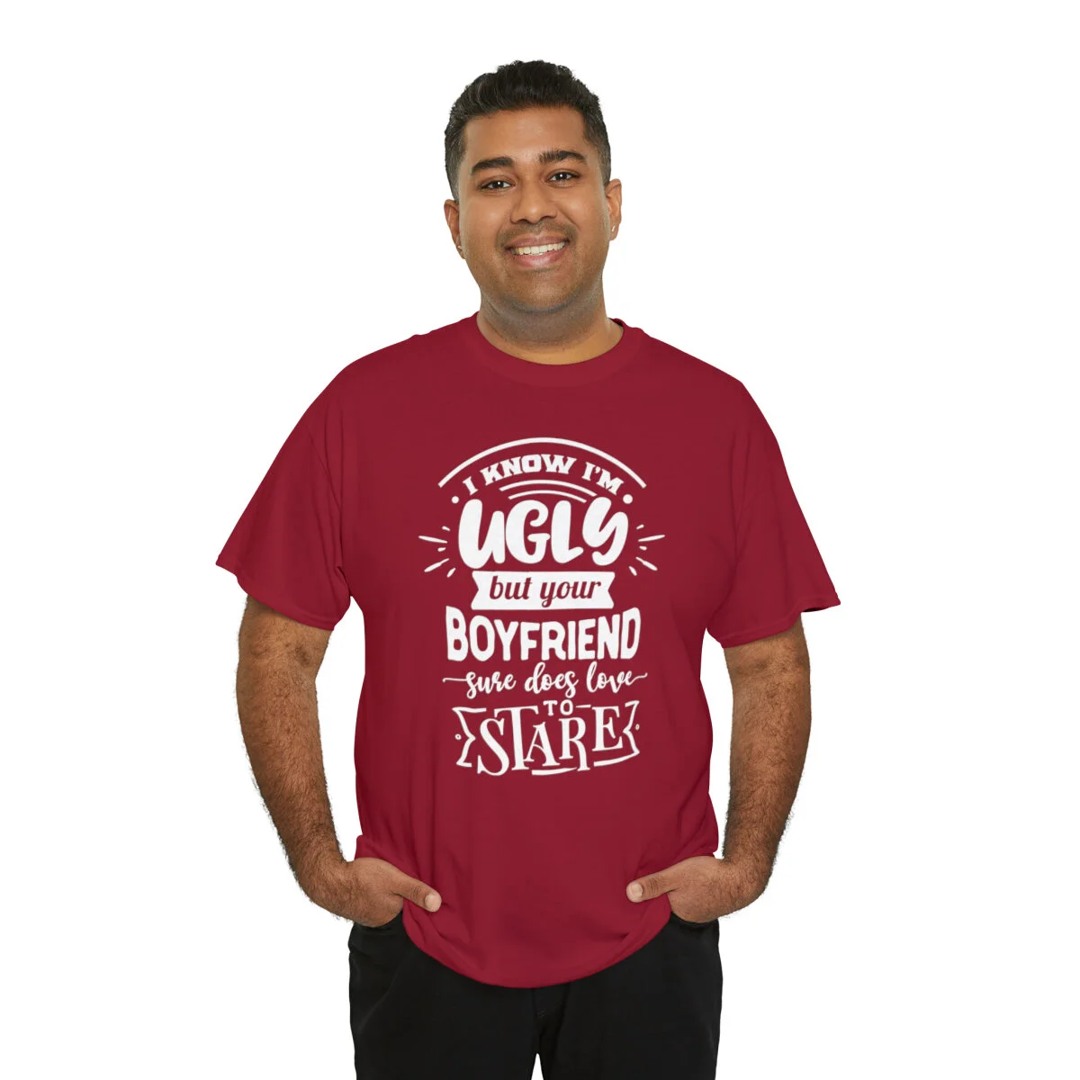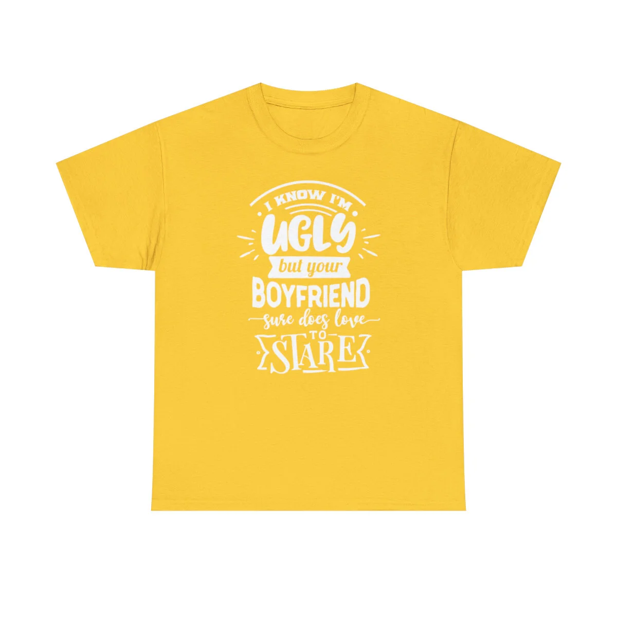 The front of the shirt features the bold and attention-grabbing phrase, "I know I'm ugly, but your boyfriend sure does love to stare." The words are cleverly arranged, with a playful font and eye-catching design, making it impossible to miss. The sarcastic tone is enhanced by the use of contrasting colors and a touch of irony.