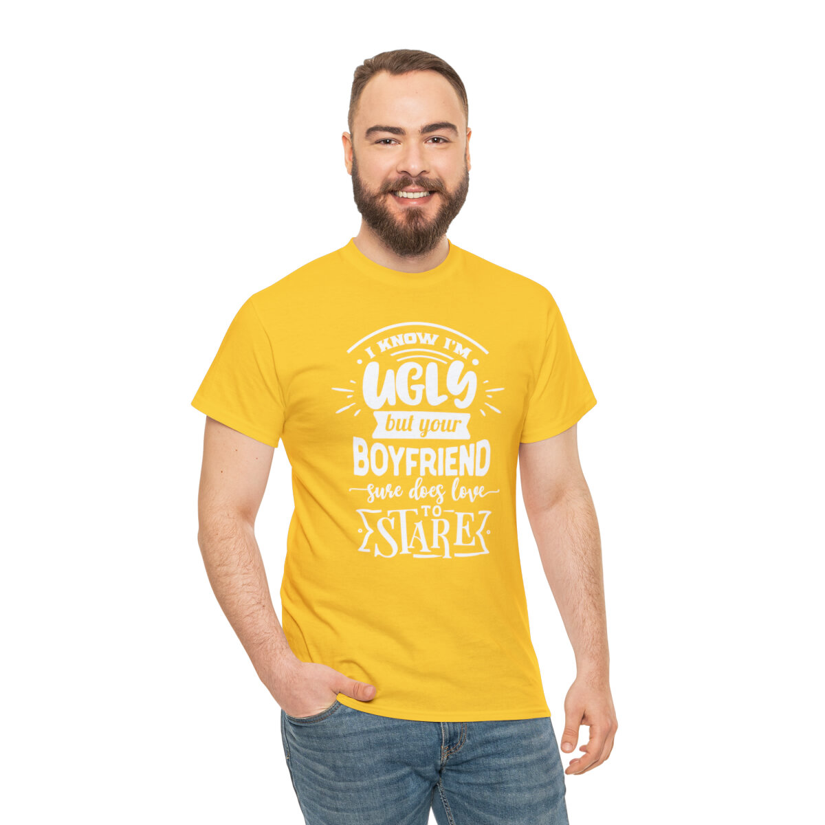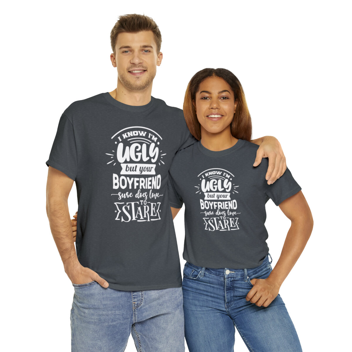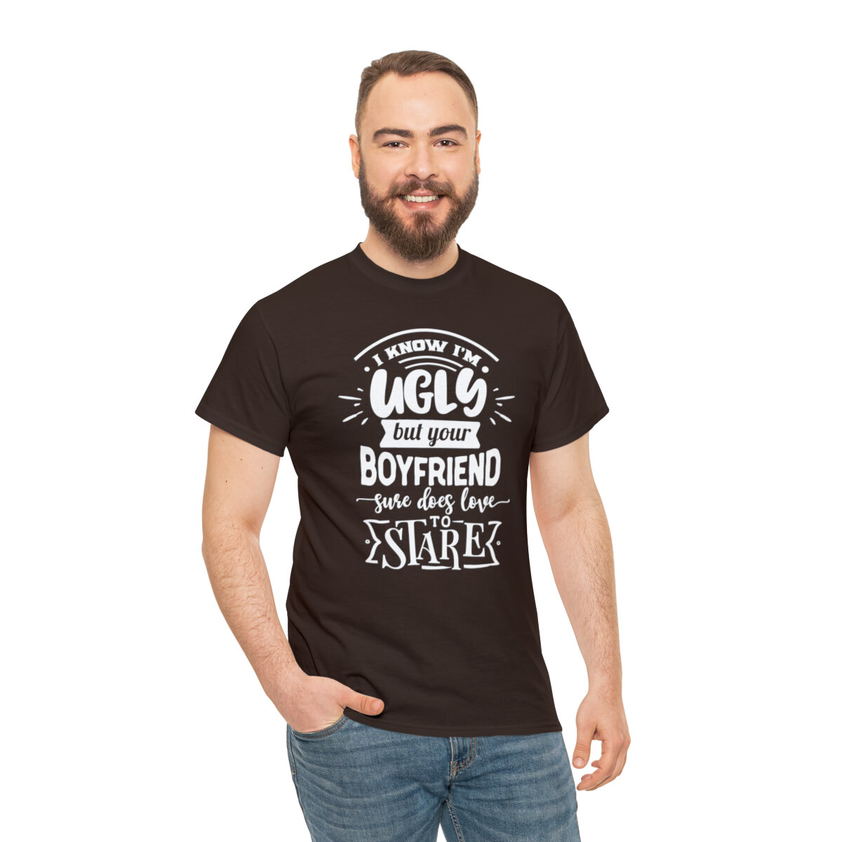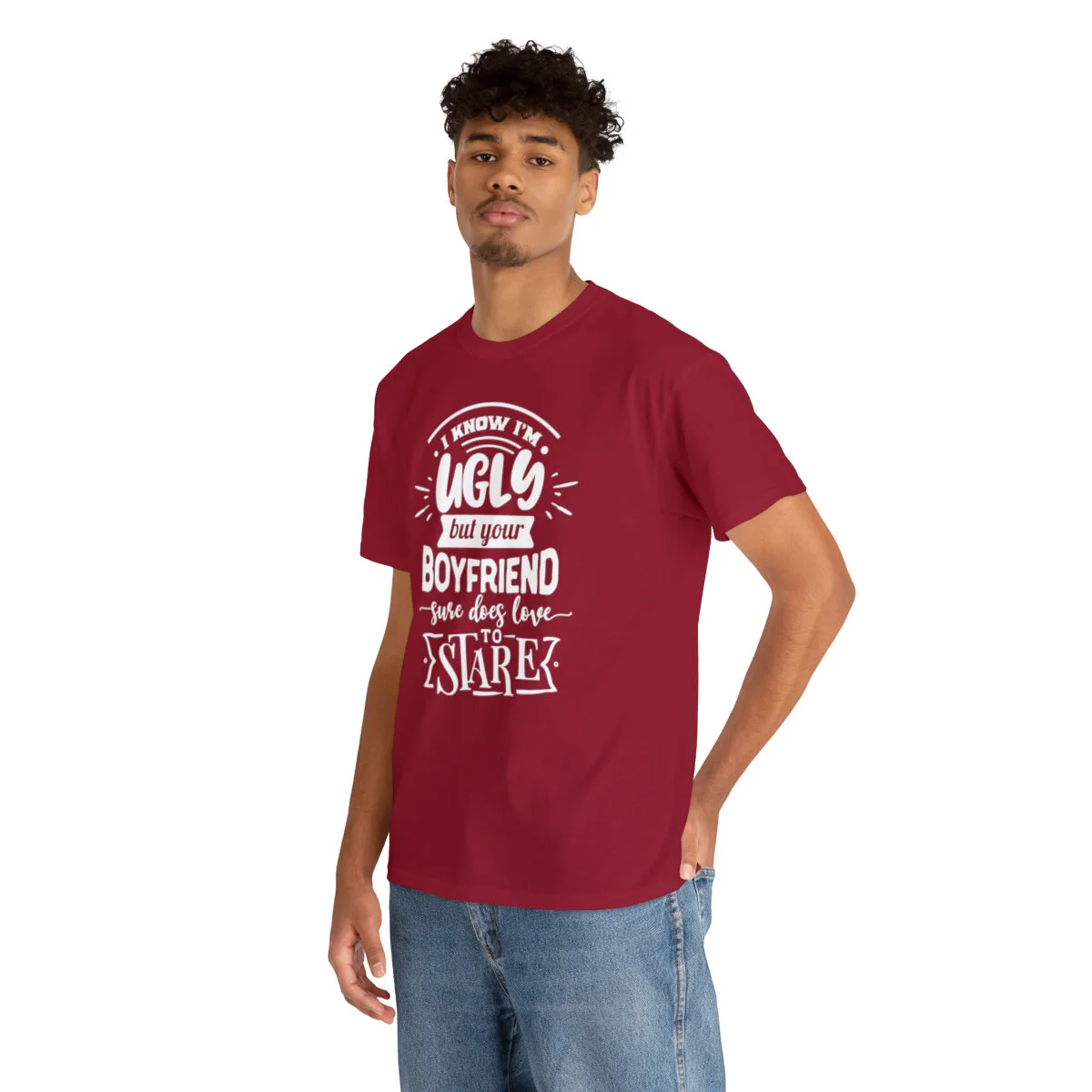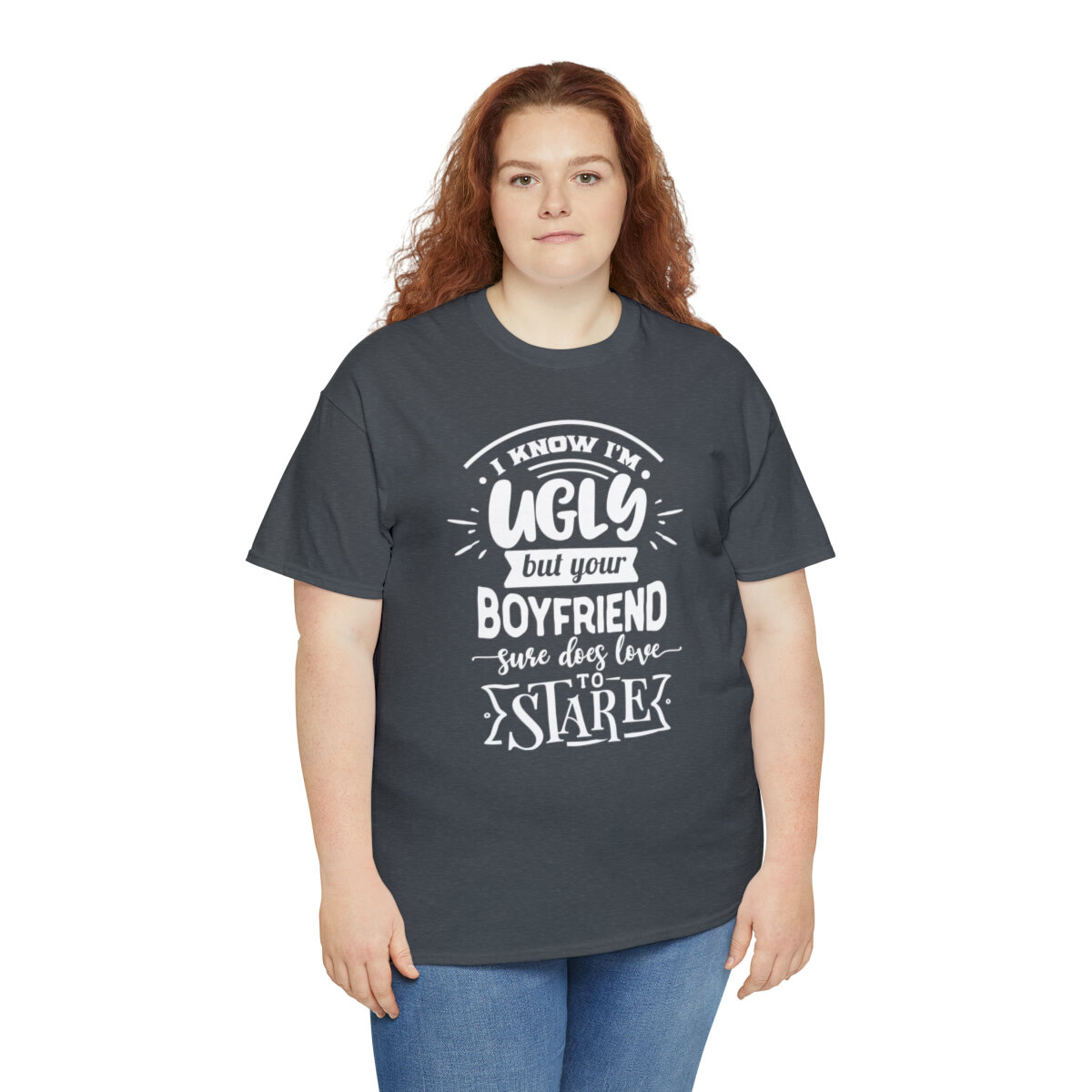 The front of the shirt features the bold and attention-grabbing phrase, "I know I'm ugly, but your boyfriend sure does love to stare." The words are cleverly arranged, with a playful font and eye-catching design, making it impossible to miss. The sarcastic tone is enhanced by the use of contrasting colors and a touch of irony.