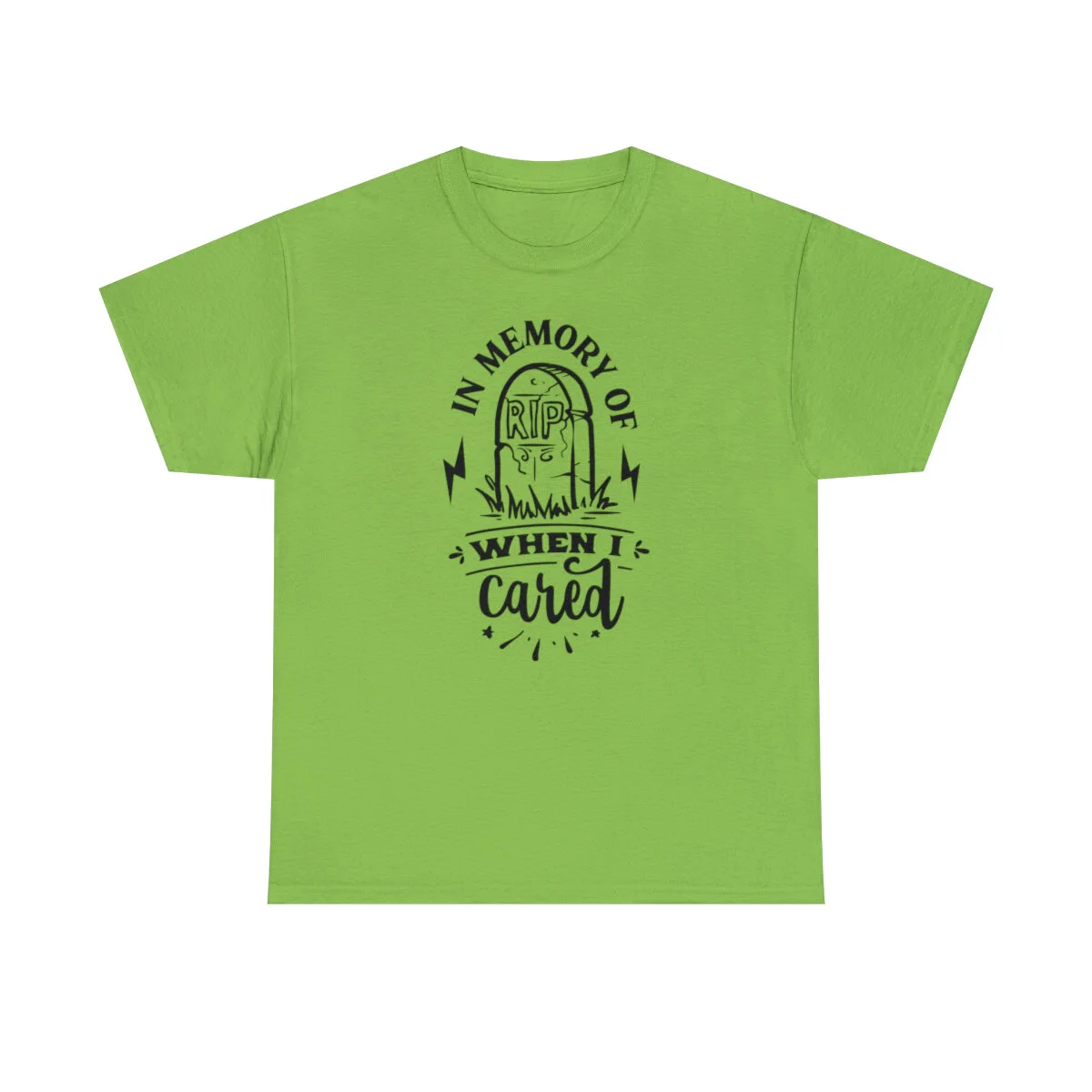 Crafted with care, this t-shirt is made from high-quality fabric to ensure exceptional comfort and durability. The design features the clever phrase, "In memory of when I cared," elegantly displayed in multiple colors. Choose from a variety of vibrant options, including red, blue, yellow, or classic black and white, to find the hue that best matches your style and personality.