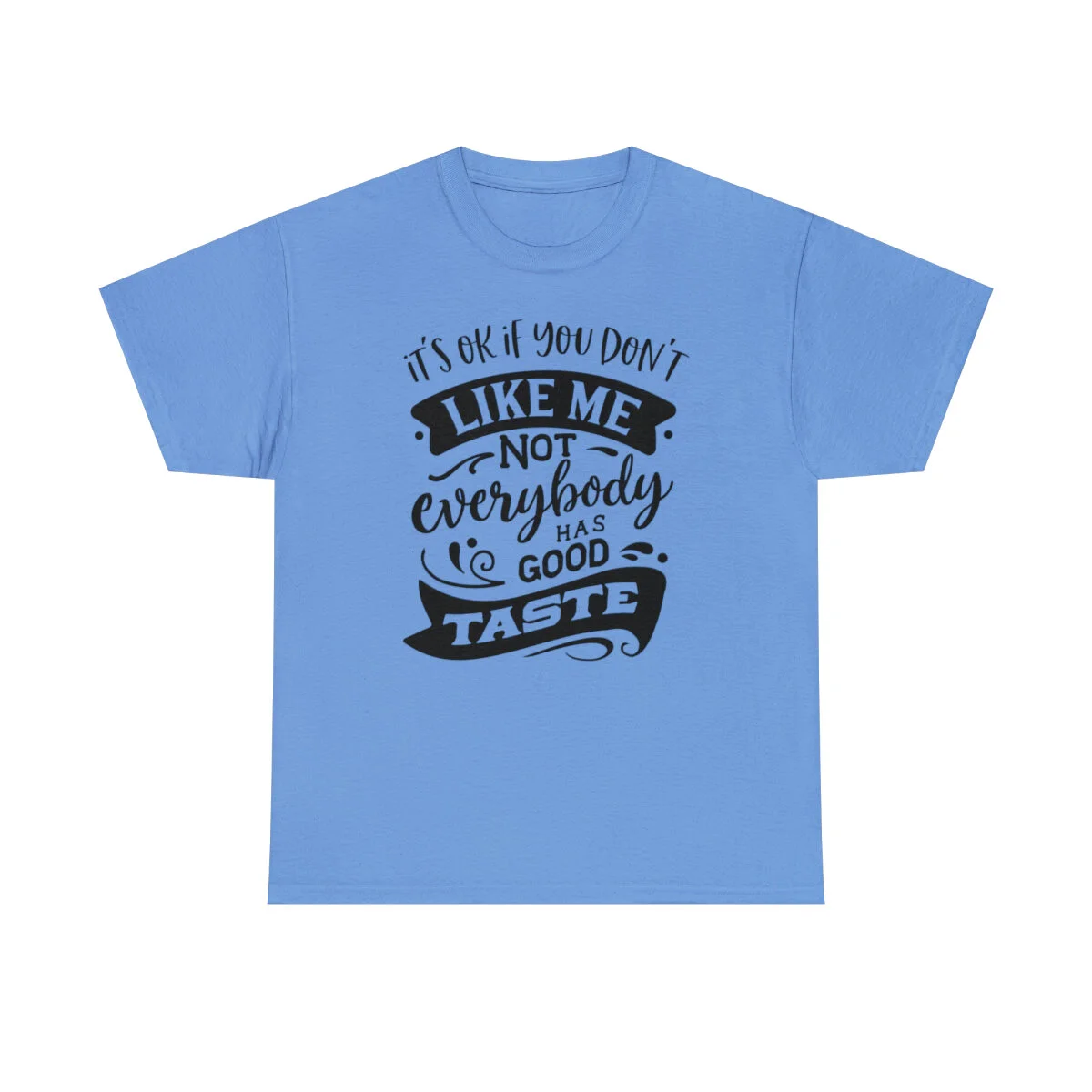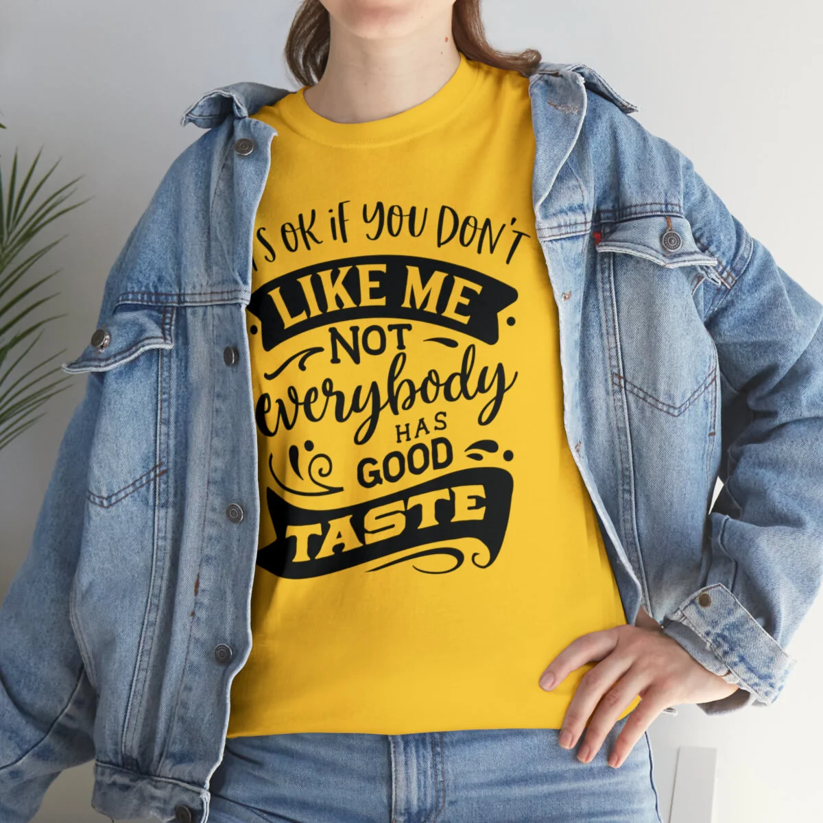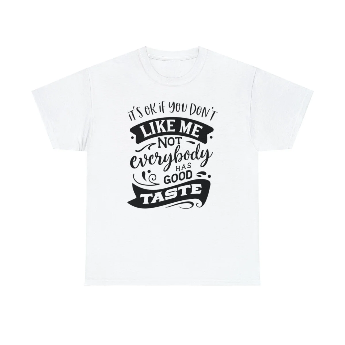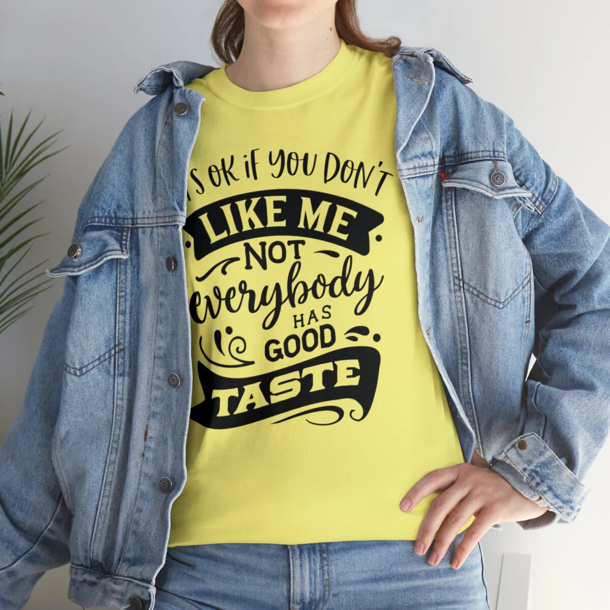 Crafted with care, this t-shirt is made from high-quality fabric to ensure exceptional comfort and durability. The design features the clever phrase, "It's okay if you don't like me. Not everyone has good taste," elegantly displayed in multiple colors. Choose from a variety of vibrant options, including red, blue, yellow, or classic black and white, to find the hue that best matches your style and personality.
