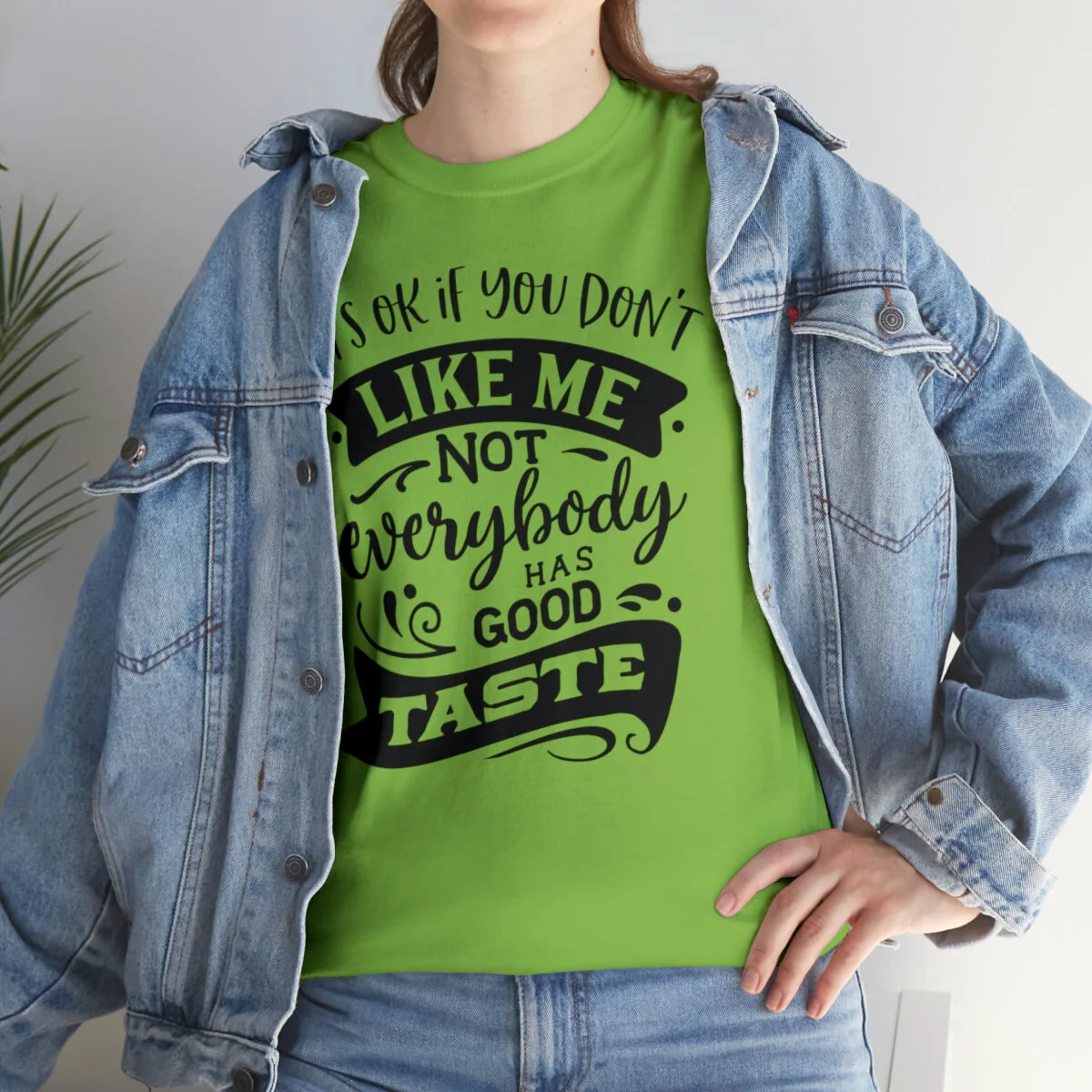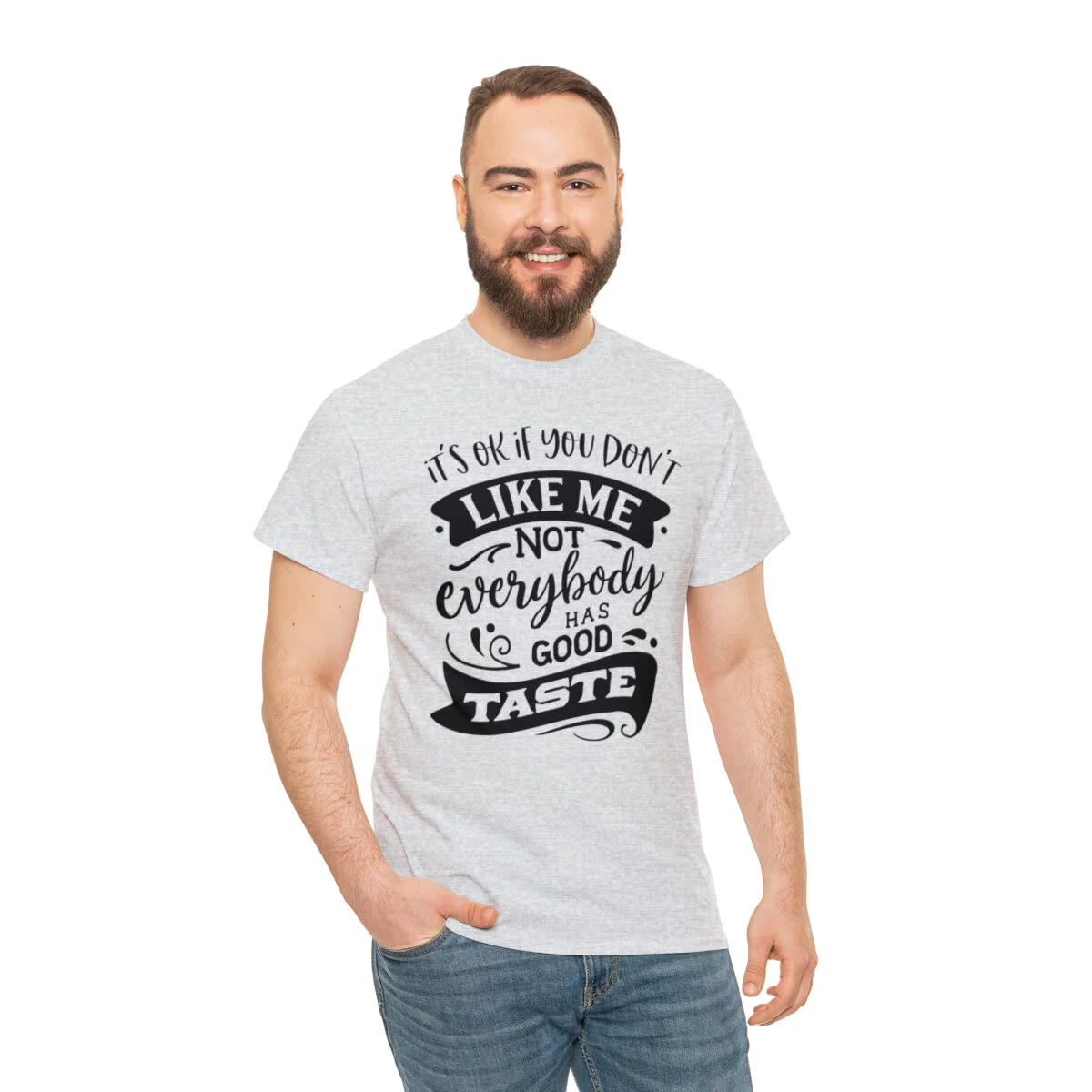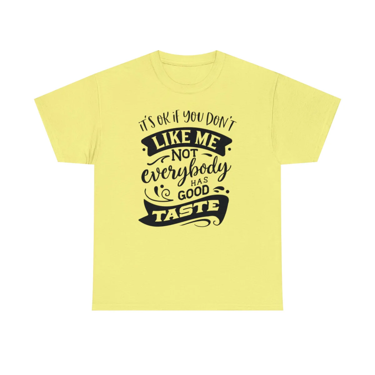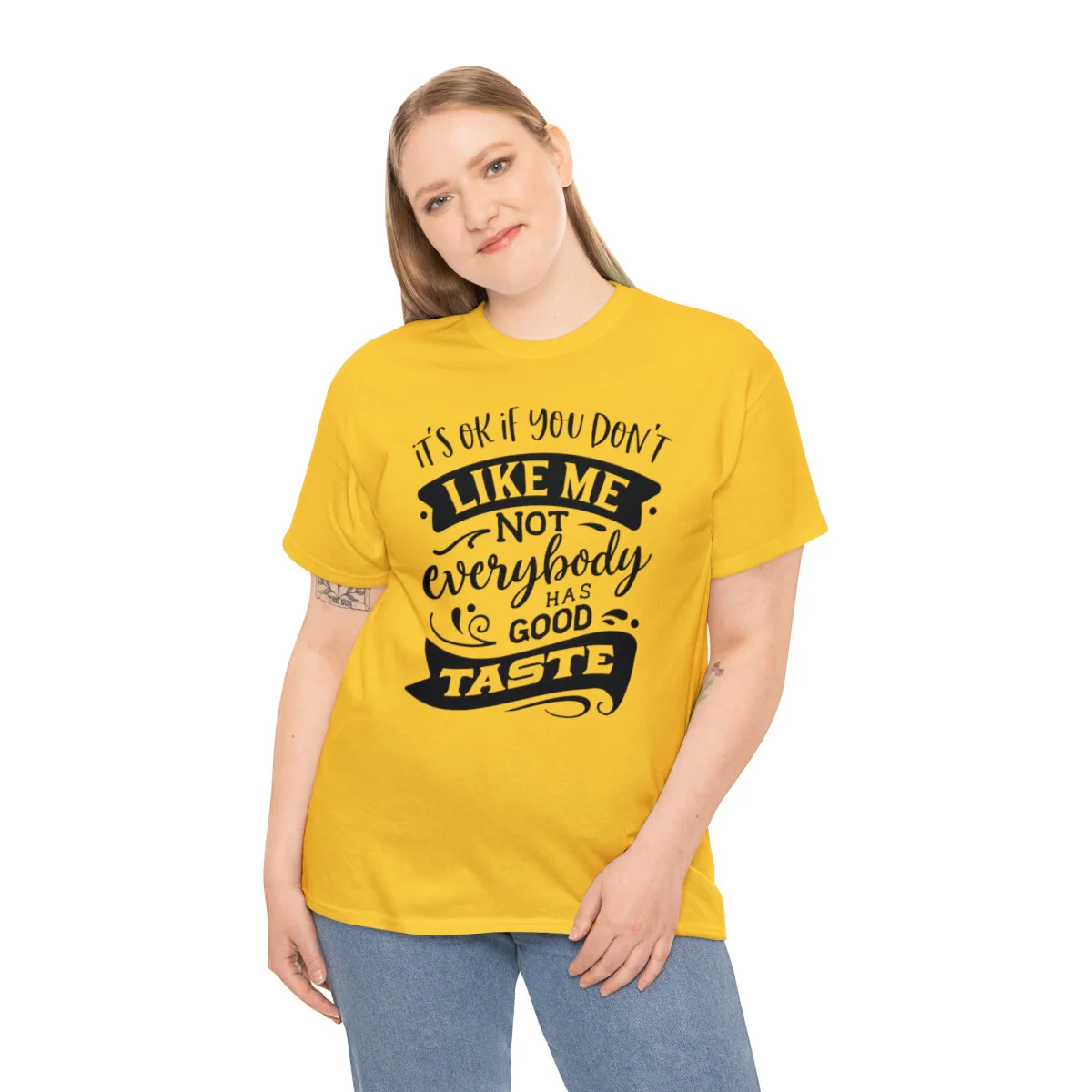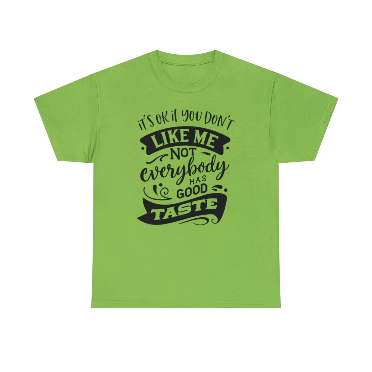 Crafted with care, this t-shirt is made from high-quality fabric to ensure exceptional comfort and durability. The design features the clever phrase, "It's okay if you don't like me. Not everyone has good taste," elegantly displayed in multiple colors. Choose from a variety of vibrant options, including red, blue, yellow, or classic black and white, to find the hue that best matches your style and personality.