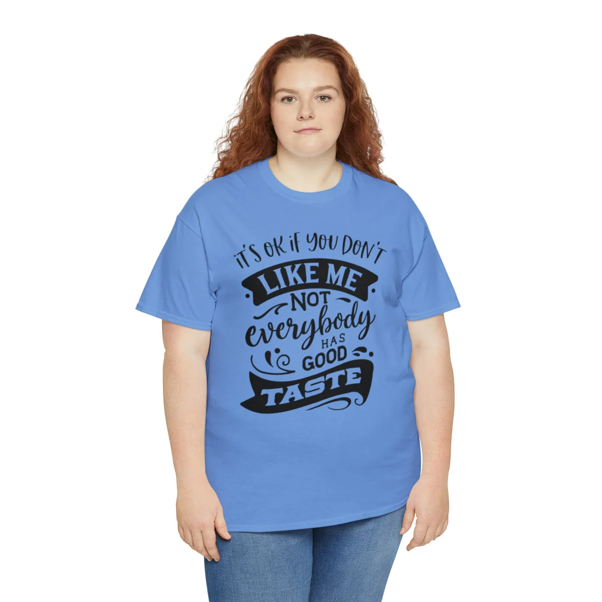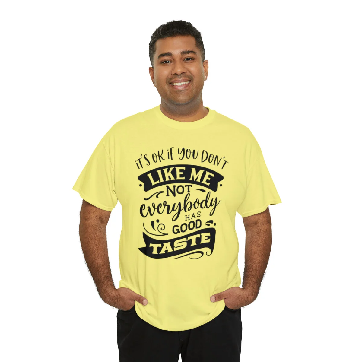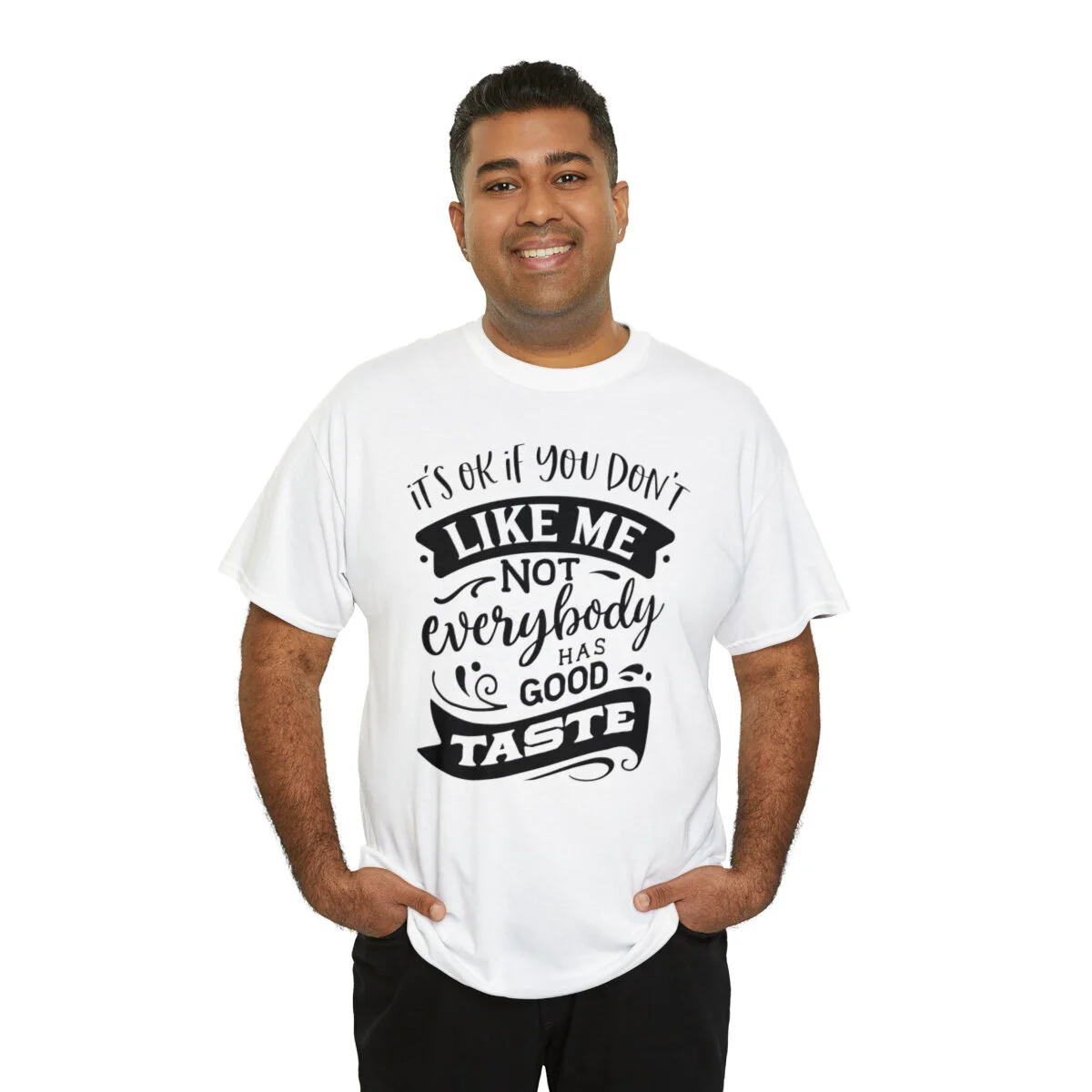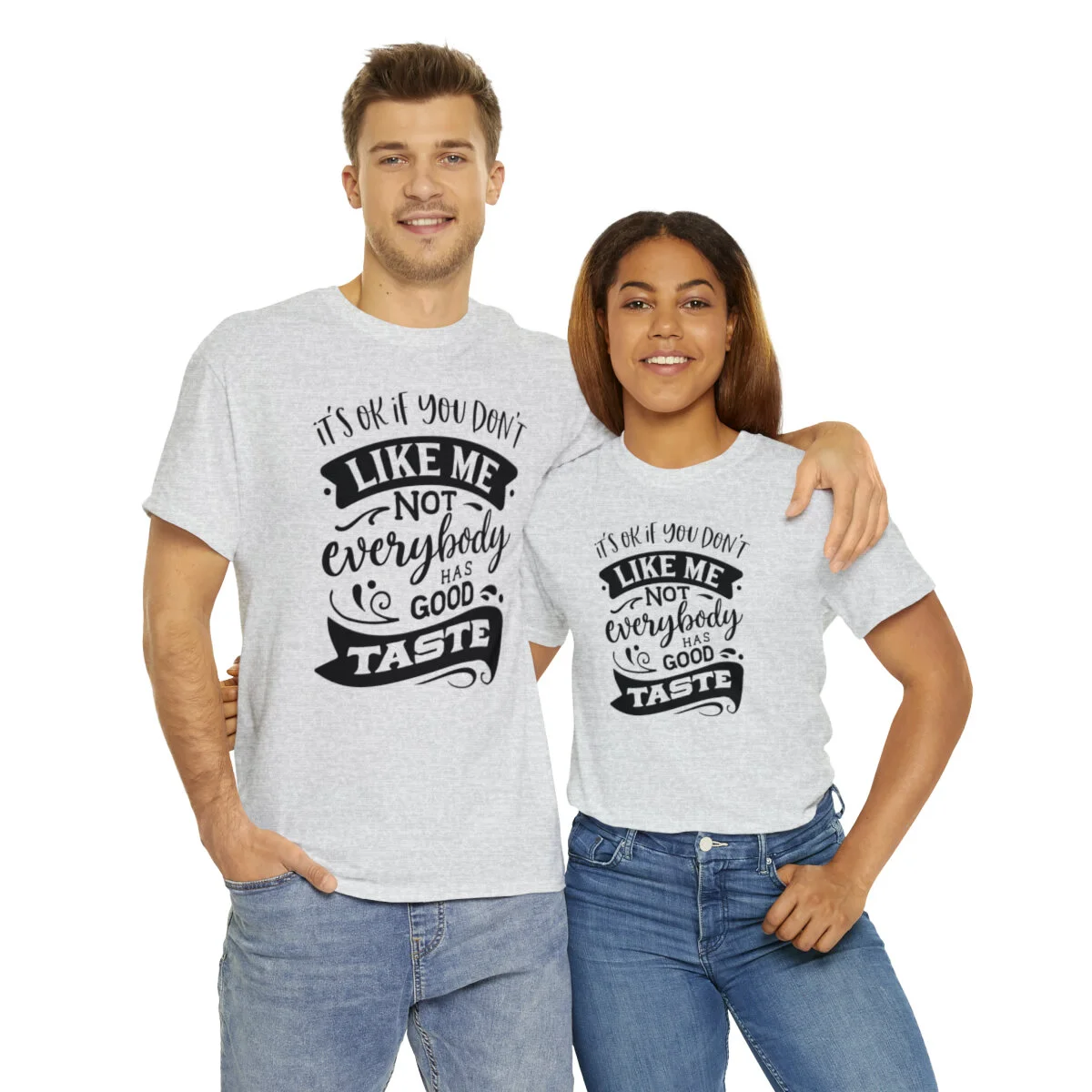 Crafted with care, this t-shirt is made from high-quality fabric to ensure exceptional comfort and durability. The design features the clever phrase, "It's okay if you don't like me. Not everyone has good taste," elegantly displayed in multiple colors. Choose from a variety of vibrant options, including red, blue, yellow, or classic black and white, to find the hue that best matches your style and personality.