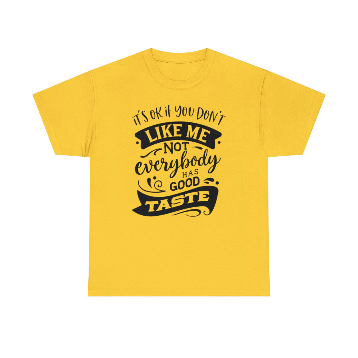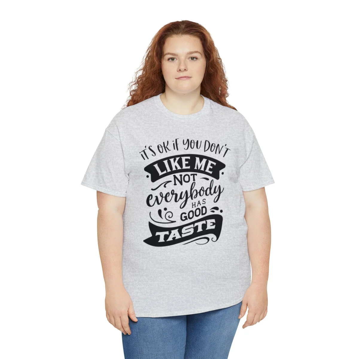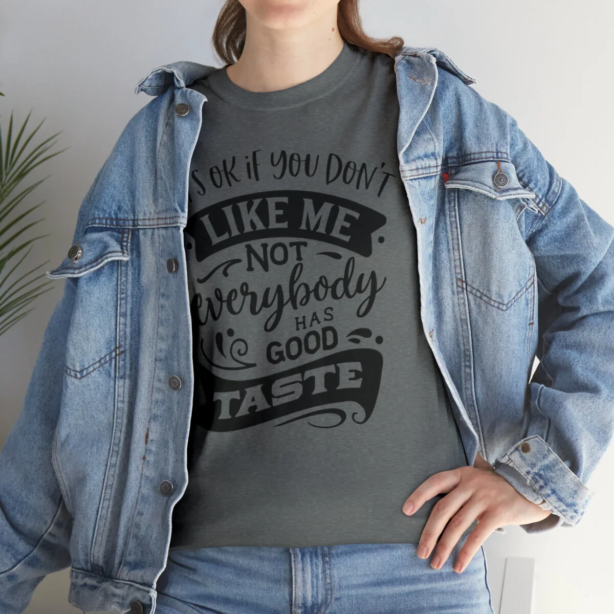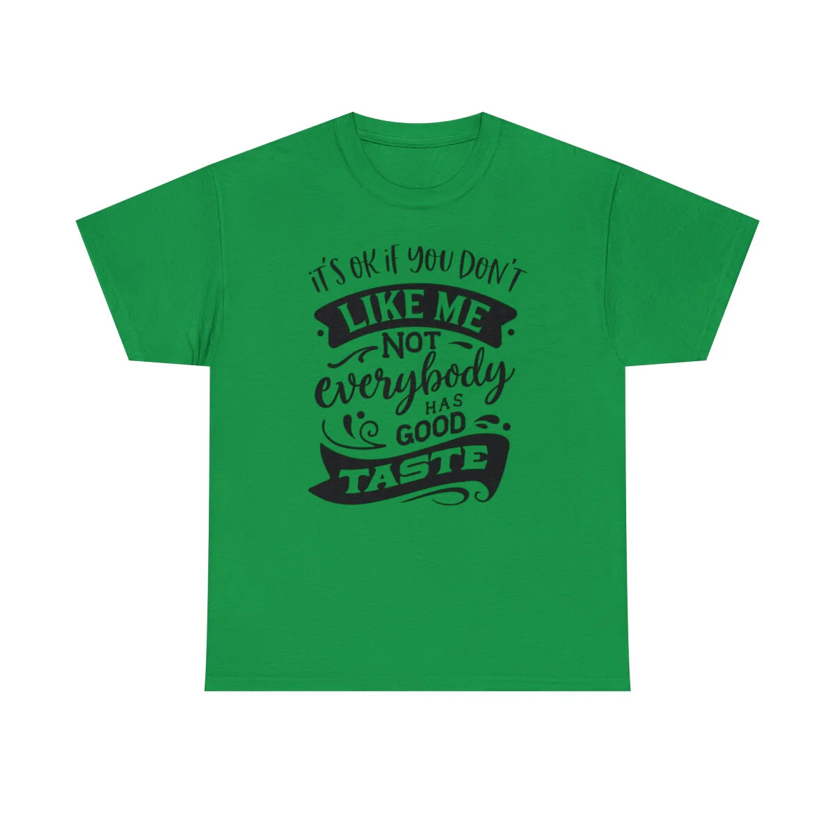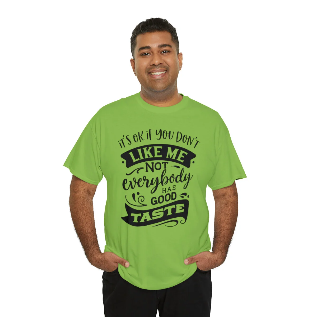 Crafted with care, this t-shirt is made from high-quality fabric to ensure exceptional comfort and durability. The design features the clever phrase, "It's okay if you don't like me. Not everyone has good taste," elegantly displayed in multiple colors. Choose from a variety of vibrant options, including red, blue, yellow, or classic black and white, to find the hue that best matches your style and personality.