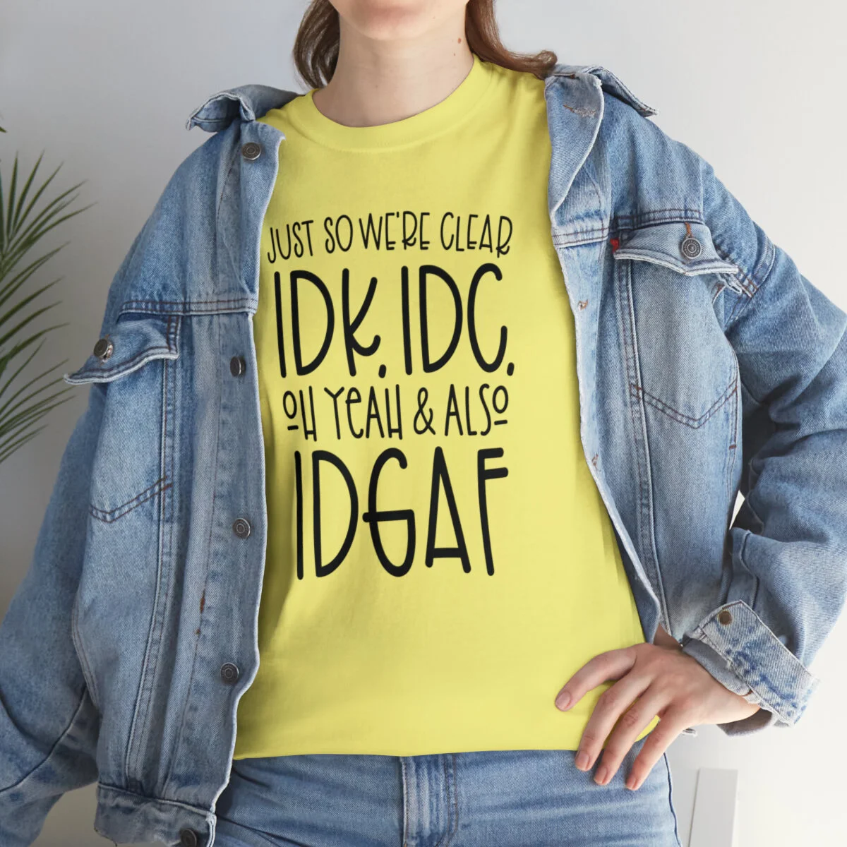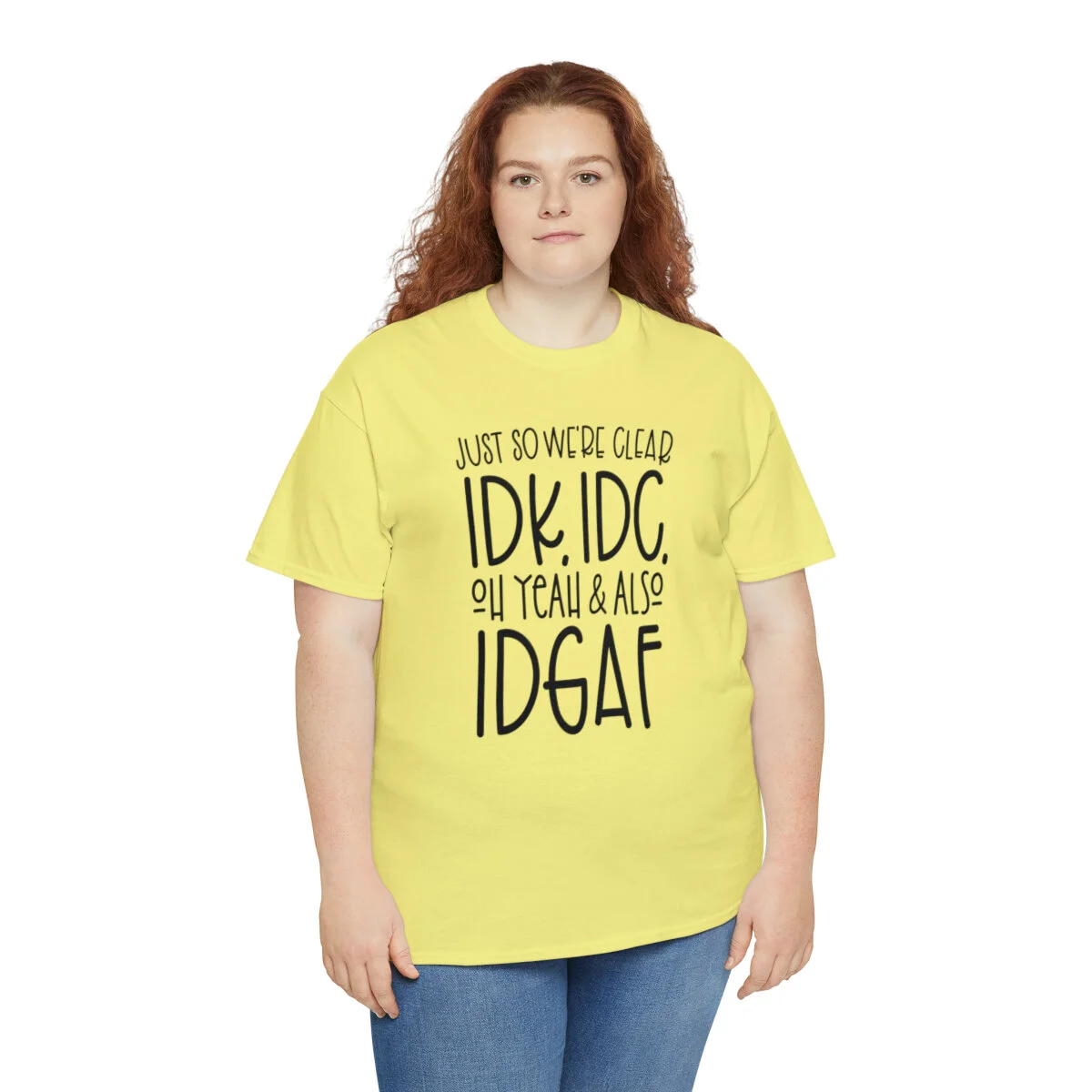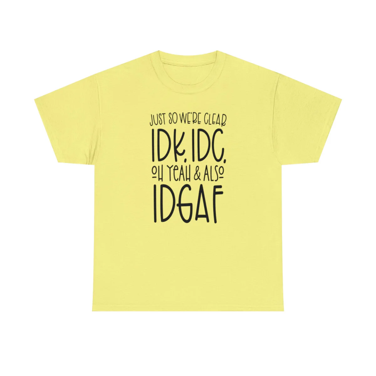 Crafted with care, this t-shirt is made from high-quality fabric to ensure exceptional comfort and durability. The design features the bold statement, "Just so we're clear, IDK. IDC. Oh Yeah & IDGAF." creatively displayed in multiple colors. Choose from a variety of vibrant options, including red, blue, yellow, or classic black and white, to match your personal style.