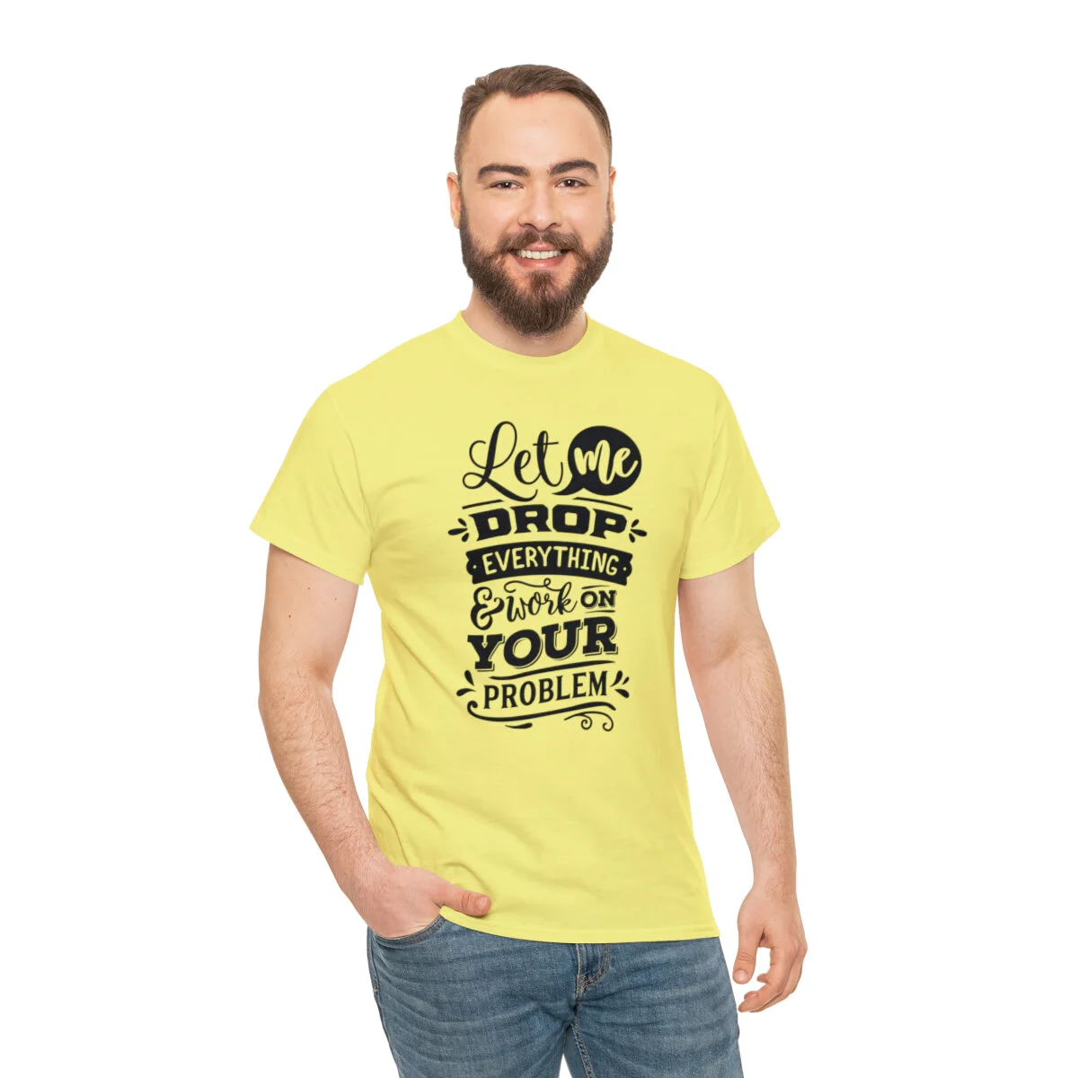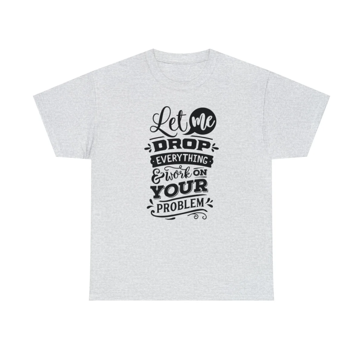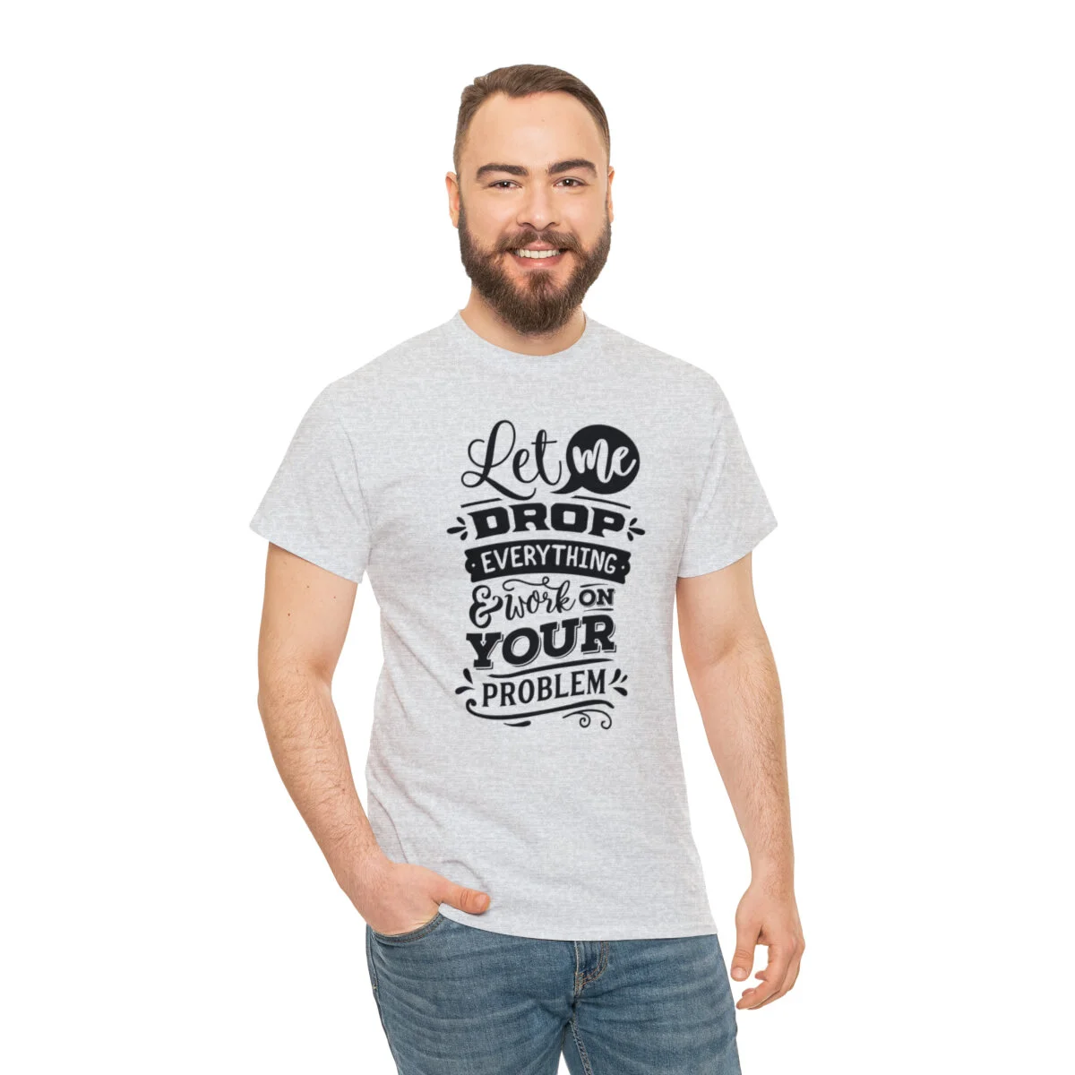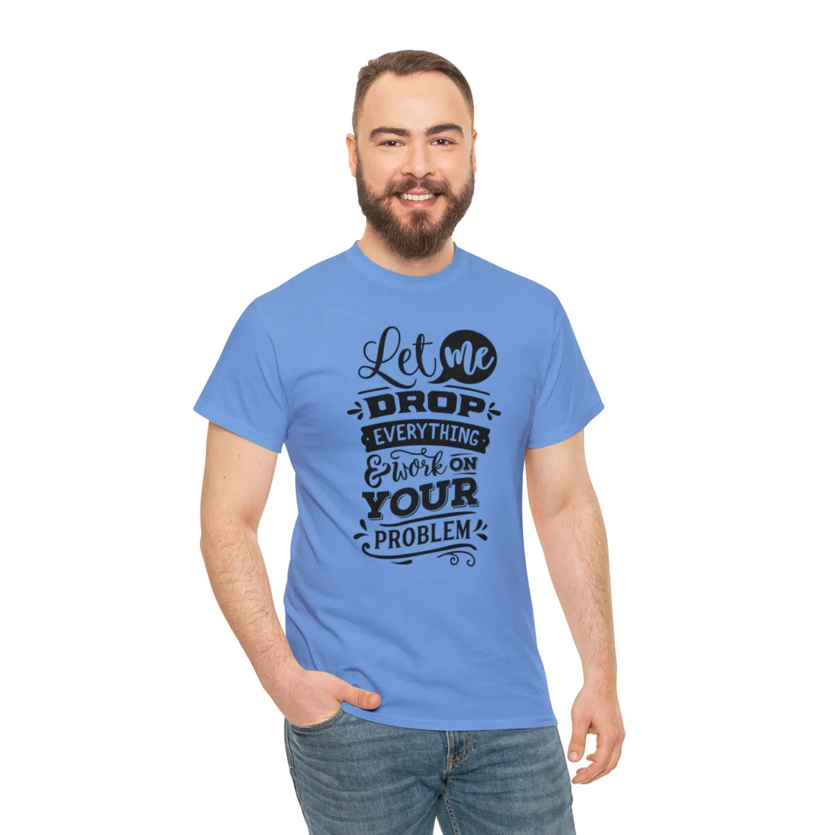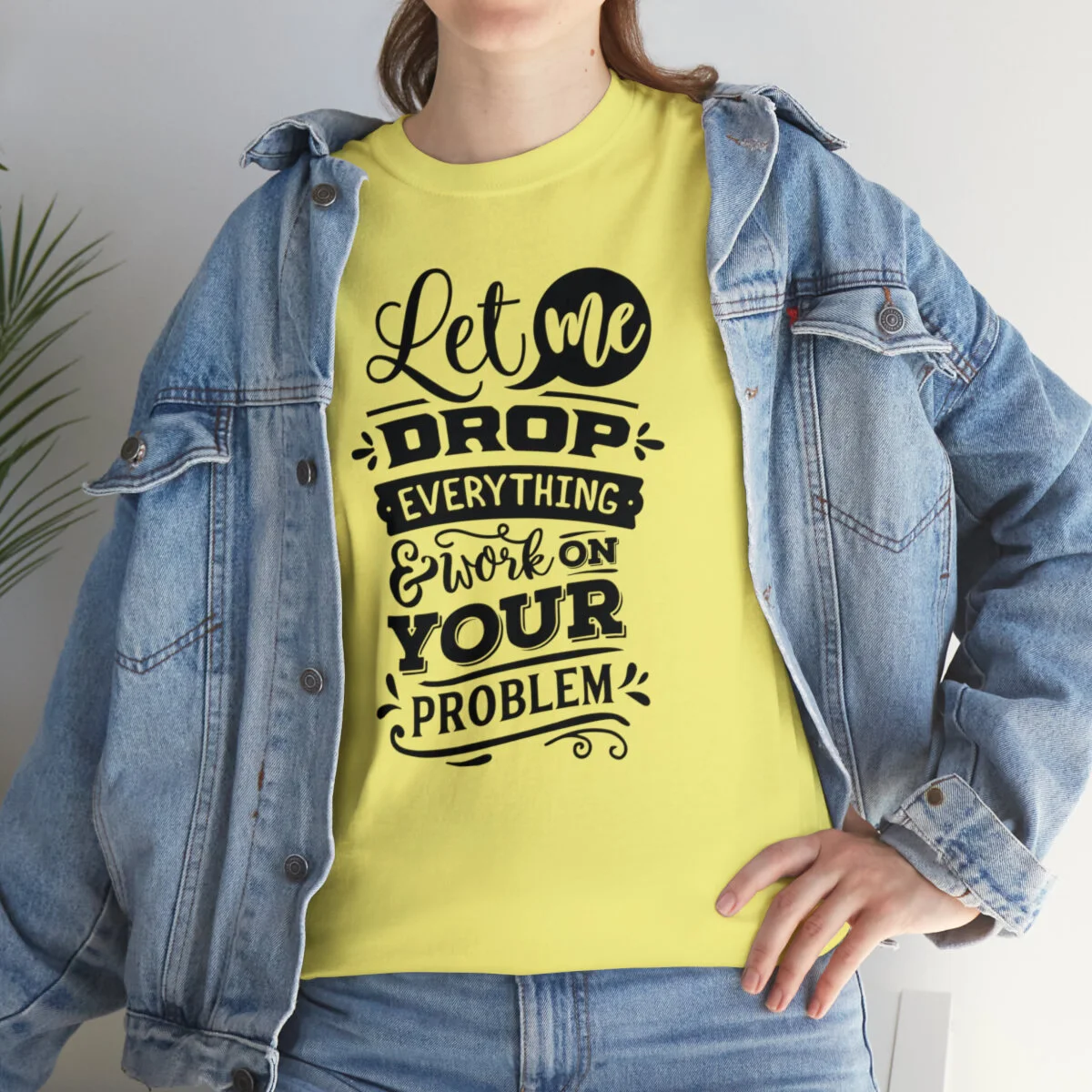 Crafted with care, this t-shirt is made from high-quality fabric to ensure exceptional comfort and durability. The design features the clever phrase, "Let me drop everything and work on your problem," elegantly displayed in multiple colors. Choose from a variety of vibrant options, including red, blue, yellow, or classic black and white, to find the hue that best matches your style and personality.