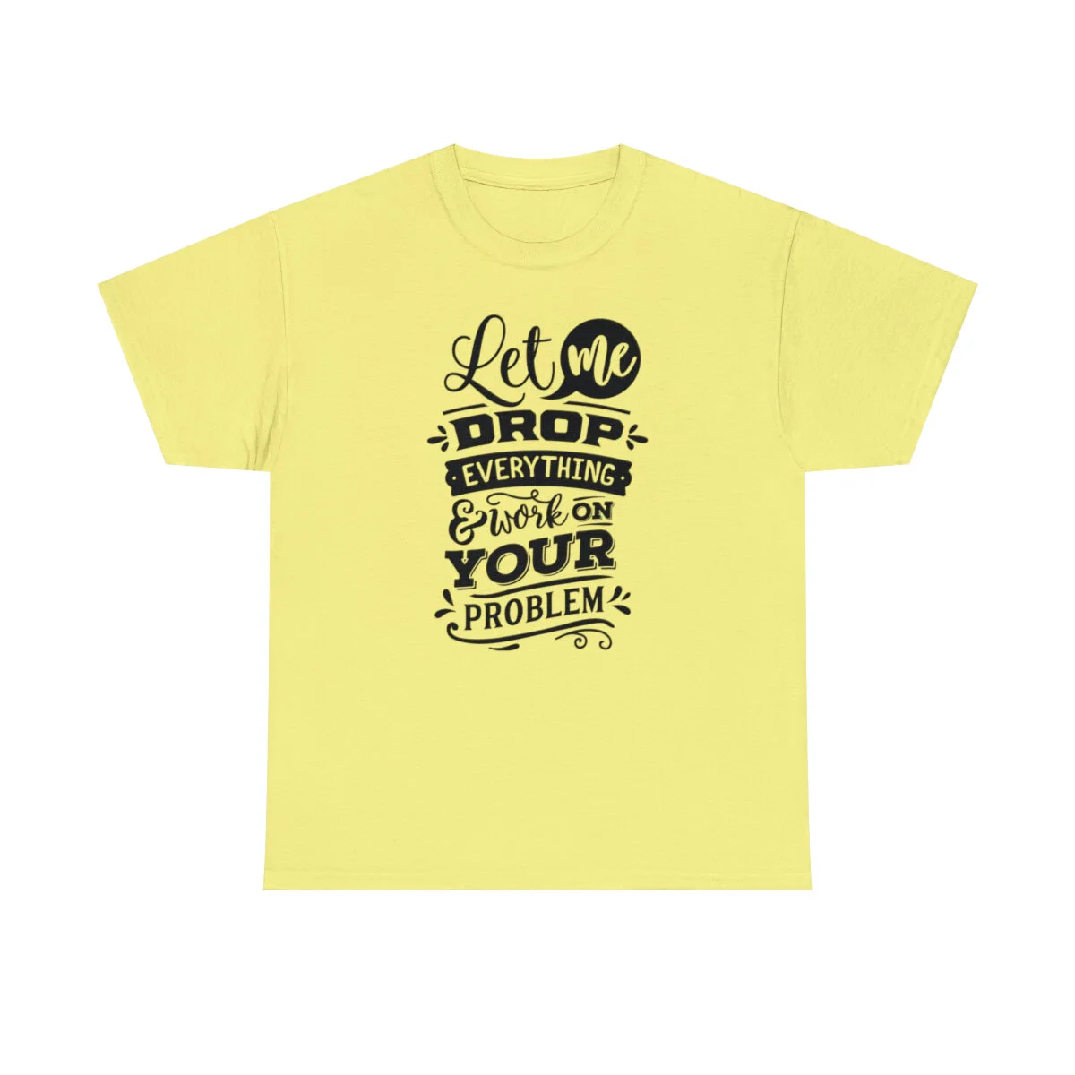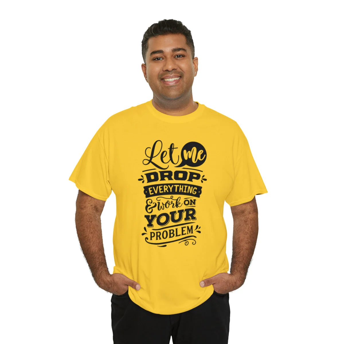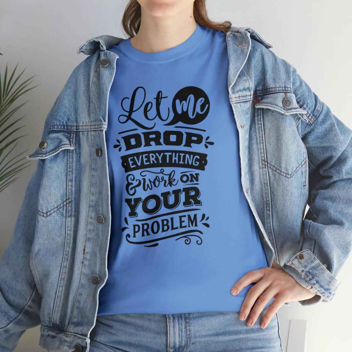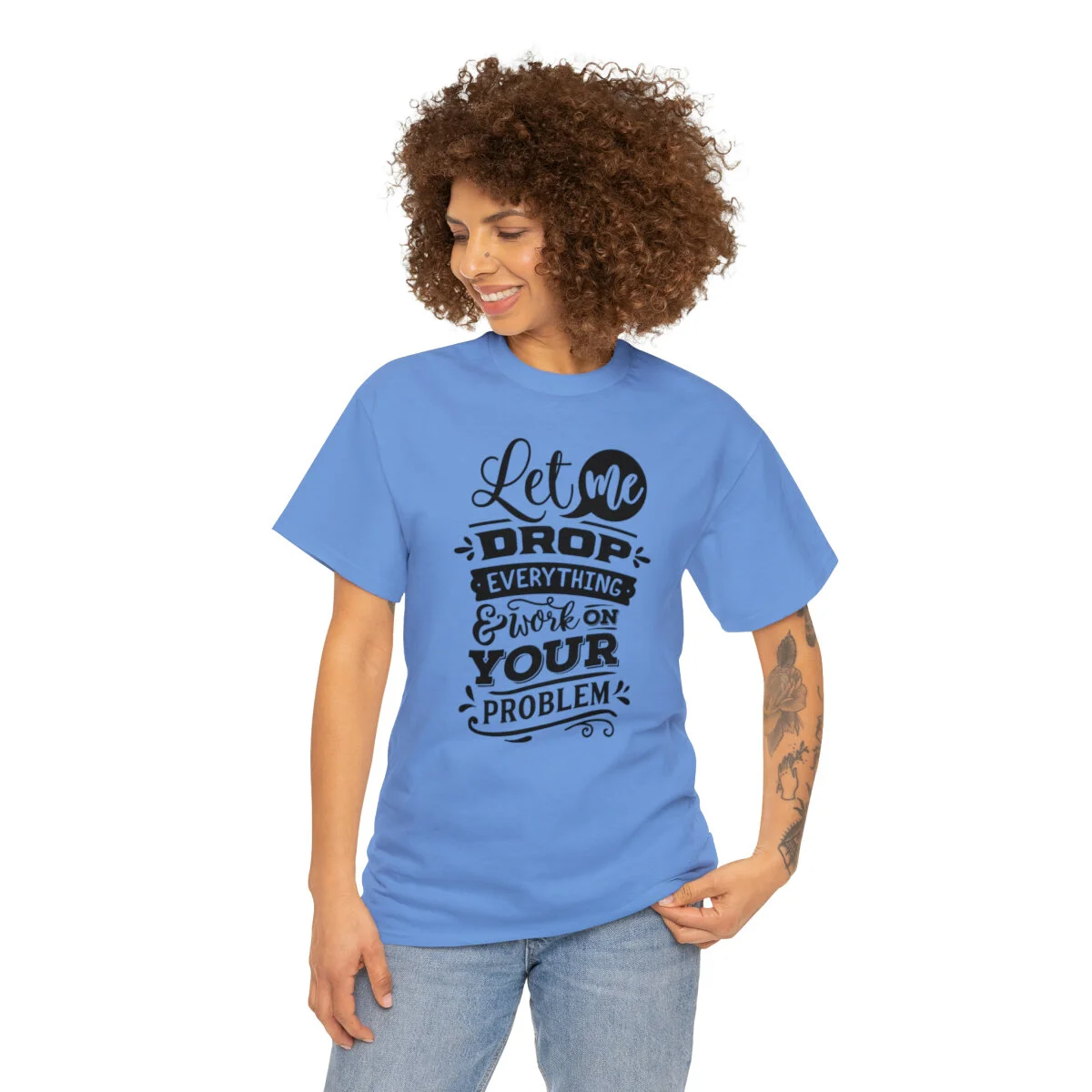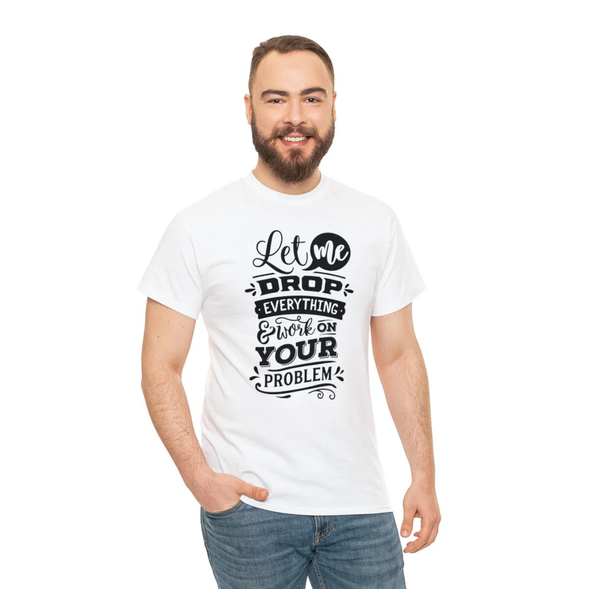 Crafted with care, this t-shirt is made from high-quality fabric to ensure exceptional comfort and durability. The design features the clever phrase, "Let me drop everything and work on your problem," elegantly displayed in multiple colors. Choose from a variety of vibrant options, including red, blue, yellow, or classic black and white, to find the hue that best matches your style and personality.
