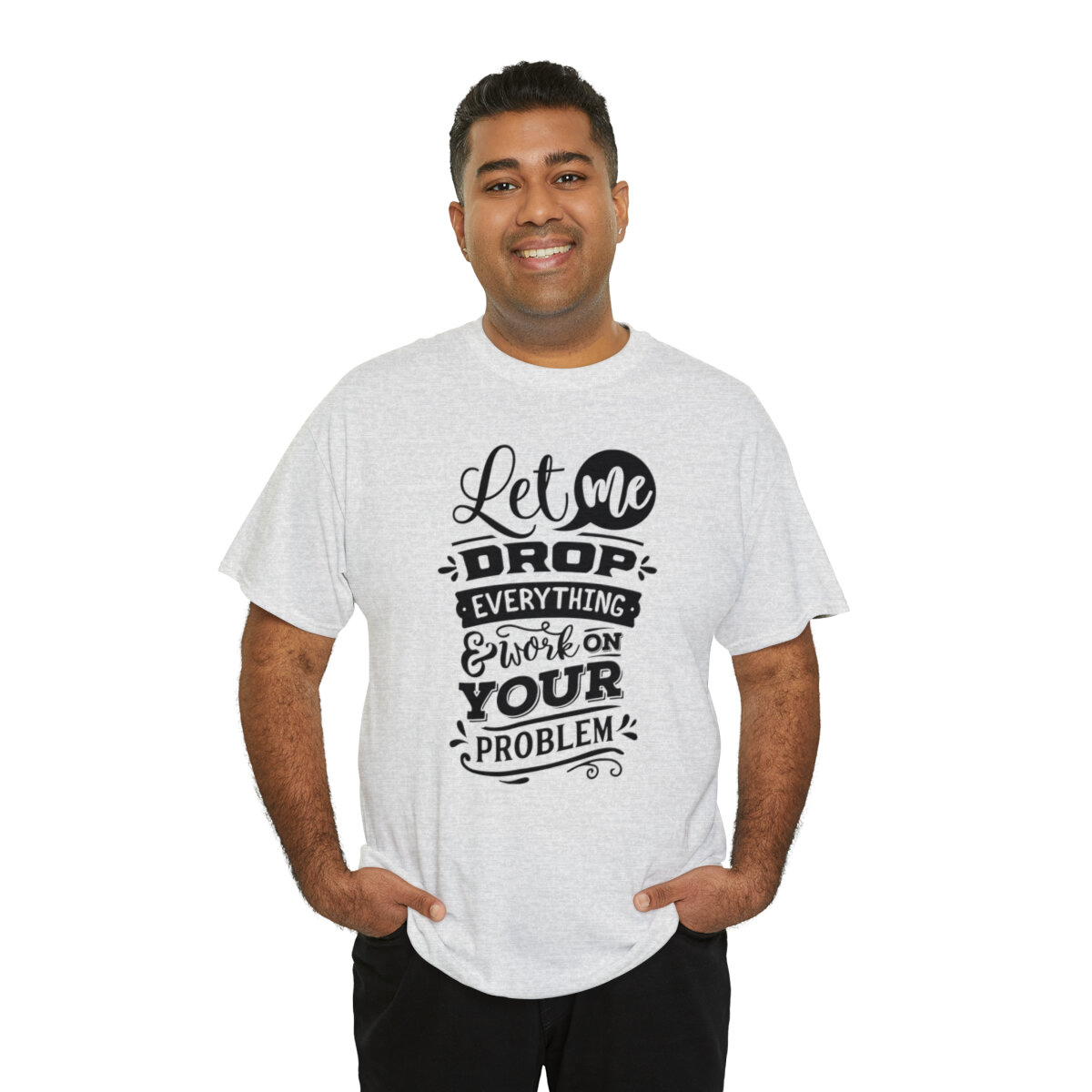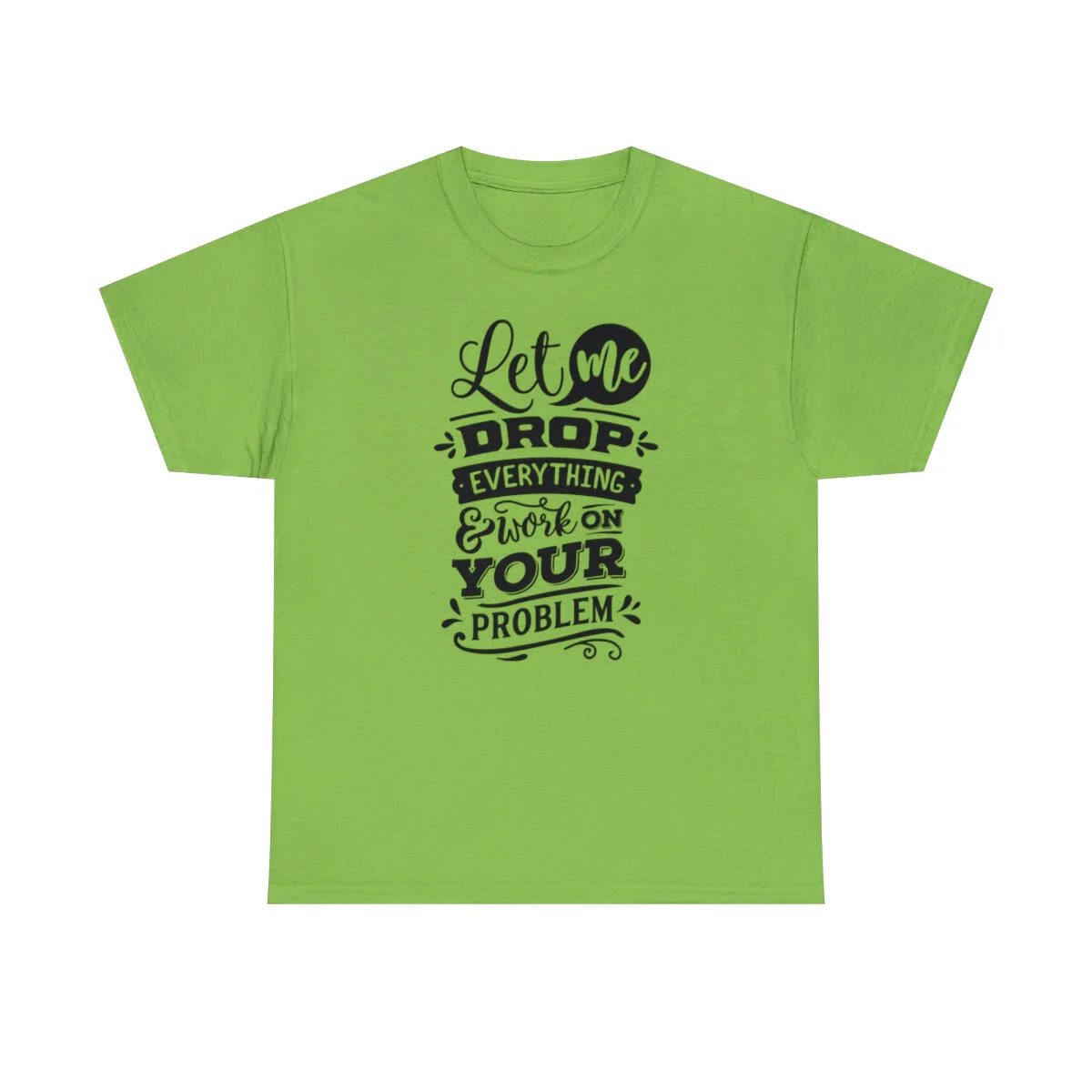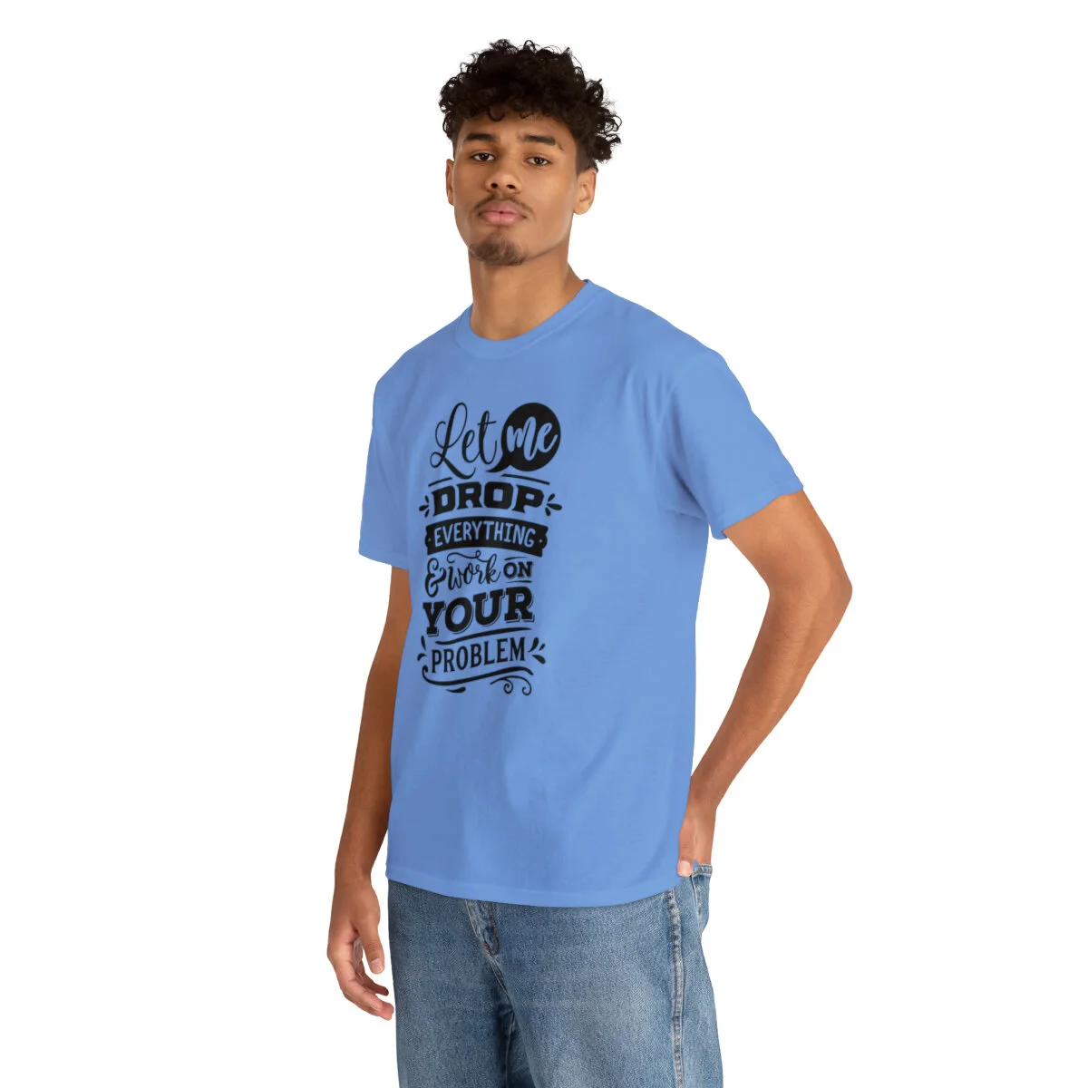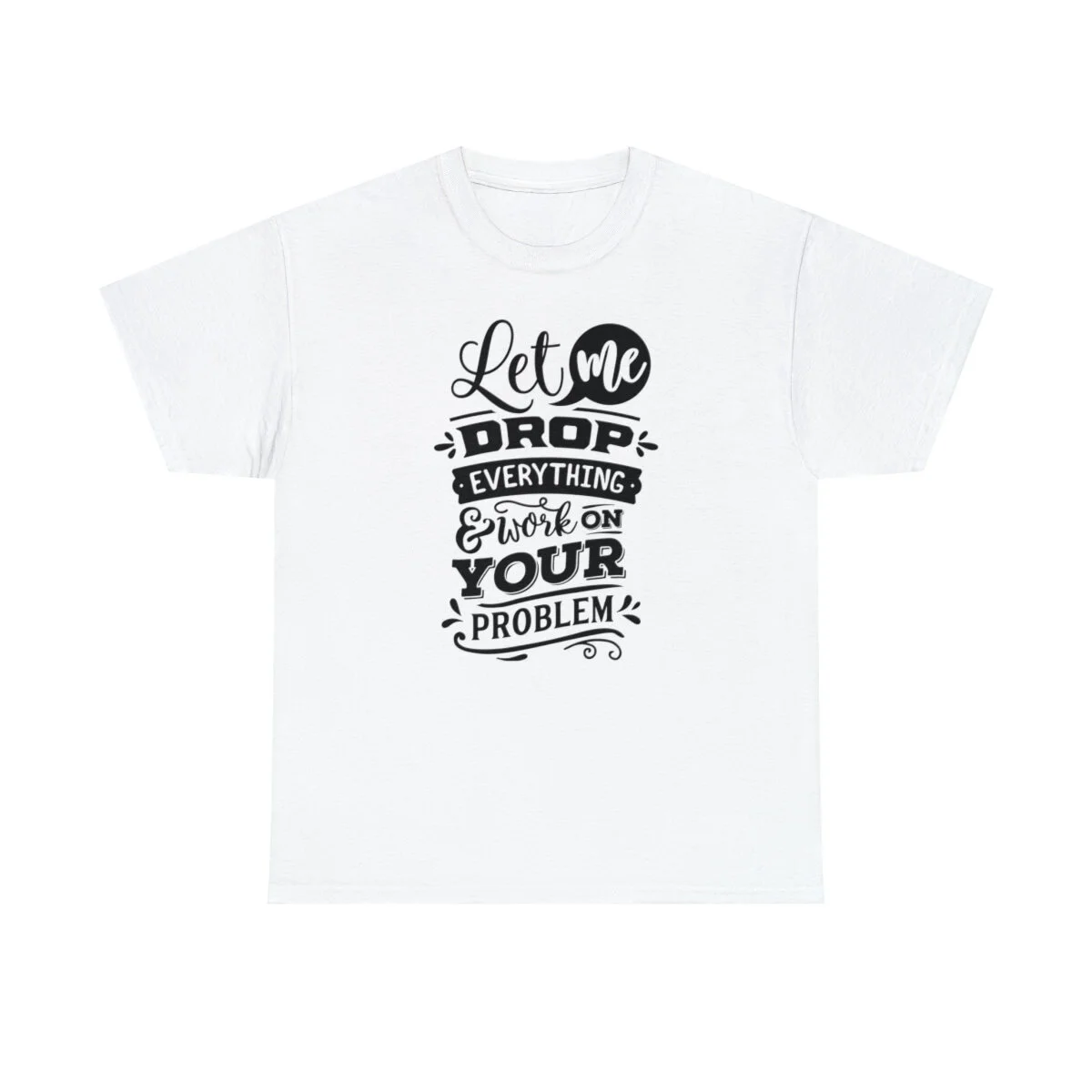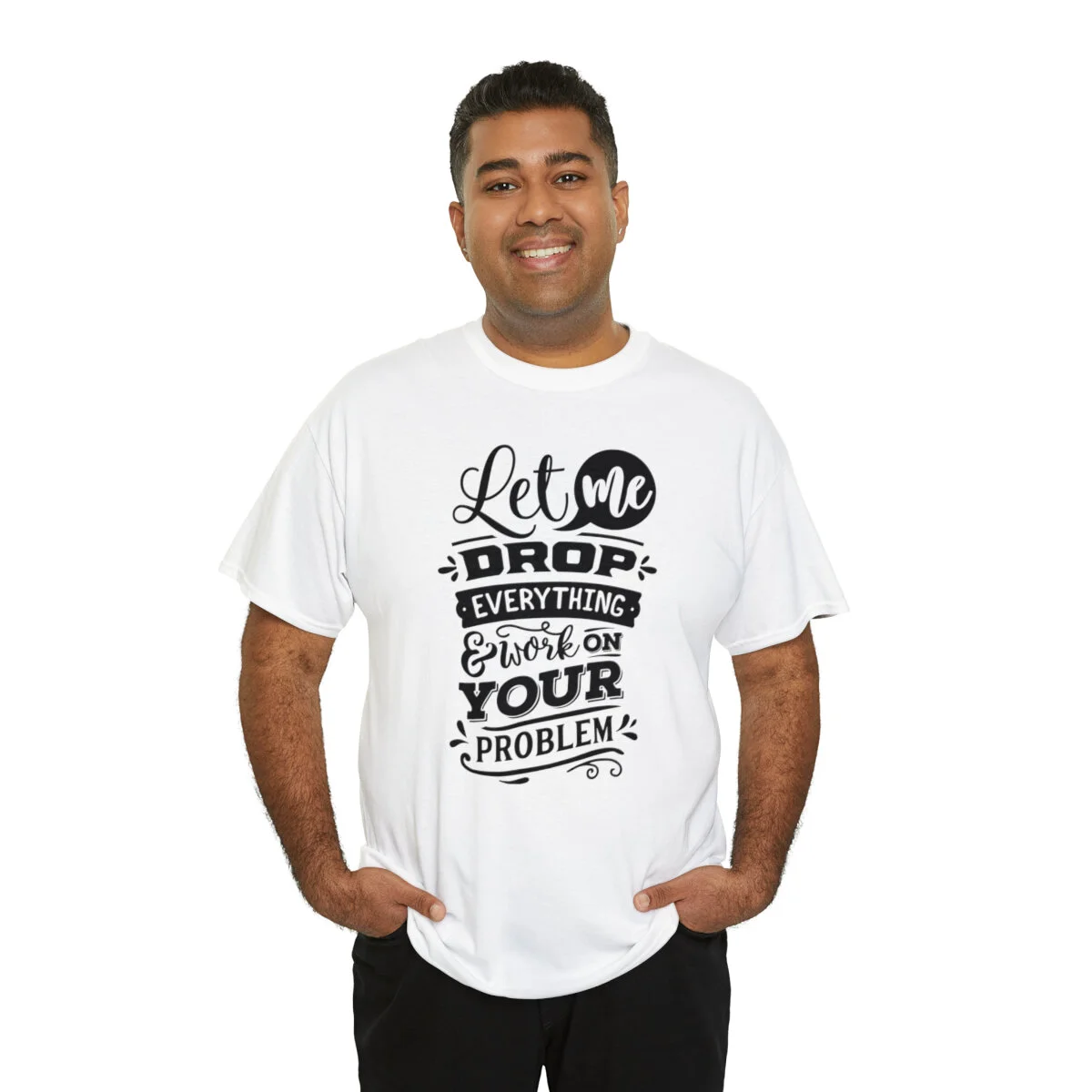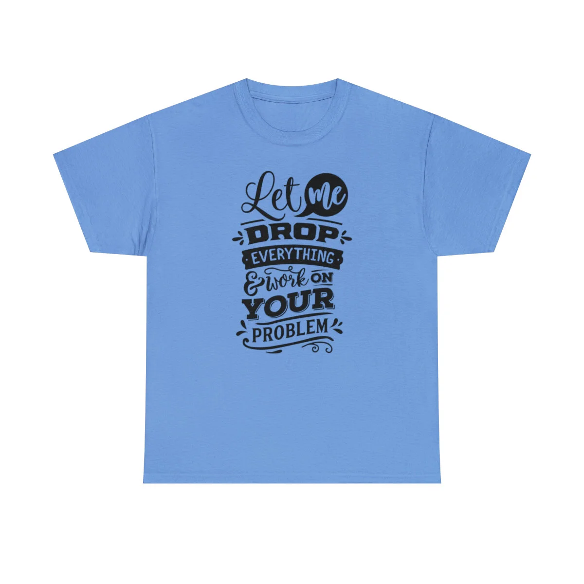 Crafted with care, this t-shirt is made from high-quality fabric to ensure exceptional comfort and durability. The design features the clever phrase, "Let me drop everything and work on your problem," elegantly displayed in multiple colors. Choose from a variety of vibrant options, including red, blue, yellow, or classic black and white, to find the hue that best matches your style and personality.