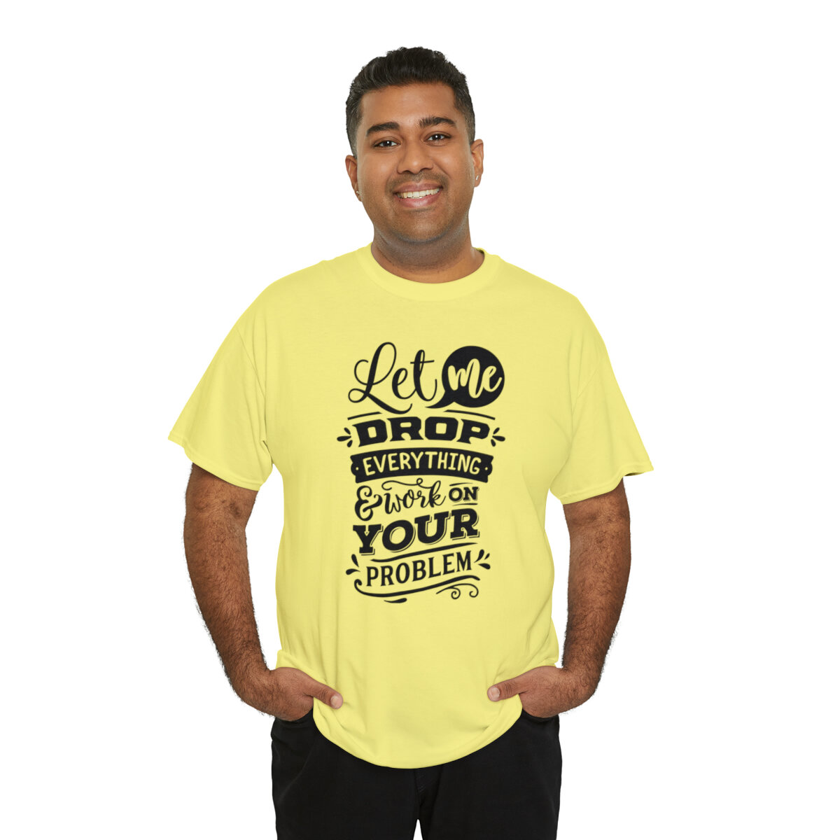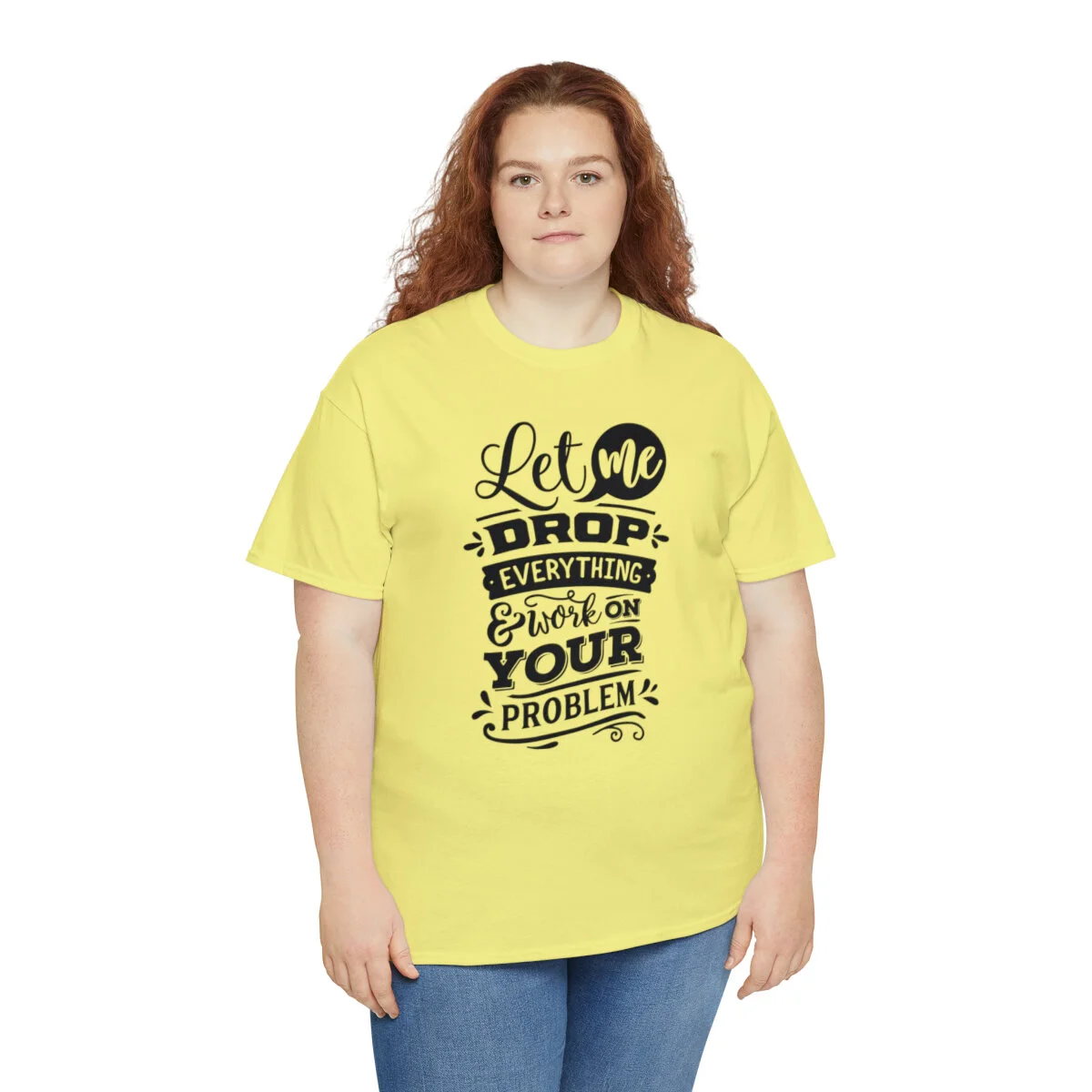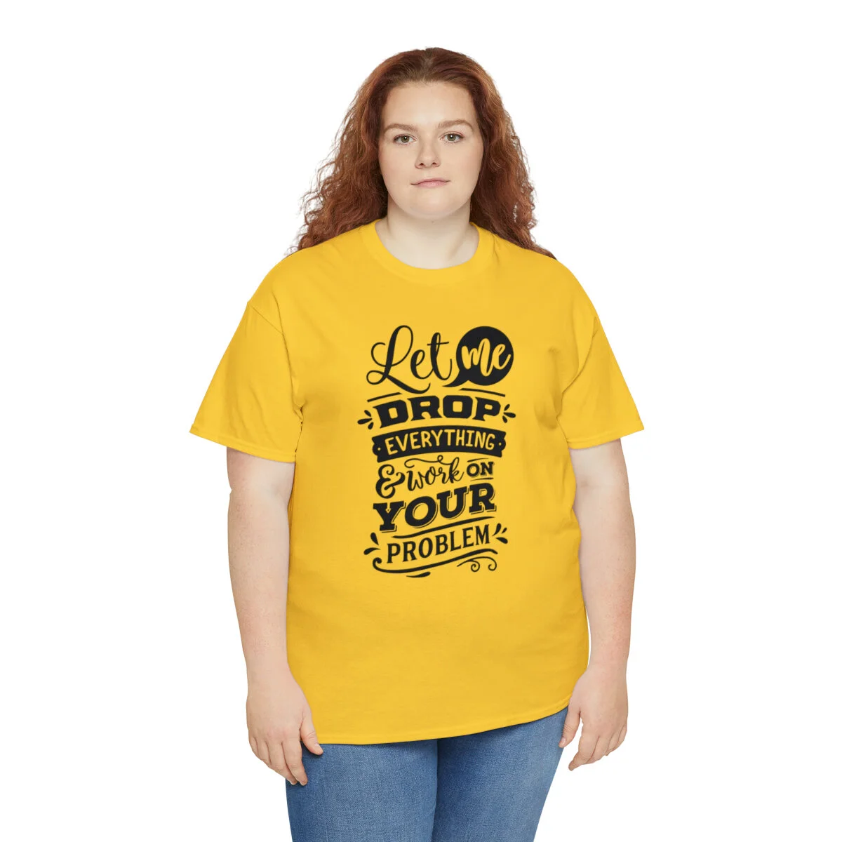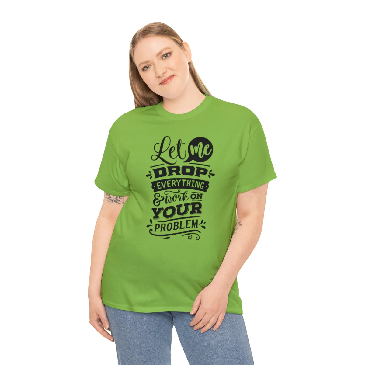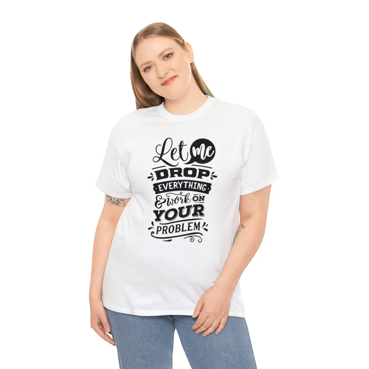 Crafted with care, this t-shirt is made from high-quality fabric to ensure exceptional comfort and durability. The design features the clever phrase, "Let me drop everything and work on your problem," elegantly displayed in multiple colors. Choose from a variety of vibrant options, including red, blue, yellow, or classic black and white, to find the hue that best matches your style and personality.